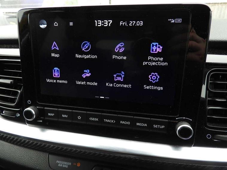 4.2" supervision colour cluster display, 8" touchscreen navigation, Apple car play/Android Auto with voice control, Blind spot collision warning, Cruise control + speed limiter, Drive mode selector, Electric power steering, Emergency call service, Emergency stop signalling system, External temperature display, Forward Collision-Avoidance Assist (FCA) - City/Pedestrian/Cyclist, Front parking sensors, Intelligent speed limit warning, Lane keeping assist system (LKAS), Driver attention warning (DAW) and High beam assist (HBA), Rear parking sensor, Reversing camera system, Trip computer, Intelligent Stop and Go, Audio system with 6 speakers, Bluetooth with music streaming, Front USB port, Steering wheel mounted controls, All round electric windows with drivers auto up/down function, Auto dimming rear view mirror, Automatic defog system, Automatic headlights control, Black rear roof spoiler with high mounted LED braking light, Black side sill, door garnish and wheel arch trims, Black/body colour bumpers, Body coloured exterior door handles, Chrome side window trim, Electrically adjustable/heated/folding door mirrors with LED indicators, Front and rear silver skid plates, Gloss black door mirrors with matt black lower housing, GT-Line body kit, Headlight levelling device, Heated rear window, High gloss black and satin radiator grille, LED Bi-function projection headlights with static bending, LED daytime running lights, LED front fog lights, LED position light, LED rear combination lights, Privacy glass - Rear windows and tailgate, Rain sensing front wipers, Rear fog lights, Rear side wing doors, Rear wash/wipe, Roof rails, Shark fin antenna, Solar windshield glass, Speed variable front aeroblade wipers, Tinted glass, Welcome and follow-me home light functionality, Windscreen Washer Level Warning, 12V power point front, 3 seat bench in 2nd row, 60/40 split folding rear seat, Air filter, All-round height adjustable headrests, Aluminium pedals, Automatic air conditioning, Centre armrest storage box, Centre console with cupholders, D-Cut perforated leather trimmed steering wheel, Dash illumination dimmer switch, Driver's seat height adjuster, Front and centre cabin lights, Front and rear door map pockets with bottle holder, Gear shift indicator, Glovebox illumination, GT-Line cloth/faux leather upholstery, Heated front seats, Heated steering wheel, ISOFIX Child seat top tethers and anchor fixings outer rear seats, Leather trimmed gearshift, Luggage area light, Luggage area parcel shelf, Luggage net, Luggage net with hooks, Overhead console lamp, Overhead console with sunglasses cases, Passenger front seatback pockets, Passenger seat height adjuster, Rear USB charging port, Satin chrome interior door handles, Single front passenger seat, Sunvisors with vanity mirror illumination (Driver and front passenger), Tilt/telescopic adjustable steering wheel, ABS with Electronic Brakeforce Distribution (EBD) and Brake Assist System (BAS), All round 3-point seatbelts, Electronic stability control (ESC) and vehicle stability management (VSM), Front passenger airbag cut-off switch, Front seatbelt pretensioners + load limiters, Height adjustable front seatbelts, Hill start assist control (HAC), Impact sensing auto door unlocking, Manual child lock in rear doors, Rear seat Occupancy alert, Seatbelt reminder warning, Twin curtain airbags, Twin front airbags, Twin front side airbags, Tyre pressure monitoring system, Alarm system, Door deadlocks, Engine immobiliser, Locking wheel nuts, Smart key with engine start/stop button, Speed sensitive auto door locking, Visible vehicle identification number, High gloss black centre fascia, 17" GT-Line alloy wheels, Tyre mobility kit,