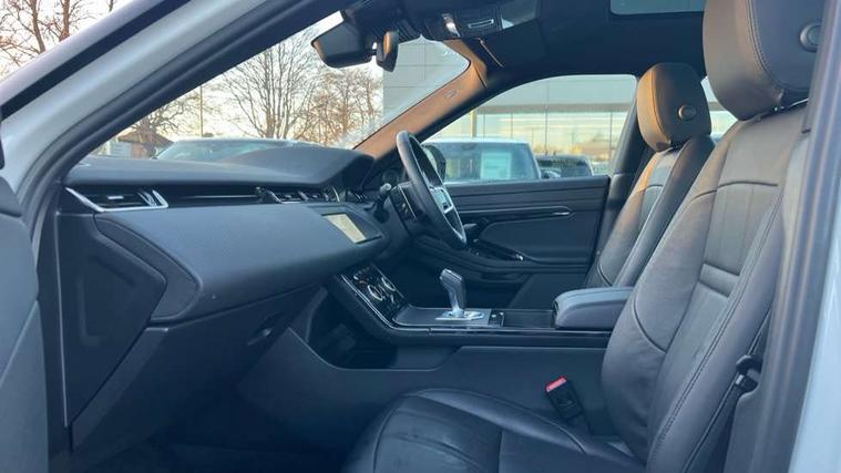 Android Auto, Apple car play, Bluetooth connectivity, Brake pad wear indicator warning light, Cruise control + speed limiter, Driver condition monitor, eCall emergency system, Electronic power assisted steering (EPAS), Front and rear parking aid, InControl remote, Land Rover InControl apps, Lane keep assist, Pivi pro connected includes upgraded infotainment, connected navigation pro, Nuance speech licence, Push button starter, Traffic sign recognition with adaptive speed limiter, Voice control system, All terrain progress control, Efficient Driveline, Passive suspension, Terrain Response 2 Auto, Digital Audio Broadcast radio-DAB, Steering wheel mounted controls, Auto headlights, Daytime running lights, Electric windows with one touch open/close and anti trap, Evoque and R-Dynamic badge, Flush deployable exterior door handles, Heated rear window with timer, Heated washer jets, Heated windscreen, Power fold, auto-dimming, heated door mirrors with approach lights and auto dimming driver side, Rain sensing windscreen wipers, Rear fog lights, Rear side wing doors, Rear wiper, Tailgate spoiler, Third brake light, 40:20:40 split folding rear seats with centre headrest and armrest, Ambient interior lighting, Bright metal pedals, Isofix system on outer rear seats, Overhead lighting console, Overhead stowage for sunglasses, Passive front head restraints, Rear air vents, Rear centre headrest, Rear head restraints, Satin chrome gearshift paddles, Single passenger seat, Sunvisors with illuminated vanity mirrors, Twin sliding front centre armrest, 3 rear 3 point seatbelts, Anti-lock braking system (ABS), Customer configurable autolock, DSC - Dynamic Stability Control, Electronic brake force distribution, Electronic parking brake, Electronic traction control, Emergency braking, Front and rear seatbelt reminder, Hill descent control, Hill launch assist, Low traction launch, Power operated child locks, Roll stability control, Six airbags - Driver and passenger airbags/driver knee airbag/front side airbag and curtain airbags, Torque vectoring brake, Tyre pressure monitoring system, Alarm, Immobiliser, Intrusion sensor, Locking wheel nuts,