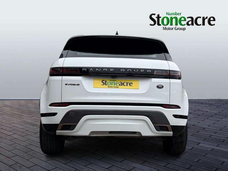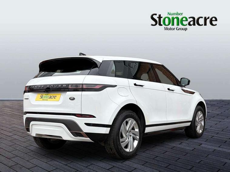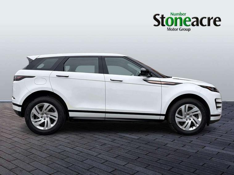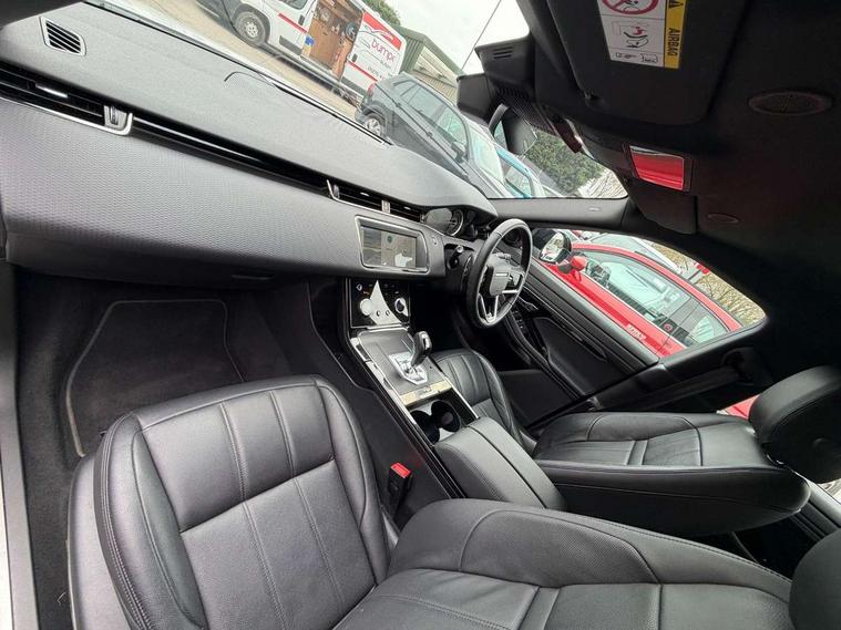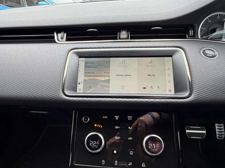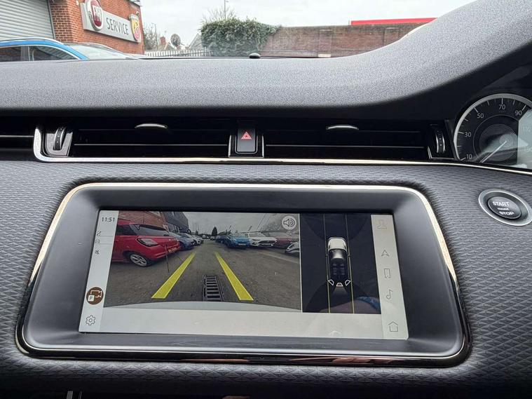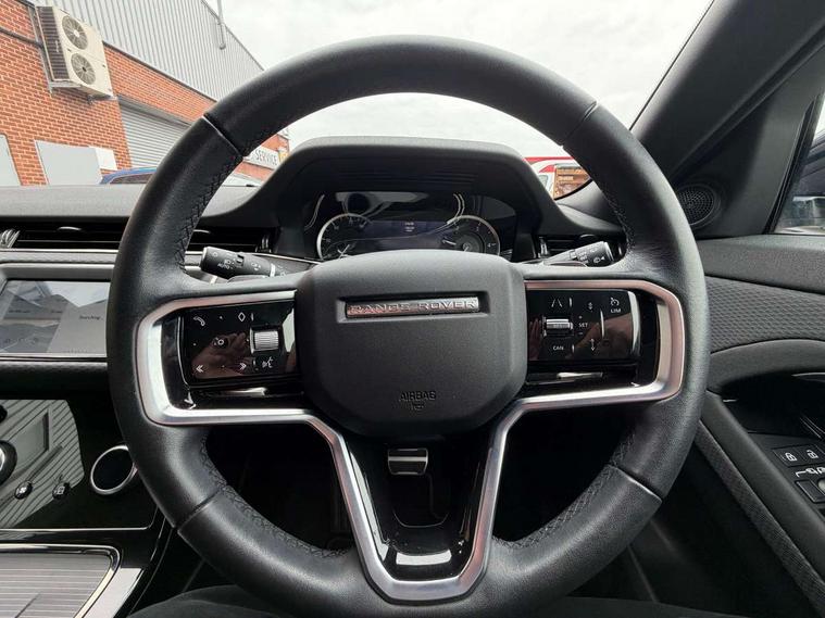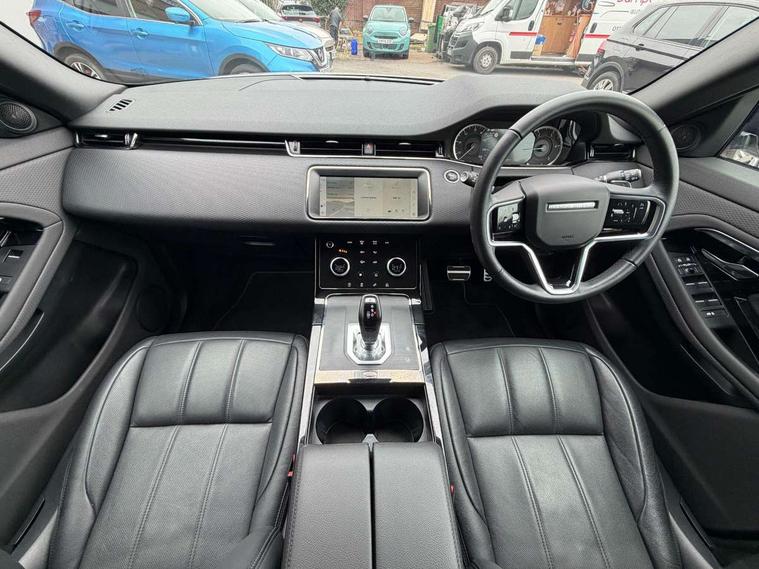 Android Auto, Apple car play, Bluetooth connectivity, Brake pad wear indicator warning light, Cruise control + speed limiter, Driver condition monitor, eCall emergency system, Electronic power assisted steering (EPAS), Front and rear parking aid, InControl remote, Land Rover InControl apps, Lane keep assist, Pivi pro connected includes upgraded infotainment, connected navigation pro, Nuance speech licence, Push button starter, Traffic sign recognition with adaptive speed limiter, Voice control system, All terrain progress control, Efficient Driveline, Passive suspension, Terrain Response 2 Auto, Digital Audio Broadcast radio-DAB, Steering wheel mounted controls, Auto headlights, Daytime running lights, Electric windows with one touch open/close and anti trap, Evoque and R-Dynamic badge, Flush deployable exterior door handles, Heated rear window with timer, Heated washer jets, Heated windscreen, Power fold, auto-dimming, heated door mirrors with approach lights and auto dimming driver side, Rain sensing windscreen wipers, Rear fog lights, Rear side wing doors, Rear wiper, Tailgate spoiler, Third brake light, 40:20:40 split folding rear seats with centre headrest and armrest, Ambient interior lighting, Bright metal pedals, Isofix system on outer rear seats, Overhead lighting console, Overhead stowage for sunglasses, Passive front head restraints, Rear air vents, Rear centre headrest, Rear head restraints, Satin chrome gearshift paddles, Single passenger seat, Sunvisors with illuminated vanity mirrors, Twin sliding front centre armrest, 3 rear 3 point seatbelts, Anti-lock braking system (ABS), Customer configurable autolock, DSC - Dynamic Stability Control, Electronic brake force distribution, Electronic parking brake, Electronic traction control, Emergency braking, Front and rear seatbelt reminder, Hill descent control, Hill launch assist, Low traction launch, Power operated child locks, Roll stability control, Six airbags - Driver and passenger airbags/driver knee airbag/front side airbag and curtain airbags, Torque vectoring brake, Tyre pressure monitoring system, Alarm, Immobiliser, Intrusion sensor, Locking wheel nuts,