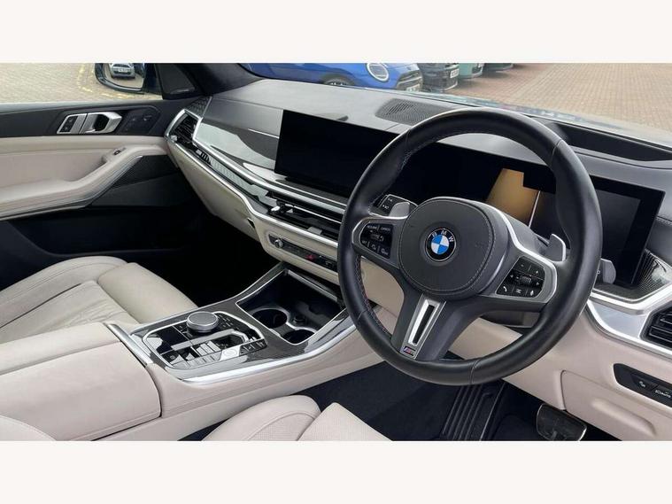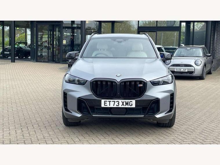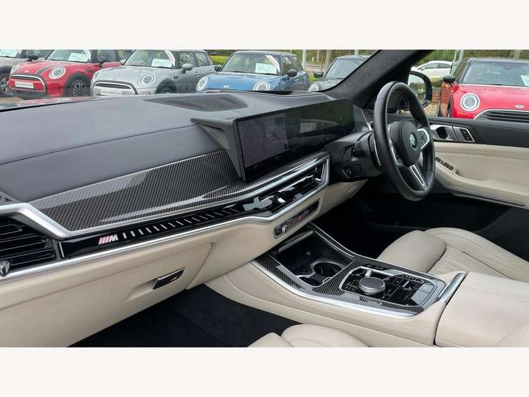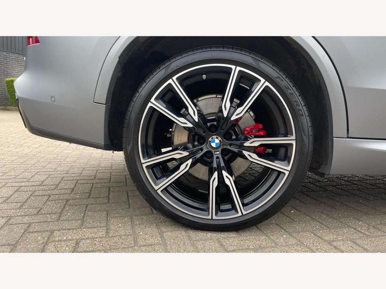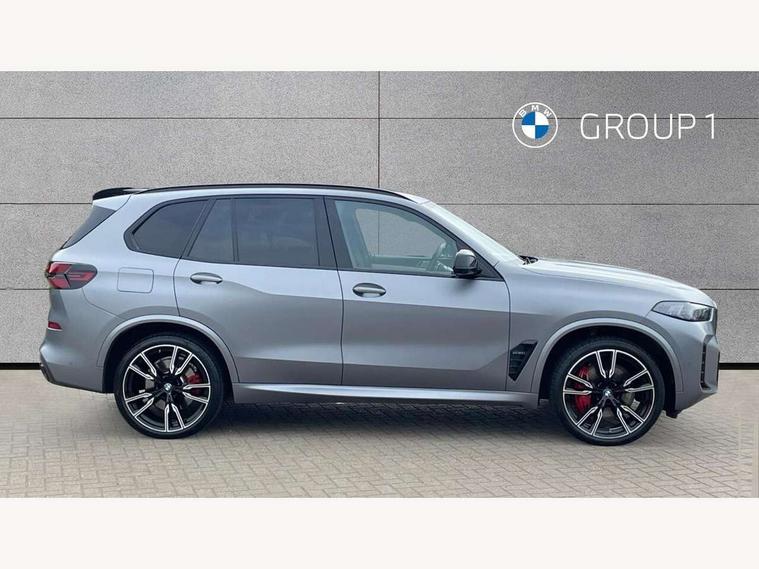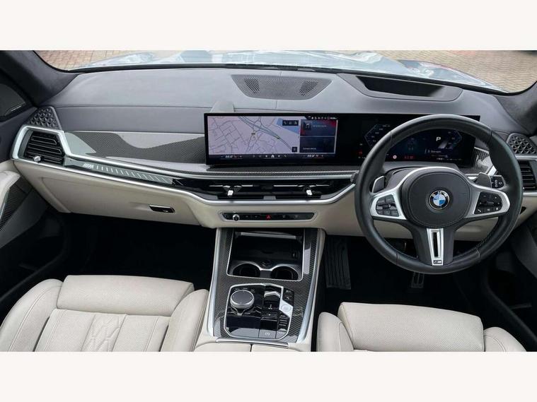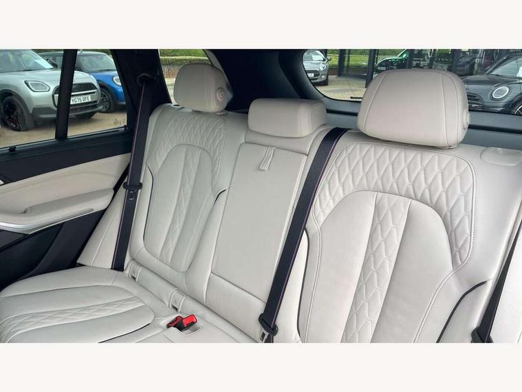 Attentiveness assist, Automatic tailgate operation, BMW ConnectedDrive online services, BMW live cockpit + with curved 12.3 instrument cluster/14.9 central display, nav/Tuner with diversity reception, RDS/4GLTE/remote software upgrade, BMW Recovery system, BMW Teleservices, Condition based service, Cruise control with brake assist, eCall emergency call system, Enhanced bluetooth with wireless charging, Integral active steering, Integrated owner's handbook, Speed limiter, Wi-Fi hotspot, Drive performance control with ECO PRO comfort + sport mode, Eight speed steptronic sport automatic transmission and gearshift paddles on the steering wheel, M Sport differential, Personal eSim, Adaptive LED Headlights, BMW Individual high gloss shadow line with extended contents, BMW individual lights shadow line, Front and rear electric windows, High beam assistant, High gloss black shadow line roof rails, LED daytime running lights, M Sport exhaust system, Rain sensor, Rear side wing doors, Sun protection glass, Third brake light in rear spoiler, Variable intermittent rear wash/wipe, 12V - Power sockets with 2x centre console and 1x luggage compartment, 3 seat bench in 2nd row, Foldable rear centre armrest with 2 cupholders and storage compartment, Front and rear side armrest integrated into door trim, Headrests for all seats, Luggage compartment separating net, Single front passenger seat, Three spoke sport M leather steering wheel, Velour floormats, Ambient light interior pack - X5, Driving assistant pack with radar based driver assistance system - X5, Expanded exterior mirror pack - X5/X5 M, M aerodynamics pack - X5, 3 rear seatbelts, Active protection, Airbags - driver/front passenger, rear and side, first and second row seats head airbags, front passenger seat airbag deactivation + knee airbag, Anti-lock braking system (ABS), Automatic Stability Control (ASC), Brake energy regeneration, Cornering brake control (CBC), Crash sensor activating central locking release, hazard warning lights, fuel cut off, interior lighting + activation of safety battery terminal clamp, DSC - Dynamic Stability Control, Dynamic Traction Control - DTC, Electromechanical parking brake with automatic drive away release and auto hold function, Electronic brake force distribution, Hill start assistant, M sport seatbelt, Mechanical child proof lock on rear doors, Tyre pressure monitoring system, Tyre pressure sensors, Ventilated front and rear disc brakes, Warning triangle and first aid kit, Alarm system, Closing system with central locking, Comfort access system, Locking wheel bolts, Run flat tyres,
