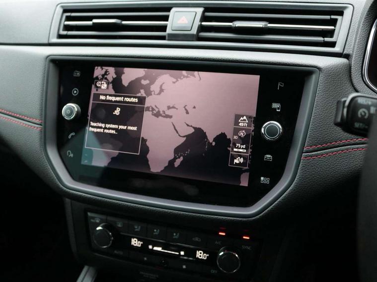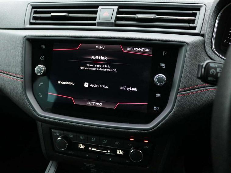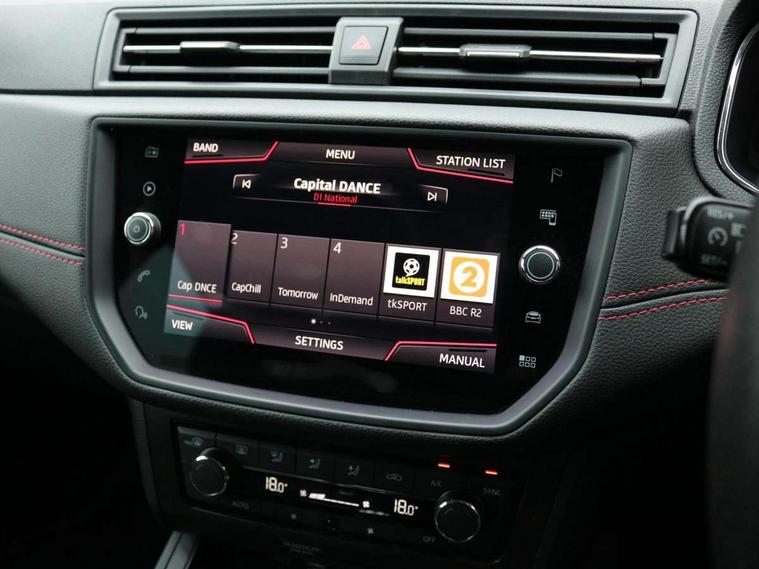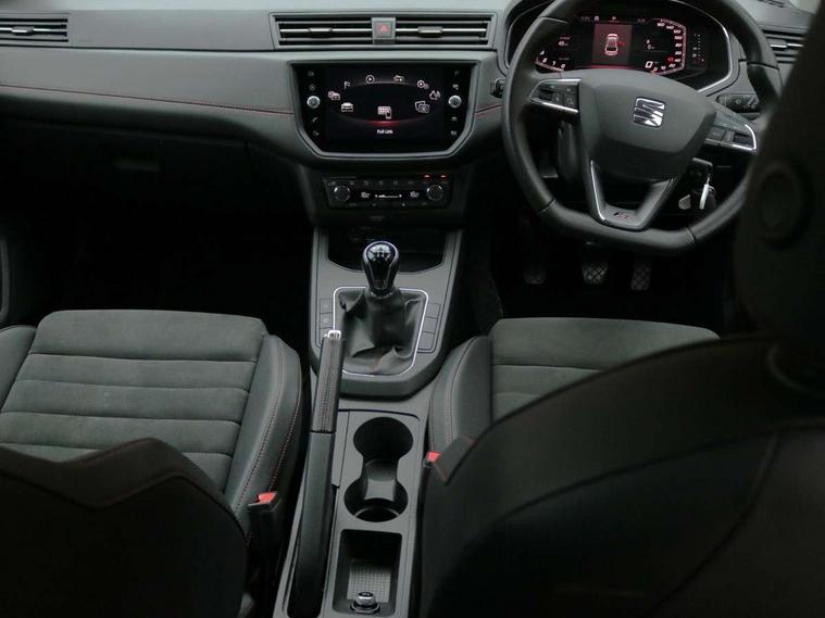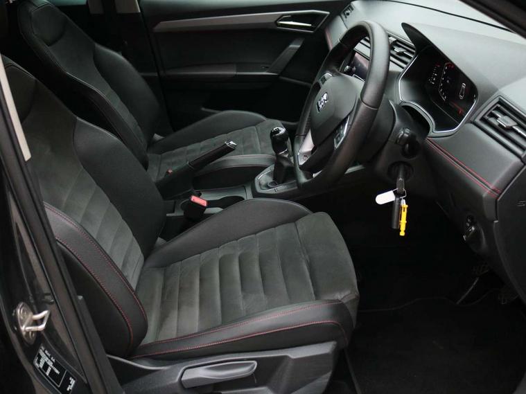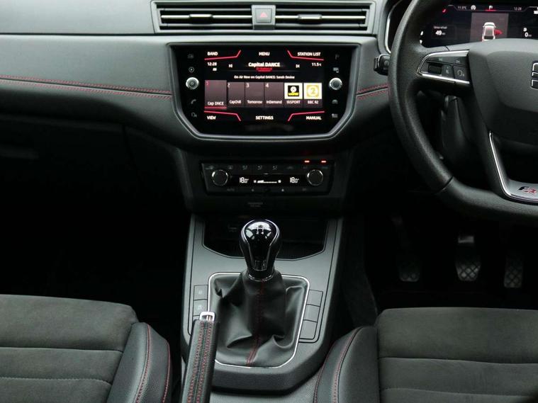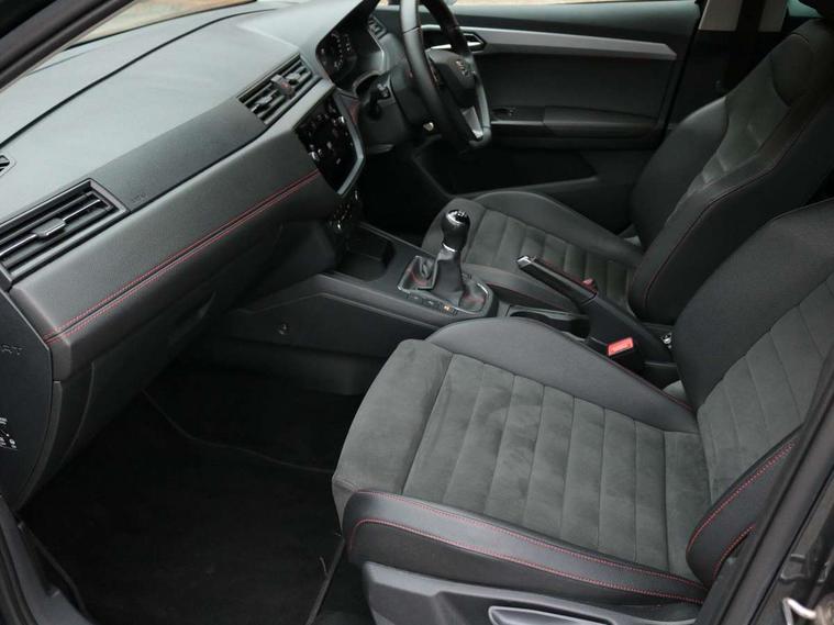 'Lights On' Reminder warning buzzer, Bluetooth Handsfree Phone Connection, Cruise control, Digital clock, Digital cockpit, Full Link Smartphone Integration with Mirror Link, Apple Car Play, Google Android Auto, Low fuel warning light, Outside temperature gauge, Power Steering, Satellite navigation system with 3D mapping, 8" touch screen, voice control and additional USB port, SEAT Drive profile, SEAT logo boot release, Trip computer, Sports suspension, 6 speakers, Auxiliary input socket, CD player, Digital Audio Broadcast (DAB) Tuner, Radio/MP3 player, SD card slot, SEAT USB media cable, Steering wheel mounted controls, USB port, Anti theft roof antenna, Auto dimming rear view mirror, Automatic headlights, Automatic rain sensing wipers, Body colour bumpers, Body colour door handles, Brilliant black door mirrors, Chrome front grille frame, Chrome grille, Coming/leaving home lighting function, Cornering front fog lights, Dark tinted rear windows, Electric folding door mirrors, Electric front windows, Electric headlight adjustment, Electrically adjustable and heated door mirrors, Exclusive FR rear bumper, Full LED headlights, LED daytime running lights, LED tail lights, Rear fog lights, Twin exhaust pipes, 3 rear headrests, 60/40 split folding rear seat, Door and steering wheel ice metal decorative inserts, Driver's sunvisor with ticket holder/vanity mirror, Dual zone climate control, Dust/pollen filter, Flat bottomed perforated leather steering wheel with red stitching and FR logo, Front courtesy lights, Front cupholders x 2, Front reading lights, Gear shift indicator, Glovebox, Height adjustable driver's seat, Height adjustable front/rear head restraints, Height adjustable passenger seat, Height/reach adjust steering wheel, Illuminated boot, Instrument lighting with brightness control, Leather dashboard, Leather handbrake, Microsuede cloth upholstery, Multi-colour ambient interior lighting, Passenger sunvisor, Rear top tether child seat ISOFIX attachment, Sports seats, Full LED headlight pack - Ibiza, 3 point seatbelts on all 3 rear seats, ABS, Active front headrests, Child locks on rear doors, Curtain airbags, Driver/Front Passenger airbags, ESP+EBA, Front assist (AEB), Front passenger airbag deactivation, Front side airbags, Hill hold control, Multi-Collision braking, Seatbelt warning, Tiredness recognition system, Tyre pressure monitoring system, Electronic engine immobiliser, Locking wheel bolts, Remote central locking + deadlocks, Volumetric alarm with back up horn, 18" Performance machined bi-colour alloy wheels,