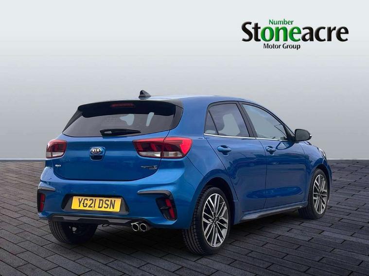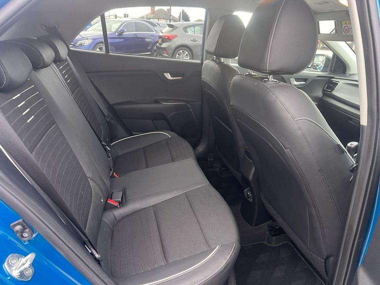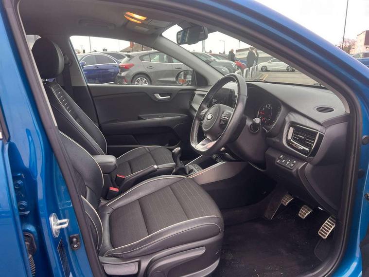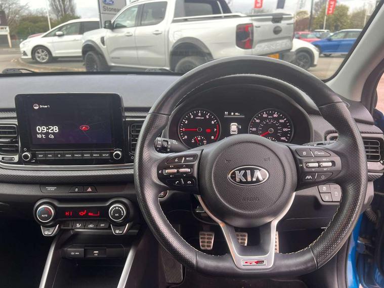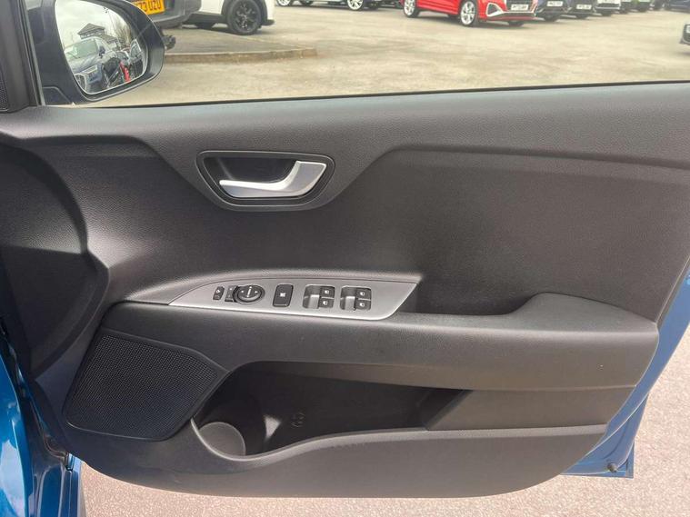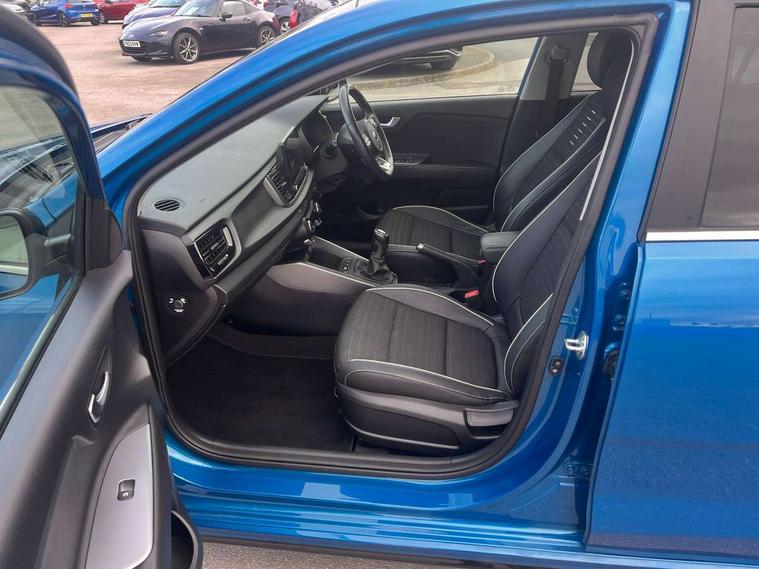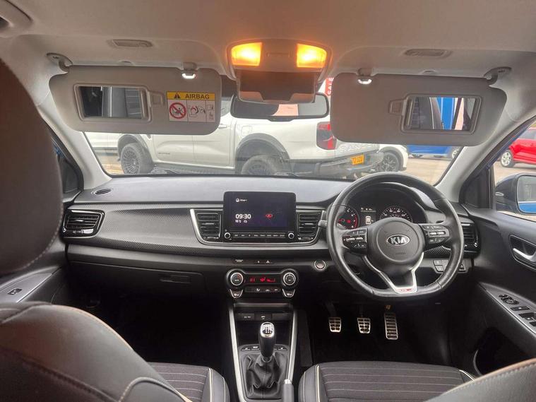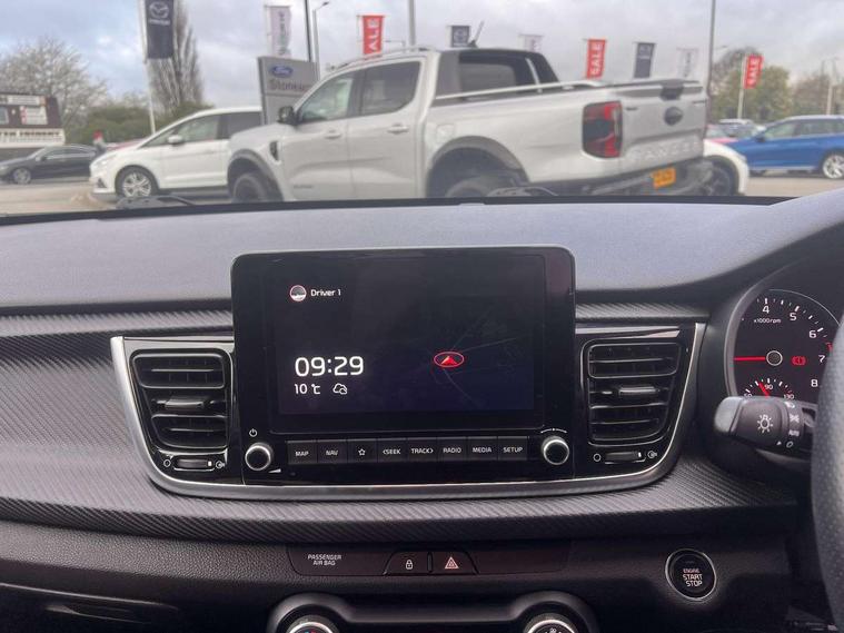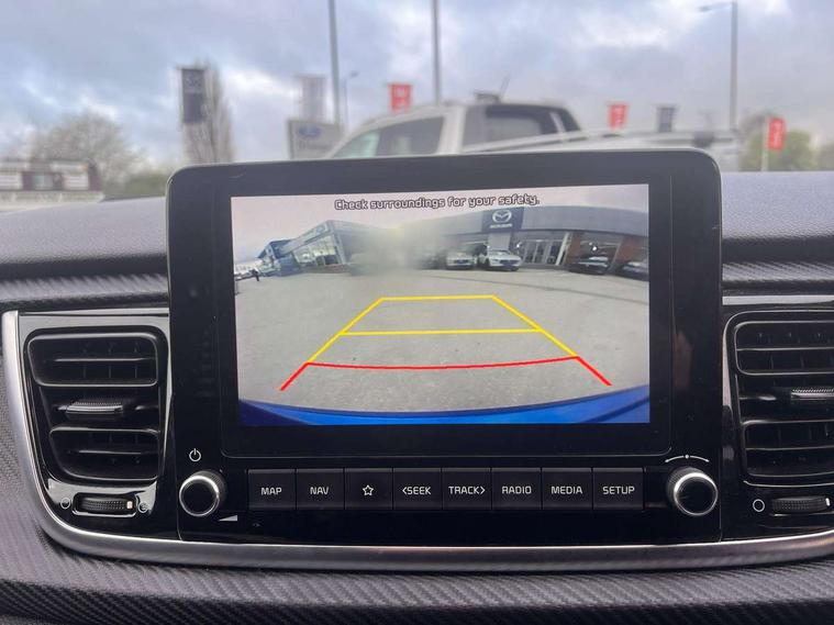 8" touchscreen navigation, Apple car play/Android Auto, Blind spot collision warning, Cruise control + speed limiter, Digital clock, Drive mode selector, Electric power steering, Emergency stop signalling system, Front parking sensor, Gear selection indicator, Manual speed limit assist (MLSA), Outside temperature display, Rear parking sensor, Reversing camera system with dynamic guidelines (Integrated into centre fascia screen), Tachometer, Trip computer, UVO connect, Voice control system, Windscreen washer level indicator, Intelligent Stop and Go, 6 speakers, Bluetooth connectivity including audio streaming, DAB Digital radio, Front USB port for media connection, Rear USB port, Steering wheel mounted audio controls, Aeroblade-type front wipers, Auto dimming rear view mirror, Automatic defog system, Automatic lighting control, Bi-function projection headlights, Body colour door handles, Chrome side window trim, Cornering light, Electric adjustable/heated/folding door mirrors, Front electric windows with driver's auto up/down function, Gloss black and dark chrome surround radiator grille, Headlamp levelling, Heated rear window, High gloss black door mirrors, High Gloss Black rear spoiler, LED "Ice-Cube" Front Fog Lights, LED daytime running lights, LED indicators in door mirrors, LED rear fog light, Privacy glass (Rear Windows and Tailgate), Projection headlights, Rain sensing front wipers, Rear electric windows, Rear wash/wipe, Speed variable front wipers, Sports front bumper, Sports rear bumper, Tinted glass, Twin exhaust pipes, Welcome home function, 3 passenger assist grips, 60/40 split/folding 2nd row of seats, All round height adjustable headrests, Automatic air conditioning, Centre Console with Storage Box and Sliding Armrest, Cloth/faux leather upholstery with grey stitching, Dash illumination dimmer switch, Driver's seat height adjuster, Driver/passenger sunvisors and illuminated vanity mirrors, Front and rear door map pockets with bottle holder, Front passenger seatback pockets, Front USB charger port and 12V socket, Heated front seats, Heated steering wheel, ISOFIX top tethers and lower anchor points, Leather D cut steering wheel, Leather trimmed gearshift, Load area light, Luggage area parcel shelf, Luggage hooks, Metal pedals, Overhead console with sunglasses holder, Satin chrome interior door handles, Tilt/telescopic adjustable steering wheel, Advanced driving assistance pack - Rio, 3-point front seatbelts, 3x3 point rear seatbelts, ABS with Electronic Brakeforce Distribution (EBD) and Brake Assist System (BAS), Automatic unlocking of doors in case of impact, Cornering brake control (CBC) and Straight line stability (SLS), Electronic stability control (ESC) and vehicle stability management (VSM), Front seatbelt pretensioners + load limiters, Height adjustable front seatbelt anchors, Hill start assist control (HAC), Passenger airbag deactivate switch, Rear child proof door locks, Seatbelt warning, Traction control, Twin curtain airbags, Twin front airbags, Twin front side airbags, Tyre pressure monitoring system, Anti theft alarm, Deadlocking system, Engine immobiliser, Locking wheel nuts, Smart key with engine start/stop button, Speed sensitive auto door locking, Visible vehicle identification number, Carbon Fascia Trim, 17" Alloy wheels, Tyre mobility system,
