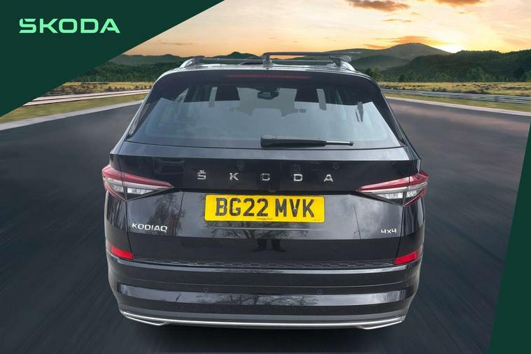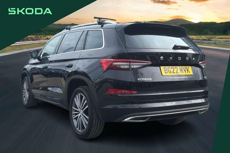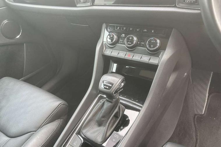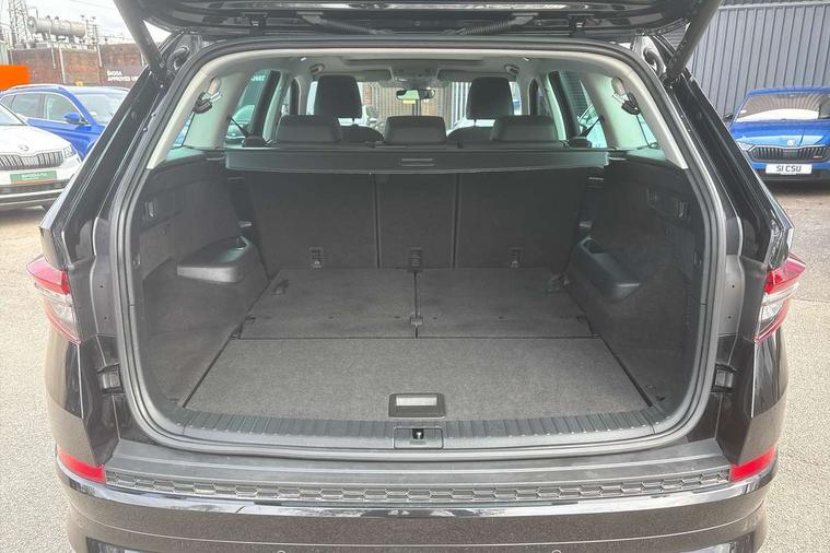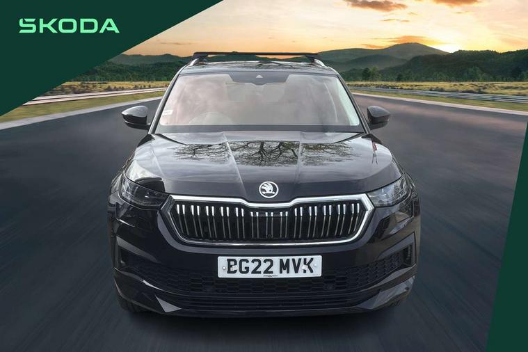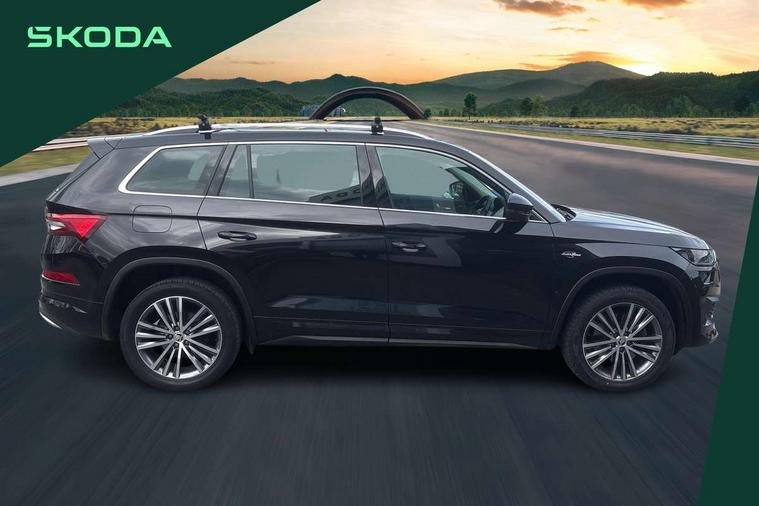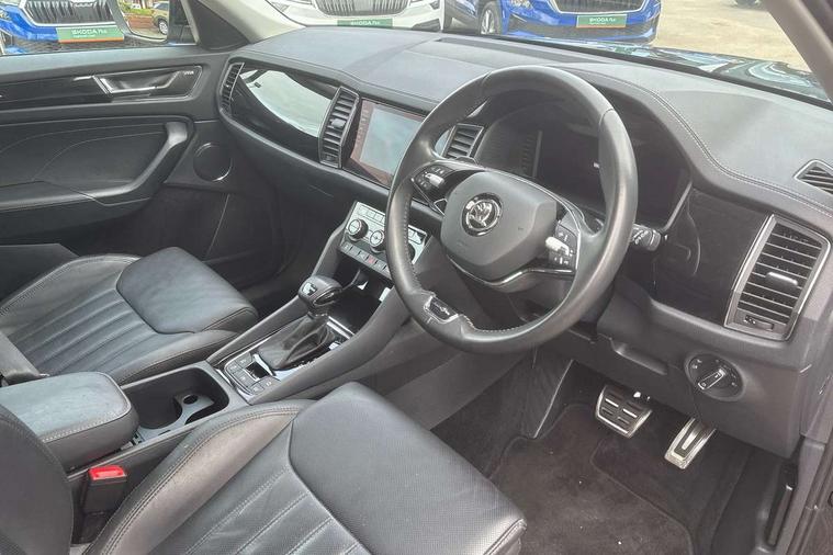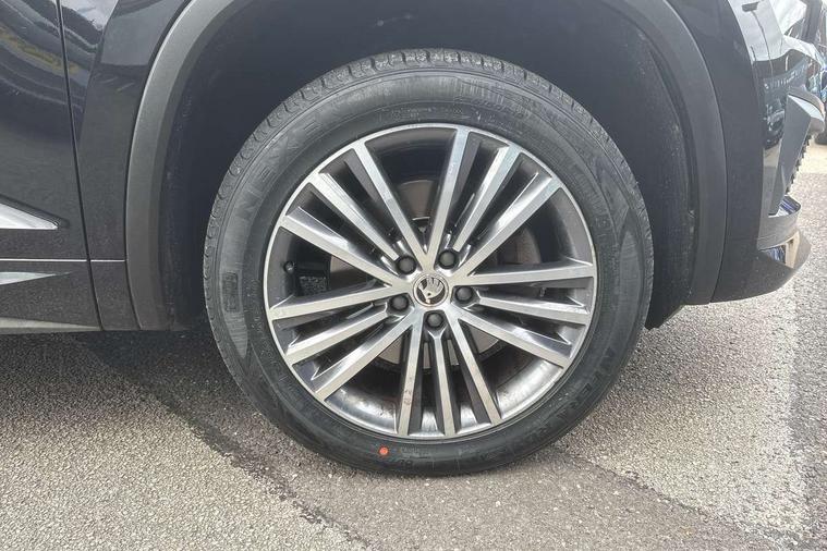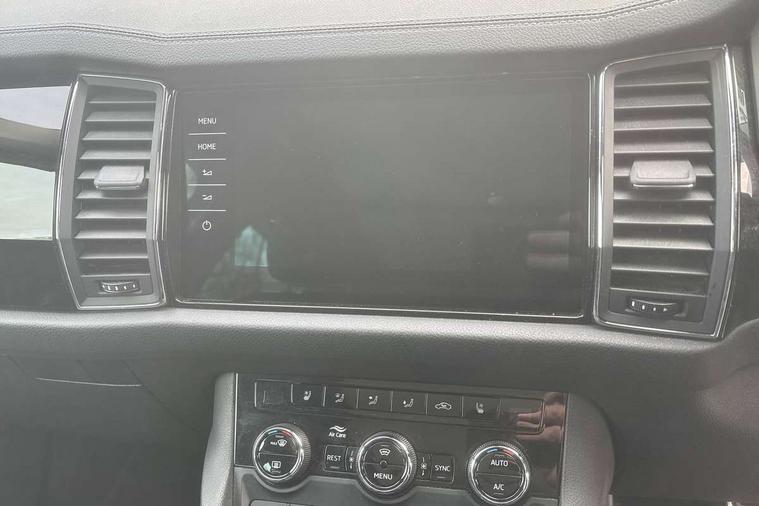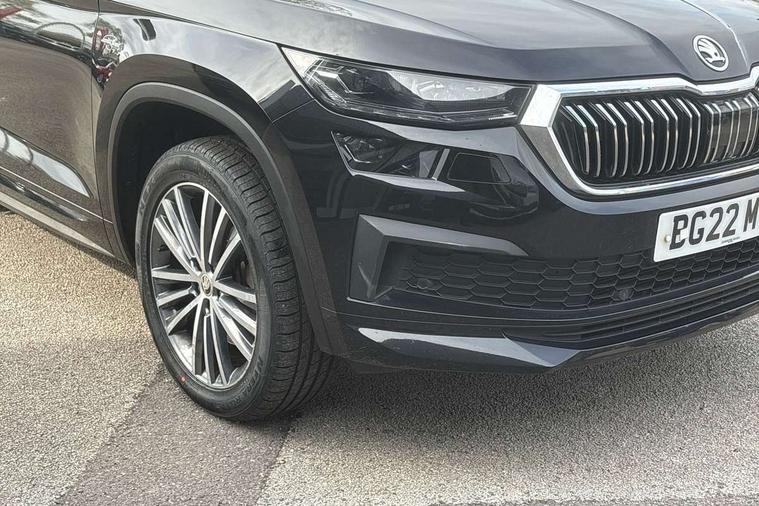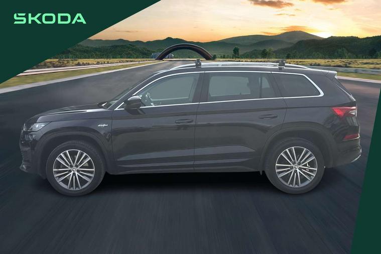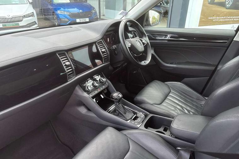 Area view, Blind spot detection system, Bluetooth system, Columbus satellite navigation with 9.2" touchscreen, integrated Wi-Fi, web radio, Digital voice enhancement, E-call, ECO Stop/start function, Exterior temperature indicator, Progressive steering, Smartlink wireless for apple carplay and wired for android auto, Speed limiter, Tailgate unlocking from outside, USB C Port x 2 in front centre console, Virtual Cockpit - 10.25" digital display, Wireless charging, Canton sound system, DAB Digital radio, Aero front windscreen wipers with intermittent function, Aero rear window wiper, Auto dimming rear view mirror, Black wheel arch surrounds, Body colour bumpers, Body colour door mirrors and handles, Body colour door panels, Chrome front grille, Chrome roof rails with chrome window surround, Electric adjustable/heated/folding door mirrors, driver side auto dimming with boarding sports and memory function, Electric front and rear windows, Extended rear spoiler with finlets in gloss black, Front fog lights, Full LED matrix headlights with AFS (adaptive front light system), cornering function and AWL (all weather lighting system), Headlight washers, Heated rear window, Invisible tailpipe, L&K front and rear bumpers including lower rear chrome strip, LED daytime running lights, LED rear fog light, LED third brake light in rear spoiler, Light assistant (coming/leaving home/tunnel light), Off-road style lower front bumper element, Panoramic sunroof, Privacy glass, Rain and light sensors, Rear LED lights (high functionality) with welcome effect and dynamic indicators, Rear side wing doors, Safety reflectors on front and rear doors, Window control switches with black trim, Without engine designation, 12V socket in boot, 2 rails with 2 hooks, 2 seat bench in 3rd row, 3 seat bench in 2nd row, 4 foldable roof handles with rear coat hooks, 60:40 foldable rear seat with sliding adjustment and backrest angle adjustment, Aluminium pedals, Bottle holders in door panel in the 1.5 litre front and 1 litre rear, Cargo storage compartments, Chrome headlight control button, Chrome interior door handles, Coat hooks on B pillar, Covered storage compartment on driver side, Front centre armrest with storage compartment, cup holder and 12V socket, Front courtesy lights, Gear shift lever with chrome frame and black gloss insert, Grey stitching in front and rear armrests and door armrests + door inserts, Height adjustable front headrests, Illuminated and cooled glovebox, Illuminated luggage compartment, Isofix child seat fittings in outer rear seats with top tether, Manually adjustable steering column, Net programme in boot (1x horizontal Net, 2x vertical Nets), Overhead glasses storage compartment, Pollen filter, Rear centre armrest with cupholders, Single front passenger seat, Sliding trunk cover, Small Bags on the inner sides of the front backrests, Sunvisors with illuminated vanity mirrors, Three rear height adjustable headrests, Ticket holder on A Pillar, Umbrella in door panel, Variable boot floor, LED Interior light pack - Kodiaq, Auto door release and activation of warning lights in the event of an accident, Child locks on rear doors, Driver and front passenger airbag with knee airbag and front passenger airbag deactivation, Electronic parking brake with hill start assist, Emergency rear braking signal, ESC (incl. ABS+MSR+ASR+EDS+HBA+DSR+RBS+MKB), Front assist with autonomous emergency braking, Front side airbags with curtain airbags, Fuel cut off safety device, Height adjustable front 3 point seatbelts + pretensioners, Hill hold control, Rear disc brakes, Safety vest holder in door, Seat belt reminder for all seats, Three point rear seat belts, Two tone horn, Tyre pressure monitor, Alarm with interior monitoring and tilt sensor with safe function, Anti-theft wheel bolts, Immobiliser, Keyless entry and start system (KESSY), Remote central locking with 2 keys, Grey stitching in dashboard, Piano black decorative inserts, Plaquette L&K front fenders, Temporary spare wheel (space saver),
