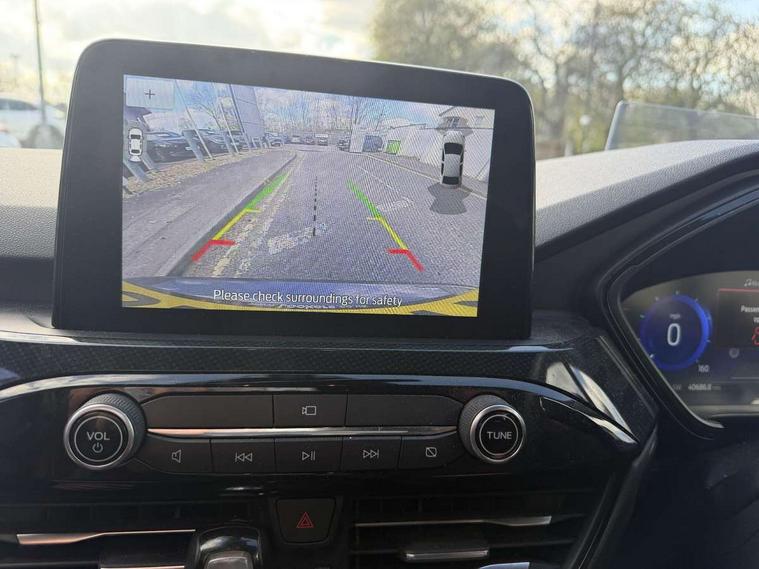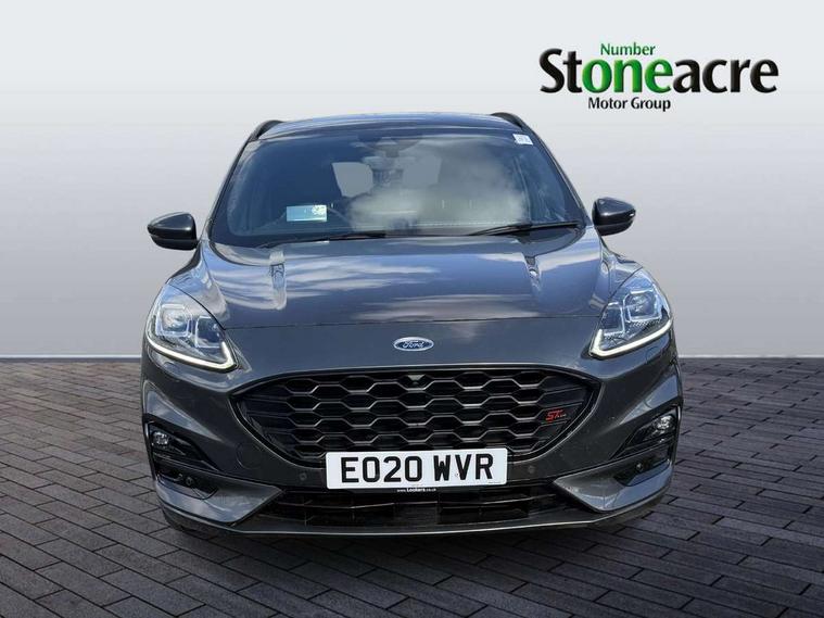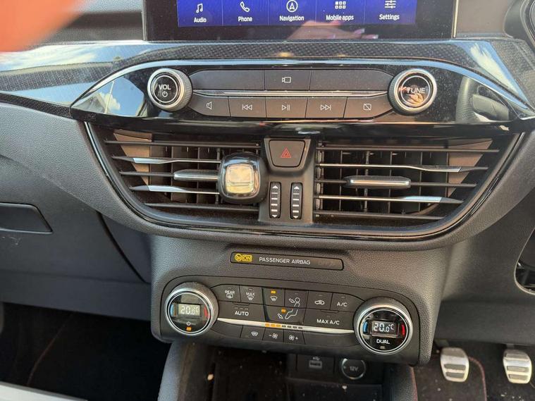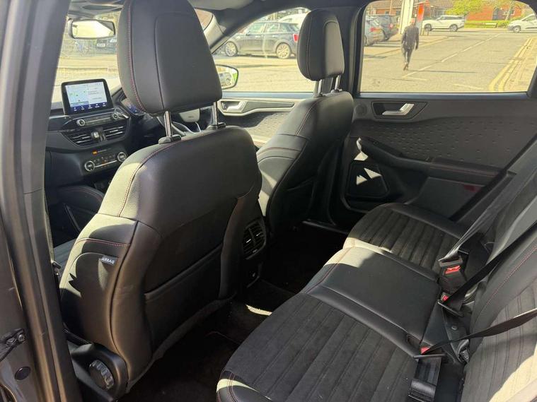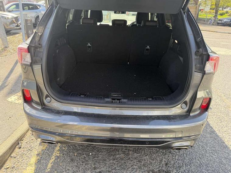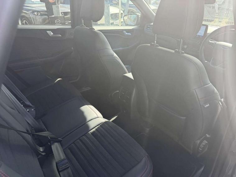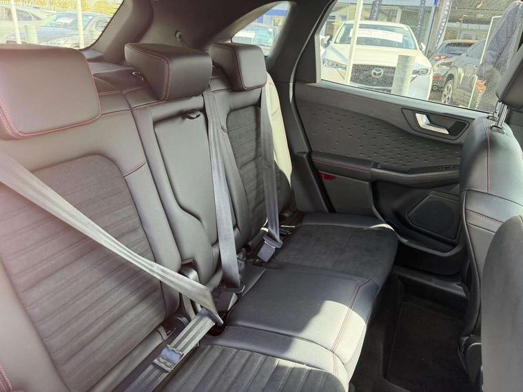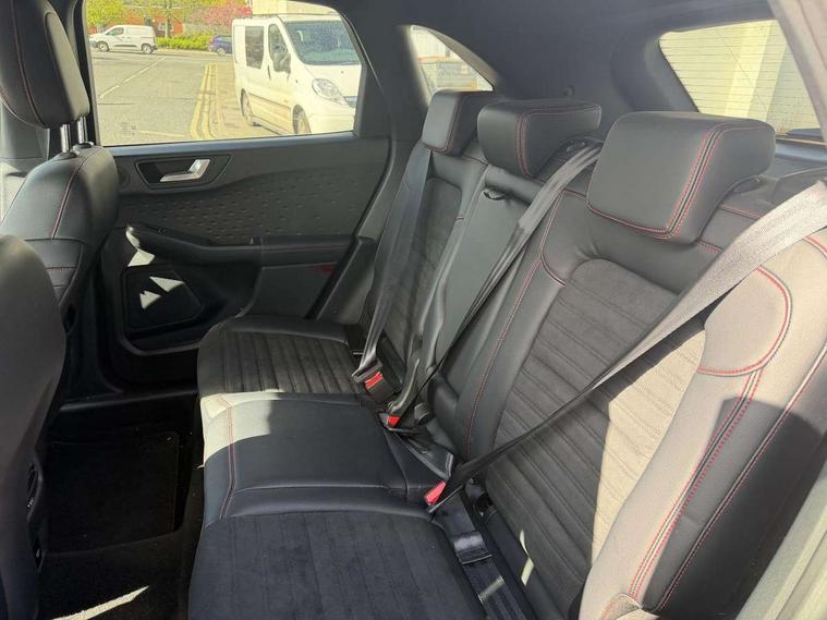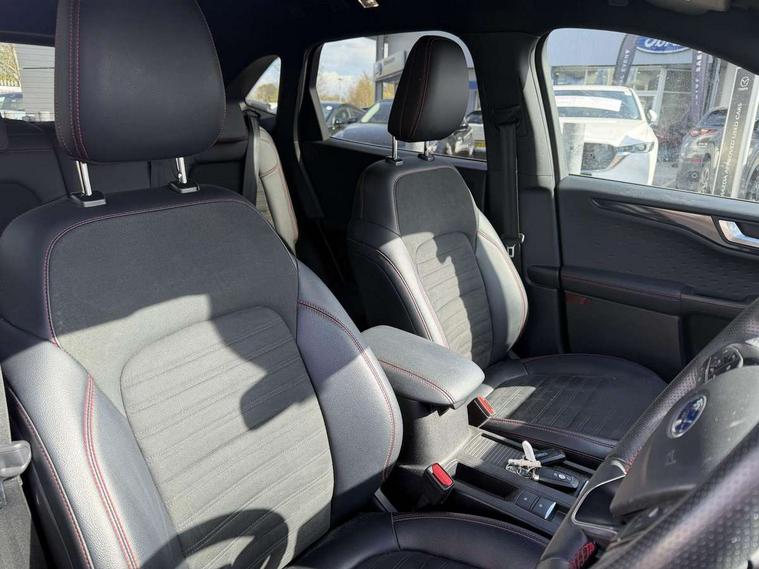 Adaptive cruise control (ACC) with traffic sign recognition, BLIS (Blind spot information system), Driver impairment monitor, Eco coaching, Enhanced parking assist system, Ford easy fuel, Front and rear parking sensors, Front and rear view camera, Hands free power tailgate, Head up Display, Intelligent speed assist, Lane keeping aid with lane departure warning, Mobile phone wireless charging pad, Power assist steering, Selectable drive modes, SYNC 3 with navigation, DAB audio, Sports suspension, Auto dimming rear view mirror, Auto headlamps with high and low beam, Auto wipers, Black roof rails, Door edge guards, Front LED fog lights with cornering function, Full LED quad projector headlamps with glare free, Headlamp washer jets, Large rear spoiler, LED daytime running lights, LED rear lights, Power folding heated door mirrors with puddle lights, Power front/rear windows with global close, Privacy glass, Quickclear heated windscreen, ST Line badges in exterior and interior, ST Line front scuff plates, Twin exhausts, 230V power convertor in second row, 2nd row sliding seats, 4 way manually adjustable passenger seat with height, reach, tilt, backrest and headrest, Alloy pedals, Ambient lighting, Centre console with electronic parking brake, Dark headlining and pillars, Dual electronic automatic temperature control, Flat bottomed leather steering wheel, Front and rear head restraints, Partial leather manual track seat, Salerno partial leather upholstery, Sports seats, ST Line front and rear floor mats, Unique ST Line leather gear knob, B&O with large instrument cluster pack - Kuga, ST Line body styling kit - Kuga, 3x3 point rear seatbelts, Airbags - front driver/passenger, front and rear curtain, Drivers knee airbag, Electronic stability control (ESC) and ABS, Ford MyKey Gen 2 safety system, Hill launch assist, Post collision braking, Powered child proof rear door locks with global closing, Pre collision assist with autonomous emergency braking, Red brake calipers, Tyre pressure monitoring system, Engine immobiliser, Keyless entry, Keyless start with 'Ford Power' starter button, Locking wheel nuts, Remote powered central double locking doors, Thatcham category 1 alarm, Tyre inflation kit,