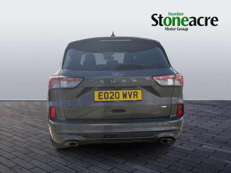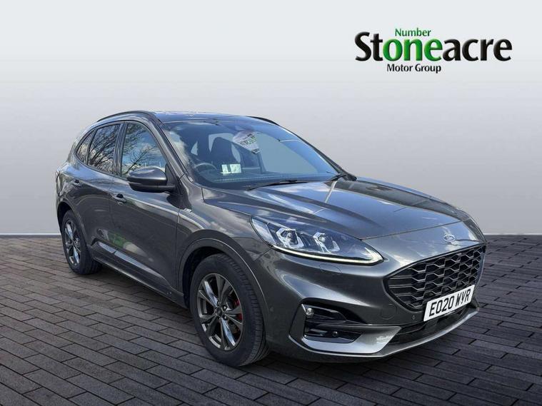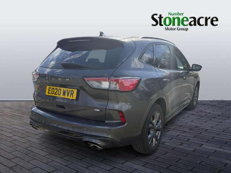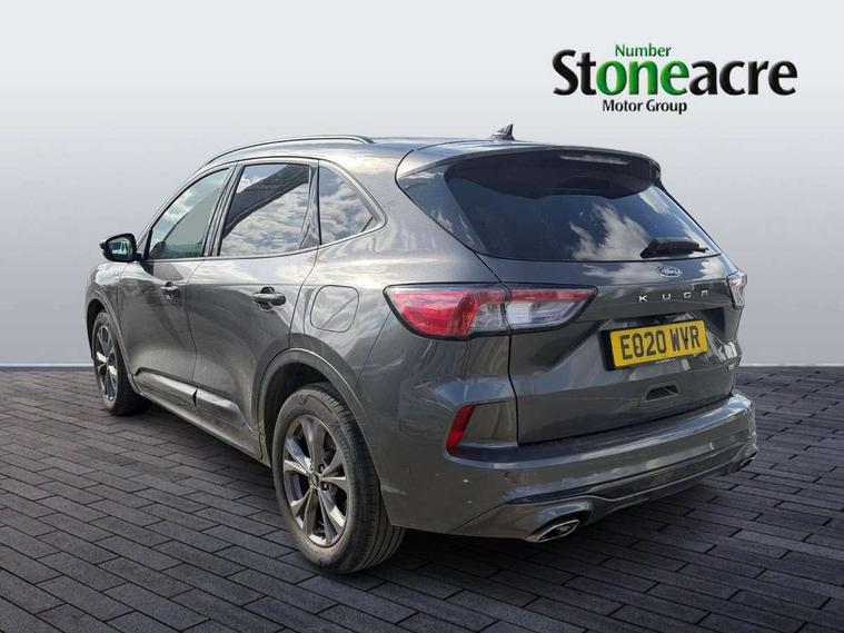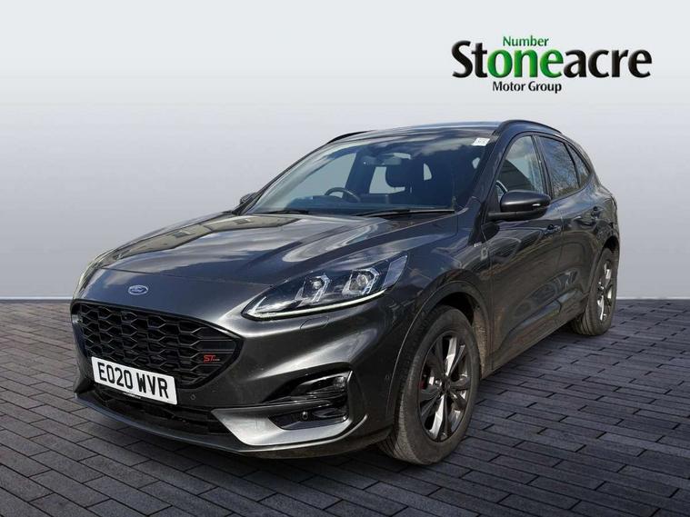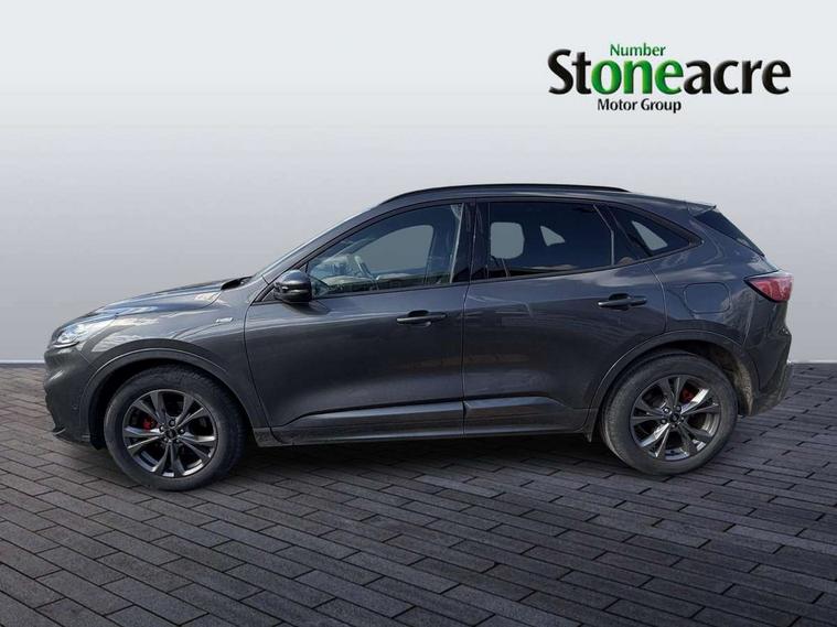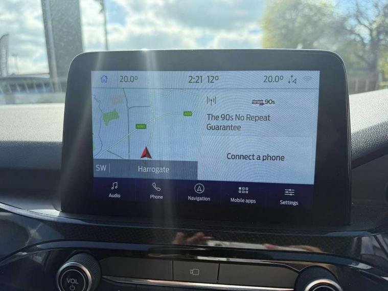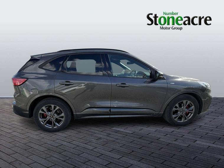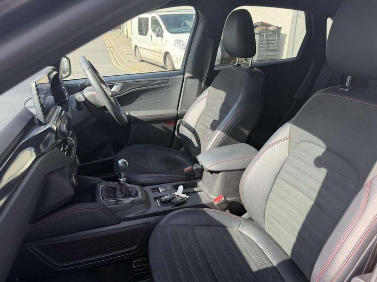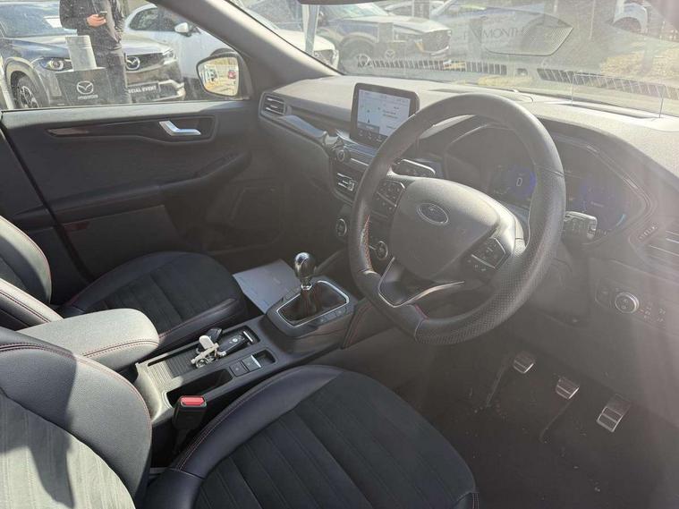 Adaptive cruise control (ACC) with traffic sign recognition, BLIS (Blind spot information system), Driver impairment monitor, Eco coaching, Enhanced parking assist system, Ford easy fuel, Front and rear parking sensors, Front and rear view camera, Hands free power tailgate, Head up Display, Intelligent speed assist, Lane keeping aid with lane departure warning, Mobile phone wireless charging pad, Power assist steering, Selectable drive modes, SYNC 3 with navigation, DAB audio, Sports suspension, Auto dimming rear view mirror, Auto headlamps with high and low beam, Auto wipers, Black roof rails, Door edge guards, Front LED fog lights with cornering function, Full LED quad projector headlamps with glare free, Headlamp washer jets, Large rear spoiler, LED daytime running lights, LED rear lights, Power folding heated door mirrors with puddle lights, Power front/rear windows with global close, Privacy glass, Quickclear heated windscreen, ST Line badges in exterior and interior, ST Line front scuff plates, Twin exhausts, 230V power convertor in second row, 2nd row sliding seats, 4 way manually adjustable passenger seat with height, reach, tilt, backrest and headrest, Alloy pedals, Ambient lighting, Centre console with electronic parking brake, Dark headlining and pillars, Dual electronic automatic temperature control, Flat bottomed leather steering wheel, Front and rear head restraints, Partial leather manual track seat, Salerno partial leather upholstery, Sports seats, ST Line front and rear floor mats, Unique ST Line leather gear knob, B&O with large instrument cluster pack - Kuga, ST Line body styling kit - Kuga, 3x3 point rear seatbelts, Airbags - front driver/passenger, front and rear curtain, Drivers knee airbag, Electronic stability control (ESC) and ABS, Ford MyKey Gen 2 safety system, Hill launch assist, Post collision braking, Powered child proof rear door locks with global closing, Pre collision assist with autonomous emergency braking, Red brake calipers, Tyre pressure monitoring system, Engine immobiliser, Keyless entry, Keyless start with 'Ford Power' starter button, Locking wheel nuts, Remote powered central double locking doors, Thatcham category 1 alarm, Tyre inflation kit,