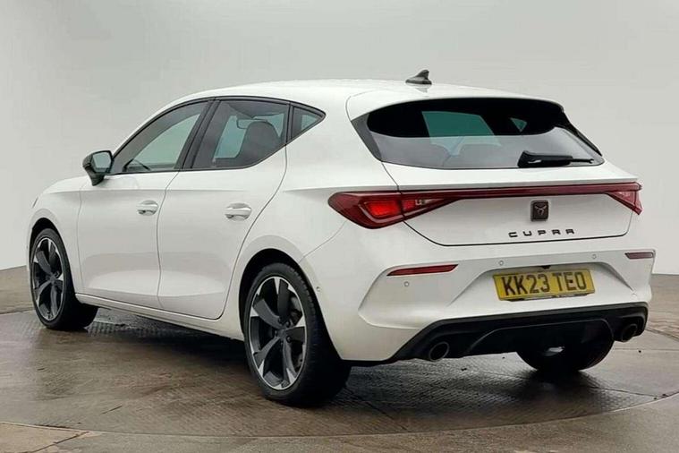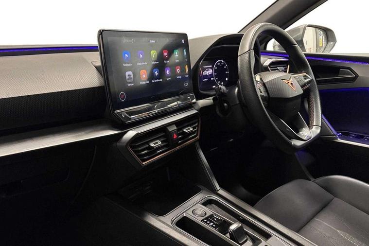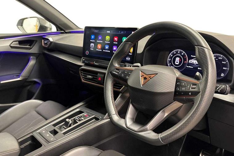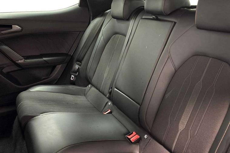 CUPRA drive profile selection with 4 modes (Comfort/Cupra/Sport/Individual), throttle response and gearshift mode, Digital cockpit, E-call, Electro mechanical speed sensitive power steering, Front assist with forward collision warning braking reaction to vehicles, pedestrians and cyclists, Full link smartphone integration with Mirror Link, wireless Apple CarPlay and wired Google Android Auto, Lane assist, Lockable tailgate, Park assist (inc front/rear parking sensors), Rear view camera, RPM, trip computer, outside temp gauge, instrument light brightness, low fuel warning light, lights on reminder, gearshift indicator, Service interval indicator, Start/stop system with regenerative braking, Sports suspension, XDS electronic differential lock and dynamic traction support, 7 speakers, Auxiliary input socket, Auto dimming rear view mirror, Body colour door handles, Body coloured bumpers, Cupra sports bumpers, Dark tinted rear windows, Electric front/rear windows, Electrically adjustable, heated and folding door mirrors, LED front fog lamps with cornering function, LED headlights with dynamic turn signals, tail lights, rear fog lights with rear coast to coast lighting, Rain sensing wipers, Rear diffuser with twin exhaust pipe on each side, Rear side wing doors, Rear wash/wipe, Separate daytime running light with automatic headlight control and coming home feature, Third brake light, 12v power supply in centre console, 3 seat bench in 2nd row, 5 headrests, 60/40 split rear bench seat with armrest, Ambient lighting (glovebox, footwell, ambient lighting multicoloured), Black headlining, CUPRA Leather flat bottomed, heated, perforated steering and gearshift paddles, Cupra sports pedals, Driver/passenger manual seat height adjustment, Dust/pollen filter, Folding boot cover, Four x USB Type C ports, Front and rear reading lights X 4, Front centre armrest, Front seats manual lumbar adjustment, Height/reach adjust steering wheel, Illuminated interior front door sills, Interior wraparound lighting, ISOFIX points in outer rear seats with top tether anchorage points, Jack and tool kit, Luggage tie-down hooks, PVC/Cloth upholstery with copper stitching + Cupra embossed logo on headrest, Single front passenger seat, Sports bucket seats, Storage pockets on rear of front seats, Sunvisors with illuminated mirror, Three zone climate control, Media system plus with navigation pack - Leon Cupra, 3 point seatbelts on all rear seats, ABS, Brake control system - ESC and brake booster, Child proof door locks, Cupra black brake calipers, Driver and front passenger airbags with front passenger airbag de-activation, front side and curtain airbags, Electronic parking brake, Extended safety system - seat belt tensioner, window closure and hazard lights, Hill hold control, Rear disc brakes, Seat belt reminder for front and rear seats, Tiredness recognition system, Tyre pressure monitoring system, Anti theft alarm system with interior monitoring in cab, backup horn and towing protection, KESSY Advanced - Keyless start, keyless entry, Locking wheel bolts, Chrome and copper interior detailing, 18" Machined sport black and silver alloy wheels with 92Y tyres, Space saver spare wheel,