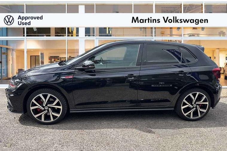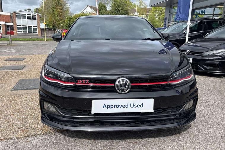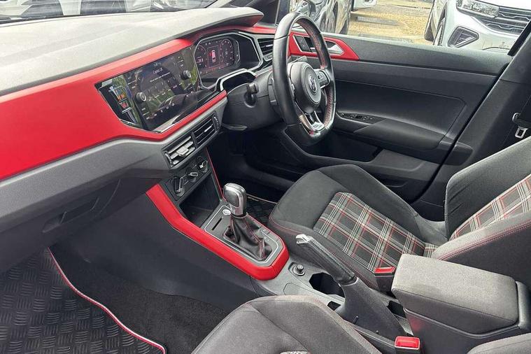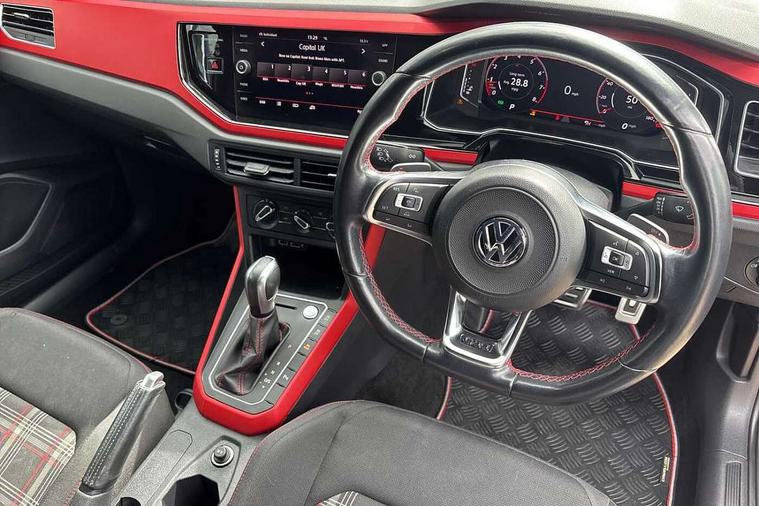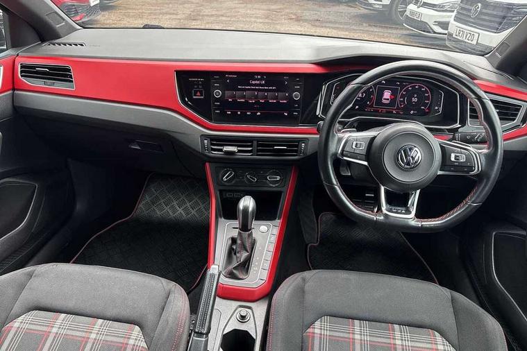 ACC - Adaptive cruise control with front assist, forward collision warning, distance monitoring, city emergency brake and speed limiter, App-Connect, Digital clock, Driver alert system, Driving Mode Selection with four preset modes - Eco, normal, sport or individual modes, Lights on warning, Multifunction computer plus, Power assisted speed sensitive steering, Speedo and rev counter, electronic odometer, trip, service interval display and fuel gauge, Start/stop system, Volkswagen connect, Warning buzzer and light for front seatbelts unfastened, Battery regeneration during braking, Galvanished body, Lowered sports suspension, XDS electronic differential lock, Body colour door handles, Body coloured side sills, Dusk sensor + automatic driving lights, Electric front windows, Electrically foldable, adjustable and heated door mirrors with reverse activated kerb view adjustment on passenger's side, Extended sill strips flared in black, Front fog lights including static cornering, Front windscreen washers and wipers with 4 speed intermittent delay, Gloss black rear spoiler (roof), Heat insulating tinted glass, Heated rear window with auto timer, High level 3rd brake light, Honeycomb radiator grille with red stripe, LED darkened rear light clusters, LED daytime running lights, LED dipped and main beam headlights with automatic range adjustment, LED rear number plate lights, Rear electric windows, Rear tinted glass from B-pillar backwards approx 65% tinted, Rear windscreen washer and wiper with interval delay, reverse activated, Stainless steel door sill protections with GTI logo, Twin chrome exhaust tailpipes, Unique GTI badging, 2 bag hooks in luggage compartment, 2 front cupholders and 12 V socket with cover, 3 rear head restraints, 60/40 split folding rear seat, AlumInium look pedals, Ambient lighting in front foorwell, front/rear door and dashboard light strips, Black roof lining and sun visors, Centre console storage with open storage compartment, Chrome-plated electric mirror adjustment switch surround, Chrome-plated electric window button surround, Driver and front passenger sunvisors with illuminated vanity mirrors, Dust/pollen filter, Folding rear seat backrest, Front and rear carpet mats with red stitching, Front centre armrest with storage compartment, Front head restraints, Front seat backrest storage pockets, Gear change selection via paddle shift on steering wheel, Gear lever gaiter in black trim surround, Glovebox, Handbrake grip button in chrome effect, Height/reach adjustable steering column, Instrument lighting, adjustable panel illumination, Interior light with delay, Isofix Preparation 2 Rear child seats, Jack and tool kit, Leather gear knob and handbrake grip, LED interior lighting - 2 reading lights front and rear with interior delay and dimming function, Luggage compartment cover, removable, Luggage compartment lighting, Luggage compartment with variable load floor, Storage compartment in front doors, Storage compartment in rear doors, Storage compartment under front seats, Three spoke leather trimmed multifunction steering wheel with GTI logo and red contrast stitching, GTI styling pack - Polo, Light and sight pack - Polo, 3 point height adj front seatbelts + pretensioners, 3x3 point rear seatbelts, ABS, Automatic post collision braking, Driver/front passenger airbag, Drivers and front passengers safety optimised head restraints, ESP with EDL + ASR, Front and rear passenger curtain airbags, Front passenger airbag deactivation, Front seat side impact airbags, Front/rear disc brakes, Hill hold control, Hydraulic Brake Assist (HBA), Red brake calipers, Single tone horn, Tyre pressure monitoring system, Alarm with interior protection and deactivation via infotainment system, Electronic engine immobiliser, Remote central locking with 2 remote folding keys, Remote keyless entry using key fob including Start/Stop button on centre console, Chrome instrument surround detailing, Chrome plated air vent surround, Gloss black instrument surrounds, Steel space saver spare wheel,