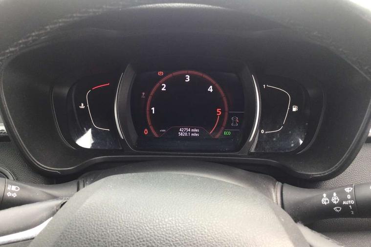 Cruise control + speed limiter, Digital speedometer with 7 TFT screen, Door/boot open warning light, Eco mode, Exterior temperature indicator, Front and rear parking sensors with rear parking camera, Gear change indicator, Lane departure warning system, Low fuel level warning light, Multi function trip computer, Oil level gauge, PAS, R-Link 2 Multimedia system + 7" touchscreen, TomTom + West European Map, DAB/FM/AM radio, bluetooth + hands free, USB/AUX, voice control, Rev counter, Smartphone integration, Diesel particulate filter, 4x35W speakers with 3D sound, Fingertip controls for audio system, Two rear USB sockets, Automatic headlights, Automatic high/low beam, Automatic windscreen wipers with variable speed adjustment, Body colour door handles, Body coloured bumpers, Body coloured door mirrors, Bodyside mouldings with chrome inserts, Chrome roof rails, Chrome window surround, Day/night rear view mirror, Electric adjustable/heated/folding door mirrors, Extra tinted glass in rear windows and tailgate, Front and rear electric windows, Front and rear towing rings, Front fog lamps with cornering function, Halogen headlights, Heated rear windscreen, Integrated C shape indicators with side repeaters, Integrated fuel filler cap, LED daytime running lights, LED rear fog light, Rear wiper, Shark fin antenna, 12v socket in front, 3 height adjustable rear headrests, 3 seat rear bench, 60/40 split folding rear seat, Accessory power point, Adjustable dashboard illumination, Air recirculation system, Centre rear armrest with cup holder, Driver sunblind with illuminated mirror and ticket holder, Driver's seat with lumbar adjustment, Driver/passenger reading lights, Dual zone automatic climate control, Easy life quick folding rear seat, Faux leather wrapped steering wheel, Front courtesy lights, Front footwell illumination, Front/rear floor mats, Height adjustable driver's seat, Height adjustable front headrests, Height adjustable passenger seat, Height/reach adjust steering wheel, Illuminated boot, Illuminated centre console, ISOFIX child seat anchorage points attached on outer rear seats, Multi positional boot floor, Pollen filter, Rear courtesy lights, Rear passenger air vents, Sliding front centre armrest, Storage glovebox, Synthetic leather/cloth upholstery, ABS/EBD, Driver/passenger 2 stage auto adaptive airbags, Electronic parking brake, Emergency brake assist, ESP with ASR and UCL (understeer control logical), Front and rear curtain airbags, Front lateral airbags, Front seat belts warning, Height adjustable front seatbelts with double pretensioners, Hill start assist, Passenger airbag deactivation system, Rear seatbelt warning indicator, Side impact protection, Three point rear center seatbelt, Traction control, Tyre pressure monitor, Anti-drill door locks/ignition barrel, Deadlocks, Insurance approved Cat 1 alarm system, Insurance Approved Immobiliser, Key card hands free with walk away lock function, RAID (Renault Anti-Intruder Device) with automatic door locking, Remote central locking, 19'' Zeus diamond cut alloy wheels,