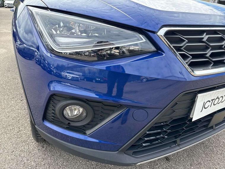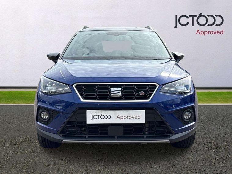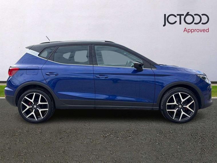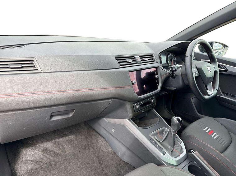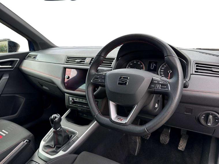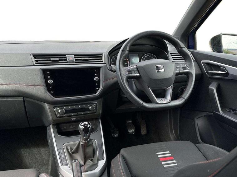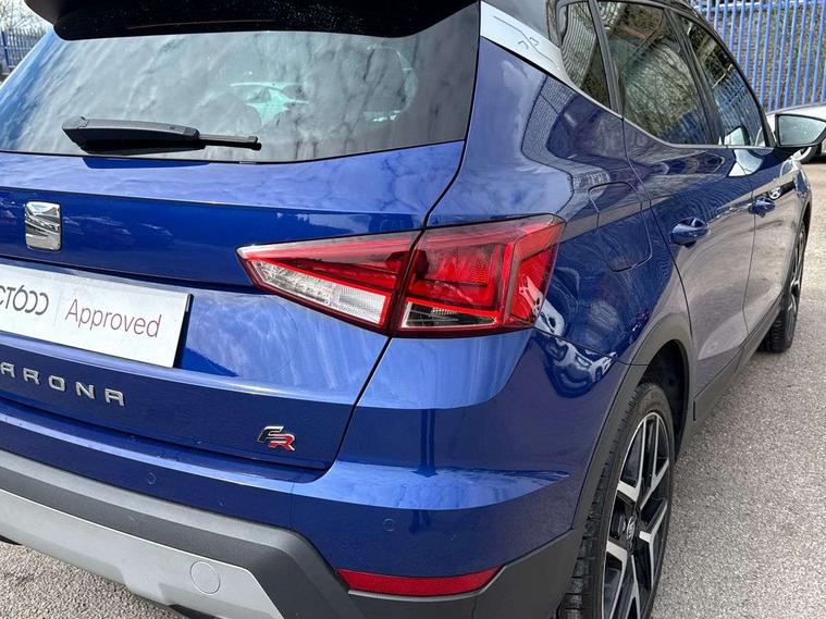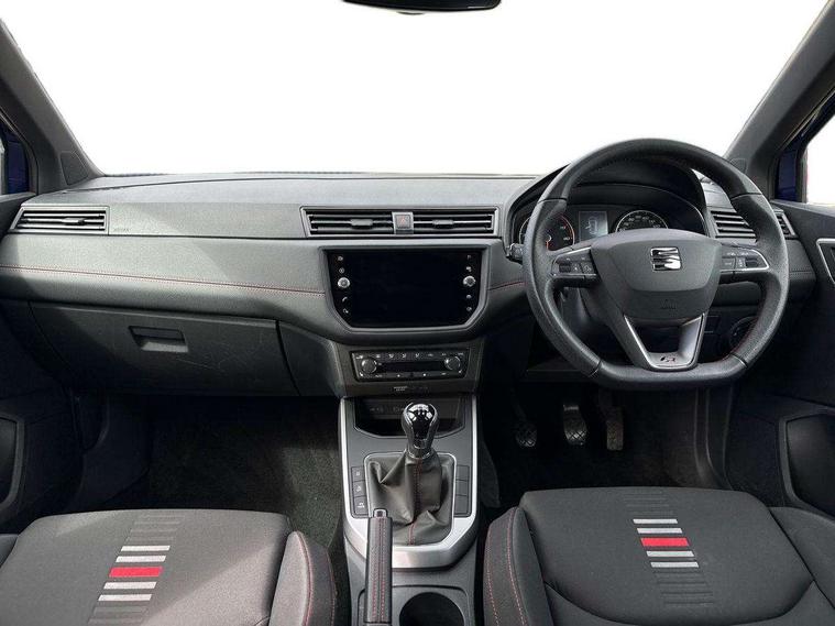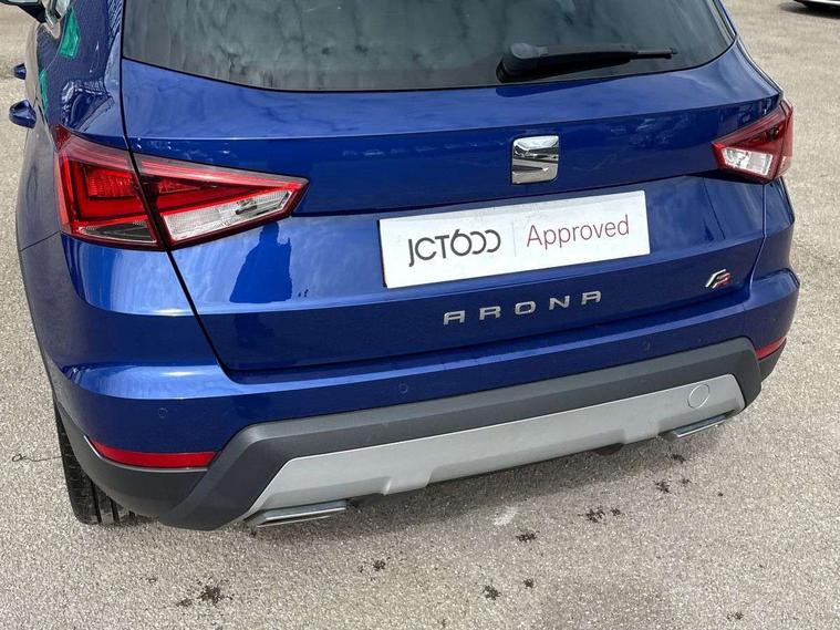 'Lights On' Reminder warning buzzer, Cruise control and speed limiter, Digital clock, Electric speed sensitive power steering, Full Link Smartphone Integration with Mirror Link, Apple Car Play, Google Android Auto with USB Type C cable for Apple and Android compatibility, Low fuel warning light, Outside temperature display, Rear parking sensor, RPM counter, Seat connect with safety, service, remote and online, SEAT Drive profile with dynamic chassis control - Four different models normal-sport-eco-individual, steering response, throttle response, Trip computer, Sports suspension, 6 speakers, Bluetooth interface for hands free and audio streaming, DAB digital radio and AM/FM radio, Steering wheel mounted audio controls, Anti theft roof antenna, Auto dimming interior rear view mirror, Automatic activation of hazard warning lights, Automatic headlights, Body coloured bumpers, Body coloured door handle inserts, Chrome front grille frame, Chrome roof rails, Chrome window trim, Coming/leaving home lighting function, Dark tinted rear windows, Electric front/rear windows with one touch/auto up/down, Electrically adjustable, heated and folding door mirrors, Full LED headlights dipped and mainbeam + front and rear fog lights, LED daytime running lights, LED rear tail lights and licence plate lights, Protective side mouldings, Rain sensing wipers, Rear window wash/wipe, Roof colour door mirrors, Twin exhaust pipe styling hidden exhaust pipe, Visible VIN plate, Windshield wiper with intermittent control and potentiometer, 2 cupholders, 60/40 split folding rear seat, Aircare filter, Black interior roof, Double boot floor, Driver sunvisor with covered mirror + card holder, Dual zone climate control, Front courtesy light with front reading lights, Front sport seats, Gear shift indicator, Heated front seats, Height adjustable front seats, Height/reach adjustable steering column, Illuminated boot, Instrument lighting with brightness control, Interior light in footwell, central console and door panel, ISOFIX points in outer rear seats with top tether anchorage points, Multi-colour ambient interior lighting, Nora cloth upholstery, Passenger sunvisor with vanity mirror, Perforated flat bottomed leather steering wheel/gear knob/handbrake with red stitching and FR logo, Two front and three rear height adjustable headrests, Connectivity pack plus - Arona, Interior chrome pack - Arona, 3 point seatbelts on all rear seats, ABS, Active front headrests, Child locks on rear doors, Driver and front passenger airbags with front passenger airbag de activation, front side and curtain airbags, Electronic stability control, Emergency Brake Assist (EBA) and front assist, Front and rear seatbelt reminder, Hill hold control, Multi-Collision braking, Red brake calipers, Seatbelts with red stripe, Tiredness recognition system, Traction control, Tyre pressure monitoring system, 2 folding remote keys with window open/close function, Alarm with back-up horn, Electronic engine immobiliser, Locking wheel bolts, Remote central locking + deadlocks, Tow away protection, Interior chrome line trim, Leatherette dashboard, 18" Performance alloy wheels,
