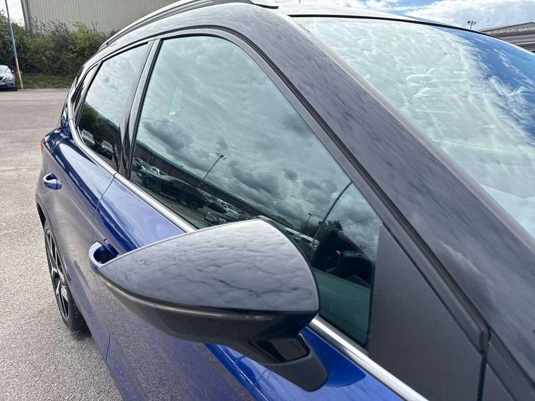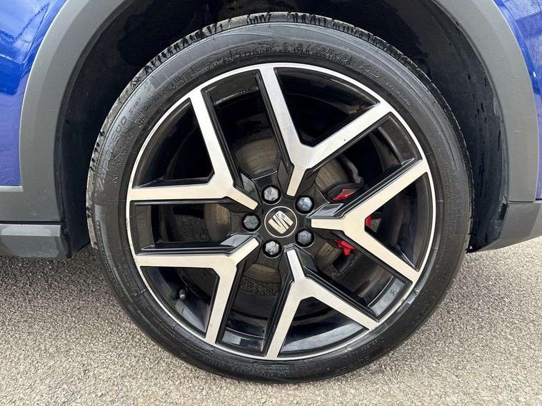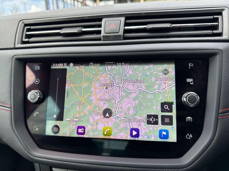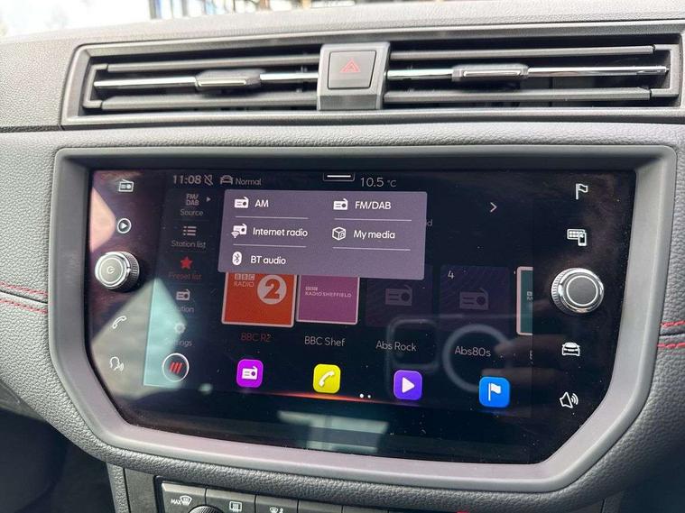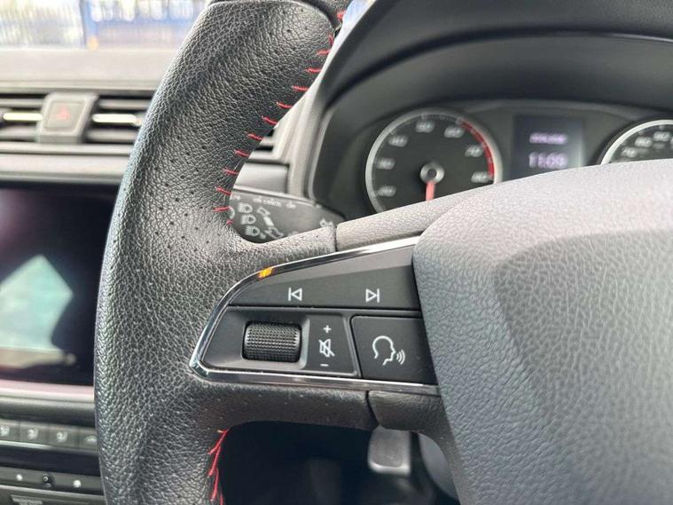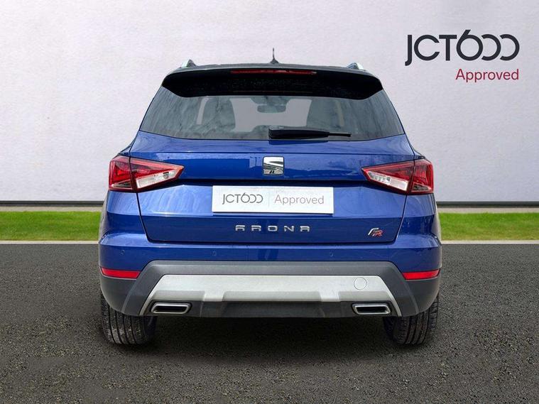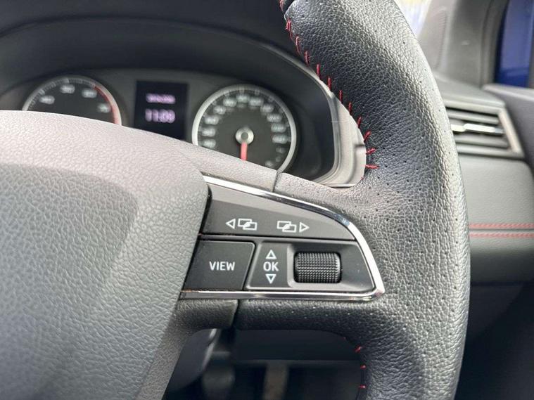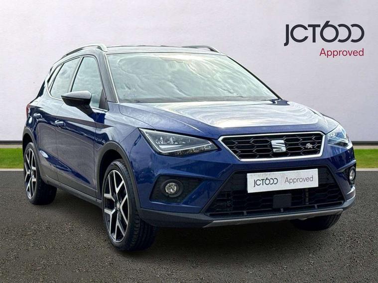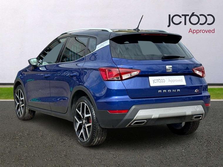 'Lights On' Reminder warning buzzer, Cruise control and speed limiter, Digital clock, Electric speed sensitive power steering, Full Link Smartphone Integration with Mirror Link, Apple Car Play, Google Android Auto with USB Type C cable for Apple and Android compatibility, Low fuel warning light, Outside temperature display, Rear parking sensor, RPM counter, Seat connect with safety, service, remote and online, SEAT Drive profile with dynamic chassis control - Four different models normal-sport-eco-individual, steering response, throttle response, Trip computer, Sports suspension, 6 speakers, Bluetooth interface for hands free and audio streaming, DAB digital radio and AM/FM radio, Steering wheel mounted audio controls, Anti theft roof antenna, Auto dimming interior rear view mirror, Automatic activation of hazard warning lights, Automatic headlights, Body coloured bumpers, Body coloured door handle inserts, Chrome front grille frame, Chrome roof rails, Chrome window trim, Coming/leaving home lighting function, Dark tinted rear windows, Electric front/rear windows with one touch/auto up/down, Electrically adjustable, heated and folding door mirrors, Full LED headlights dipped and mainbeam + front and rear fog lights, LED daytime running lights, LED rear tail lights and licence plate lights, Protective side mouldings, Rain sensing wipers, Rear window wash/wipe, Roof colour door mirrors, Twin exhaust pipe styling hidden exhaust pipe, Visible VIN plate, Windshield wiper with intermittent control and potentiometer, 2 cupholders, 60/40 split folding rear seat, Aircare filter, Black interior roof, Double boot floor, Driver sunvisor with covered mirror + card holder, Dual zone climate control, Front courtesy light with front reading lights, Front sport seats, Gear shift indicator, Heated front seats, Height adjustable front seats, Height/reach adjustable steering column, Illuminated boot, Instrument lighting with brightness control, Interior light in footwell, central console and door panel, ISOFIX points in outer rear seats with top tether anchorage points, Multi-colour ambient interior lighting, Nora cloth upholstery, Passenger sunvisor with vanity mirror, Perforated flat bottomed leather steering wheel/gear knob/handbrake with red stitching and FR logo, Two front and three rear height adjustable headrests, Connectivity pack plus - Arona, Interior chrome pack - Arona, 3 point seatbelts on all rear seats, ABS, Active front headrests, Child locks on rear doors, Driver and front passenger airbags with front passenger airbag de activation, front side and curtain airbags, Electronic stability control, Emergency Brake Assist (EBA) and front assist, Front and rear seatbelt reminder, Hill hold control, Multi-Collision braking, Red brake calipers, Seatbelts with red stripe, Tiredness recognition system, Traction control, Tyre pressure monitoring system, 2 folding remote keys with window open/close function, Alarm with back-up horn, Electronic engine immobiliser, Locking wheel bolts, Remote central locking + deadlocks, Tow away protection, Interior chrome line trim, Leatherette dashboard, 18" Performance alloy wheels,
