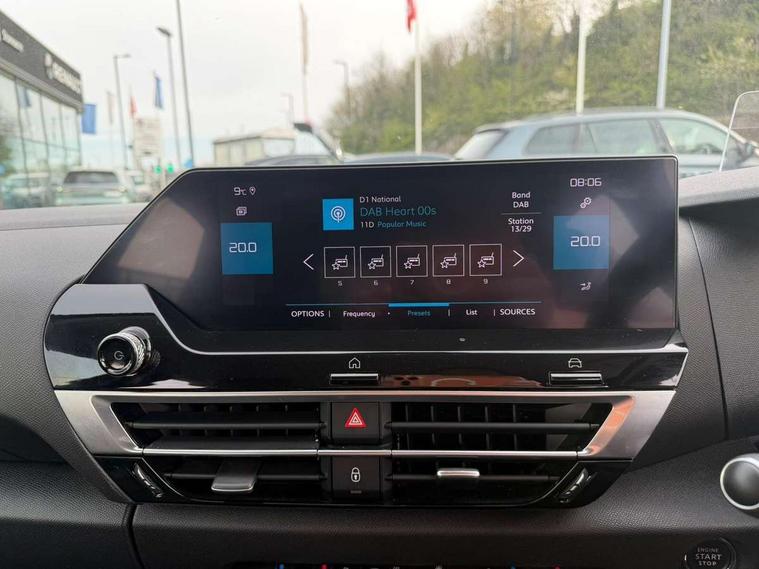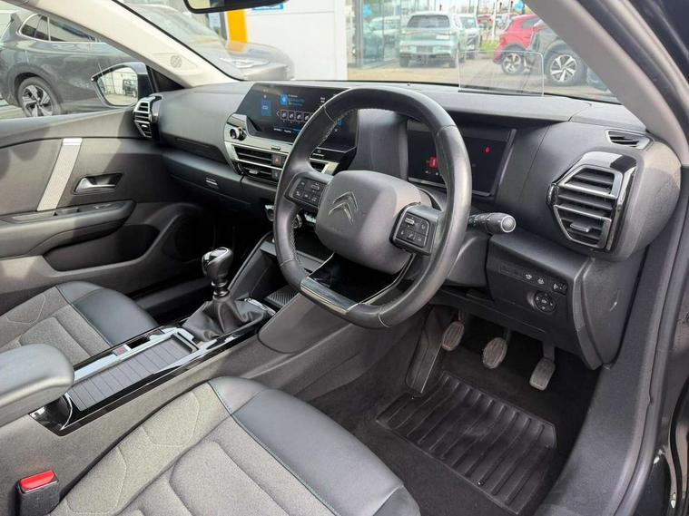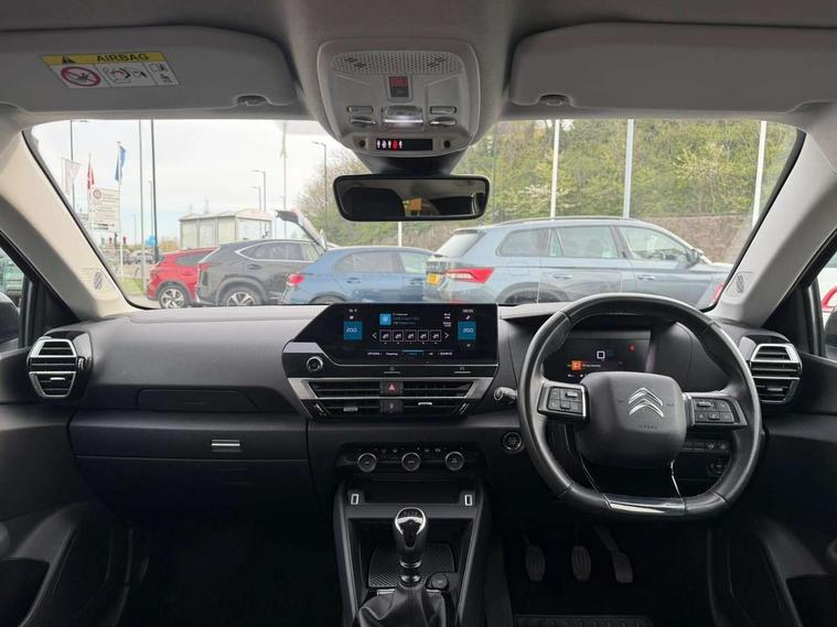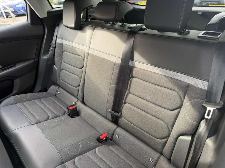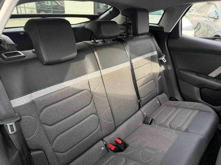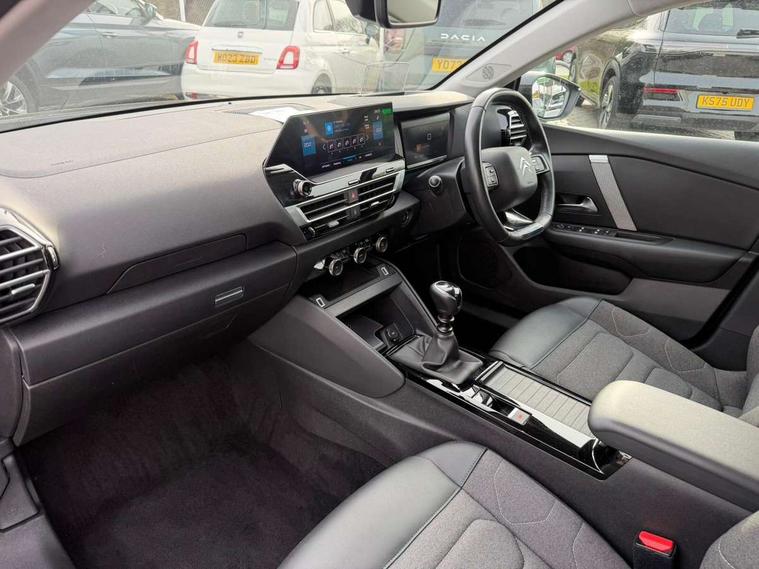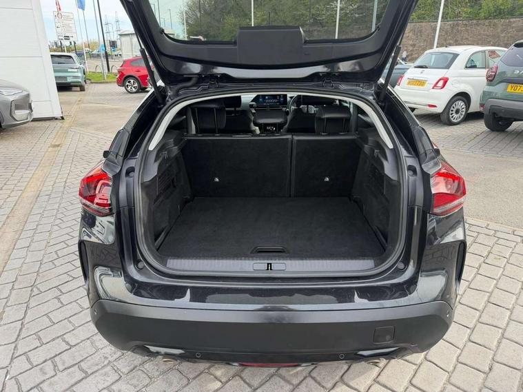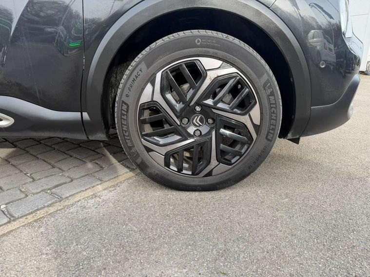 10" high resolution touchscreen user interface, controlling media, connectivity and vehicle settings, 5.5 inch backlit full TFT driver's instrument cluster, Active blind spot detection, Apple car play and Android auto, Citroen connect box emergency and assistance system, Citroen connect nav with speed cam and danger zones alert, Cruise control + speed limiter, Driver's head-up display, Electronic Power Steering (EPS), Front and rear parking sensors with flankguard, In-crash braking, Visio Park 1 (rear parking camera), Voice commands, Suspension with progressive hydraulic cushions - double hydraulic stops on front suspension and single on rear suspension, Auxiliary input socket, Bluetooth telephone and audio streaming, DAB Digital radio, Automatic headlights with high beam assist, Body colour bumpers, Body colour door handles, Dark tinted rear windows and side windows with chrome detail, Electrically heated, folding and adjustable external rear view mirrors with courtesy lighting, Electrochrome interior rear-view mirror with automatic day-night switching, Front and rear electric windows, Gloss black rear skirt, LED daytime running lights in V signature, LED front fog lamps with static cornering function, LED front headlamps, Obsidian black painted external rear view mirrors, Rain sensing automatic front windscreen wipers, Welcome and goodbye lighting, 12V power outlet, 1x USB Type-C socket charging & data connection and 1x USB Type-A socket in 1st row and 1x USB Type-A socket charging in 2nd row, 3 rear headrests, Boot light, Dashboard tray in front cabin, Deluxe leather steering wheel with two command blocks, Driver and passenger sunvisors with illuminated vanity mirrors, Dual zone automatic air conditioning, Front and rear LED interior lighting, Front head restraints, Height adjustable driver's seat with adjustable lumbar support, Height adjustable front passenger seat, Height and reach adjustable steering wheel, Map pockets in rear of front seats, Raised centre console with two cup holders, Split folding rear seats, Two position boot floor, High level acoustic insulation pack - C4/C4 X/e-C4 X, Safety pack plus - C4 Shine/ Shine Plus, 3x3 point rear seatbelts, ABS, Driver and front passenger airbags, Electric parking brake, ESP, Front seatbelt pretensioners, Hill start assist, Manual child lock in second row, Manual deactivation of front passenger airbag, Post collision safety brake, Row 1 and 2 curtain airbags, Row 1 side thorax airbags, Seatbelt unfastened on the move warning, Tyre underinflation detection, Anti-theft alarm (volumetric protection), Immobiliser, Keyless entry and start, Remote locking with deadlocks, 18" Aeroblade dark alloy wheels and smoke grey finish with anti-theft locking wheel, Puncture repair kit with compressor,