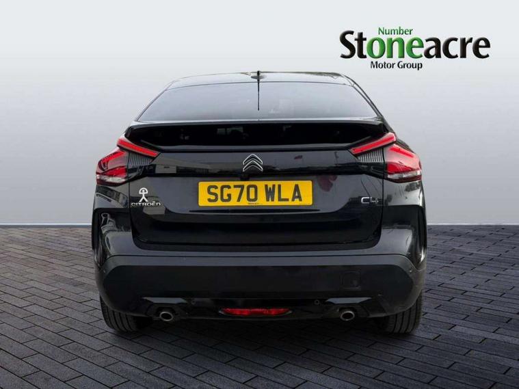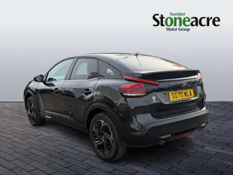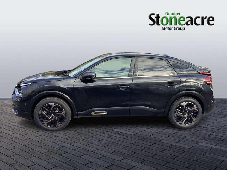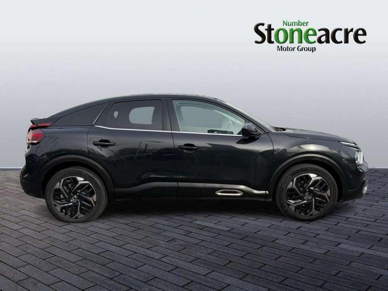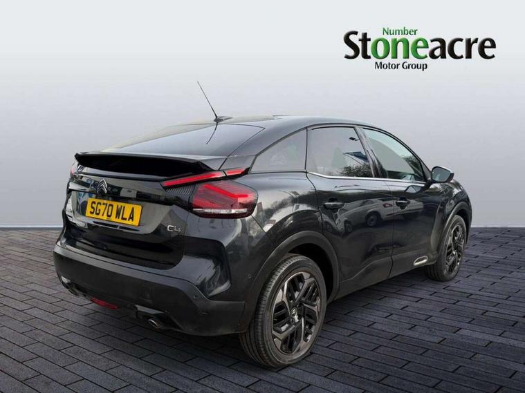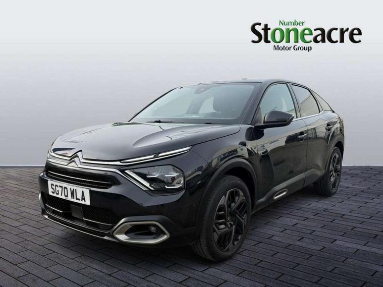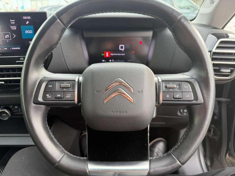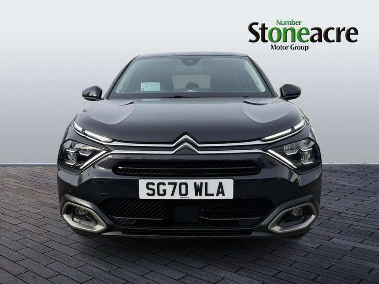 10" high resolution touchscreen user interface, controlling media, connectivity and vehicle settings, 5.5 inch backlit full TFT driver's instrument cluster, Active blind spot detection, Apple car play and Android auto, Citroen connect box emergency and assistance system, Citroen connect nav with speed cam and danger zones alert, Cruise control + speed limiter, Driver's head-up display, Electronic Power Steering (EPS), Front and rear parking sensors with flankguard, In-crash braking, Visio Park 1 (rear parking camera), Voice commands, Suspension with progressive hydraulic cushions - double hydraulic stops on front suspension and single on rear suspension, Auxiliary input socket, Bluetooth telephone and audio streaming, DAB Digital radio, Automatic headlights with high beam assist, Body colour bumpers, Body colour door handles, Dark tinted rear windows and side windows with chrome detail, Electrically heated, folding and adjustable external rear view mirrors with courtesy lighting, Electrochrome interior rear-view mirror with automatic day-night switching, Front and rear electric windows, Gloss black rear skirt, LED daytime running lights in V signature, LED front fog lamps with static cornering function, LED front headlamps, Obsidian black painted external rear view mirrors, Rain sensing automatic front windscreen wipers, Welcome and goodbye lighting, 12V power outlet, 1x USB Type-C socket charging & data connection and 1x USB Type-A socket in 1st row and 1x USB Type-A socket charging in 2nd row, 3 rear headrests, Boot light, Dashboard tray in front cabin, Deluxe leather steering wheel with two command blocks, Driver and passenger sunvisors with illuminated vanity mirrors, Dual zone automatic air conditioning, Front and rear LED interior lighting, Front head restraints, Height adjustable driver's seat with adjustable lumbar support, Height adjustable front passenger seat, Height and reach adjustable steering wheel, Map pockets in rear of front seats, Raised centre console with two cup holders, Split folding rear seats, Two position boot floor, High level acoustic insulation pack - C4/C4 X/e-C4 X, Safety pack plus - C4 Shine/ Shine Plus, 3x3 point rear seatbelts, ABS, Driver and front passenger airbags, Electric parking brake, ESP, Front seatbelt pretensioners, Hill start assist, Manual child lock in second row, Manual deactivation of front passenger airbag, Post collision safety brake, Row 1 and 2 curtain airbags, Row 1 side thorax airbags, Seatbelt unfastened on the move warning, Tyre underinflation detection, Anti-theft alarm (volumetric protection), Immobiliser, Keyless entry and start, Remote locking with deadlocks, 18" Aeroblade dark alloy wheels and smoke grey finish with anti-theft locking wheel, Puncture repair kit with compressor,