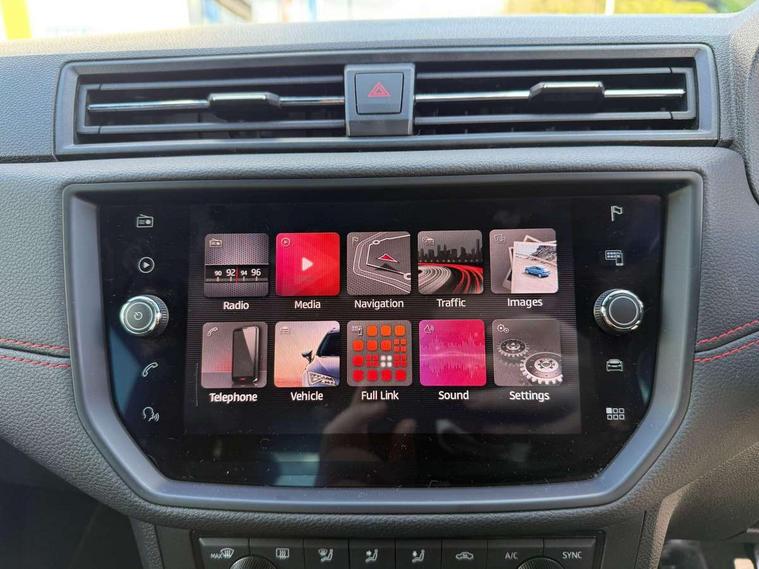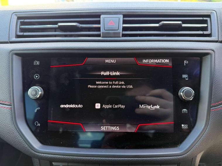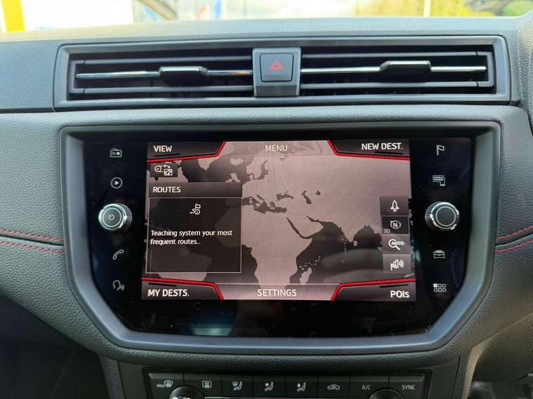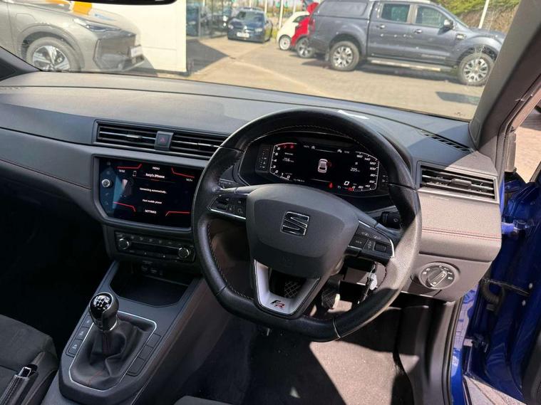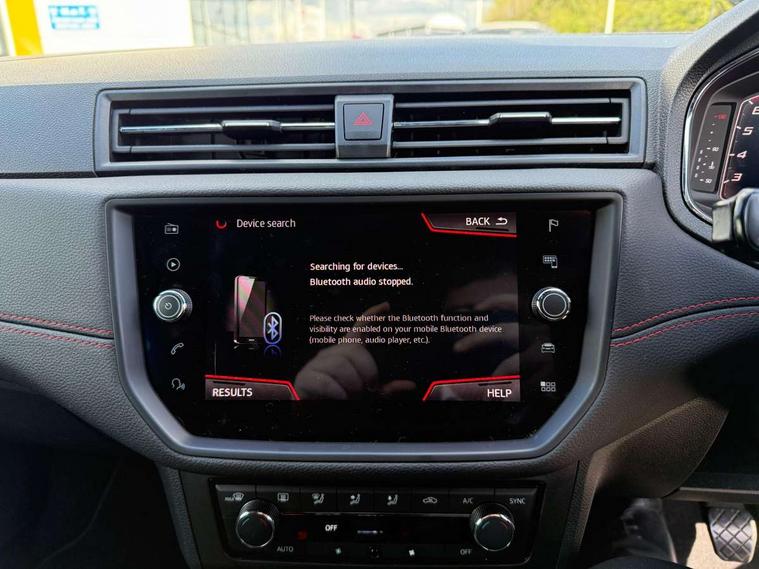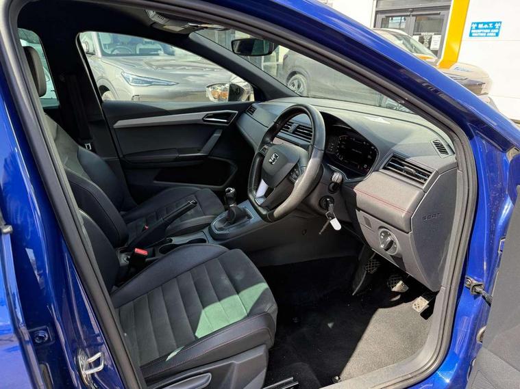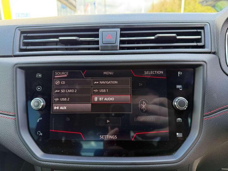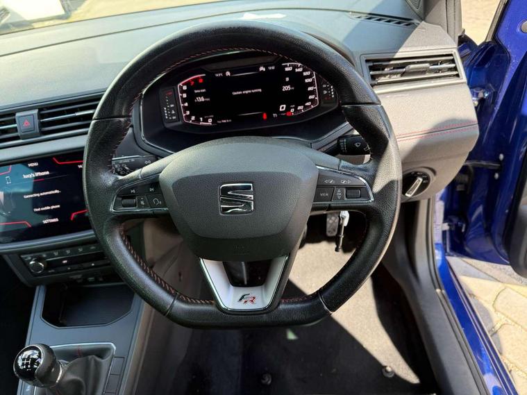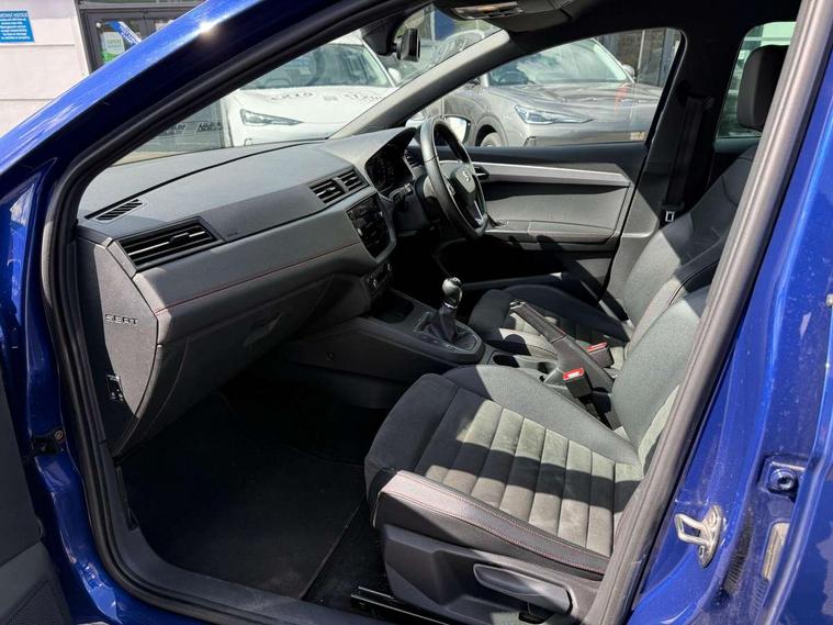 'Lights On' Reminder warning buzzer, Bluetooth Handsfree Phone Connection, Cruise control, Digital clock, Digital cockpit, Full Link Smartphone Integration with Mirror Link, Apple Car Play, Google Android Auto, Low fuel warning light, Outside temperature gauge, Power Steering, Satellite navigation system with 3D mapping, 8" touch screen, voice control and additional USB port, SEAT Drive profile, SEAT logo boot release, Trip computer, Sports suspension, 6 speakers, Auxiliary input socket, CD player, Digital Audio Broadcast (DAB) Tuner, Radio/MP3 player, SD card slot, SEAT USB media cable, Steering wheel mounted controls, USB port, Anti theft roof antenna, Auto dimming rear view mirror, Automatic headlights, Automatic rain sensing wipers, Body colour bumpers, Body colour door handles, Brilliant black door mirrors, Chrome front grille frame, Chrome grille, Coming/leaving home lighting function, Cornering front fog lights, Dark tinted rear windows, Electric folding door mirrors, Electric front windows, Electric headlight adjustment, Electrically adjustable and heated door mirrors, Exclusive FR rear bumper, Full LED headlights, LED daytime running lights, LED tail lights, Rear fog lights, Twin exhaust pipes, 3 rear headrests, 60/40 split folding rear seat, Door and steering wheel ice metal decorative inserts, Driver's sunvisor with ticket holder/vanity mirror, Dual zone climate control, Dust/pollen filter, Flat bottomed perforated leather steering wheel with red stitching and FR logo, Front courtesy lights, Front cupholders x 2, Front reading lights, Gear shift indicator, Glovebox, Height adjustable driver's seat, Height adjustable front/rear head restraints, Height adjustable passenger seat, Height/reach adjust steering wheel, Illuminated boot, Instrument lighting with brightness control, Leather dashboard, Leather handbrake, Microsuede cloth upholstery, Multi-colour ambient interior lighting, Passenger sunvisor, Rear top tether child seat ISOFIX attachment, Sports seats, Full LED headlight pack - Ibiza, 3 point seatbelts on all 3 rear seats, ABS, Active front headrests, Child locks on rear doors, Curtain airbags, Driver/Front Passenger airbags, ESP+EBA, Front assist (AEB), Front passenger airbag deactivation, Front side airbags, Hill hold control, Multi-Collision braking, Rear disc brakes, Seatbelt warning, Tiredness recognition system, Tyre pressure monitoring system, Electronic engine immobiliser, Locking wheel bolts, Remote central locking + deadlocks, Volumetric alarm with back up horn, 18" Performance machined bi-colour alloy wheels,