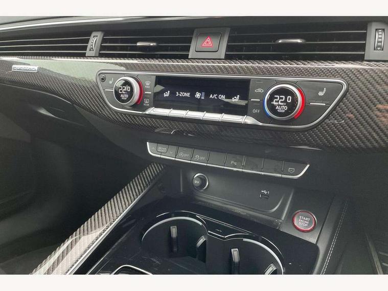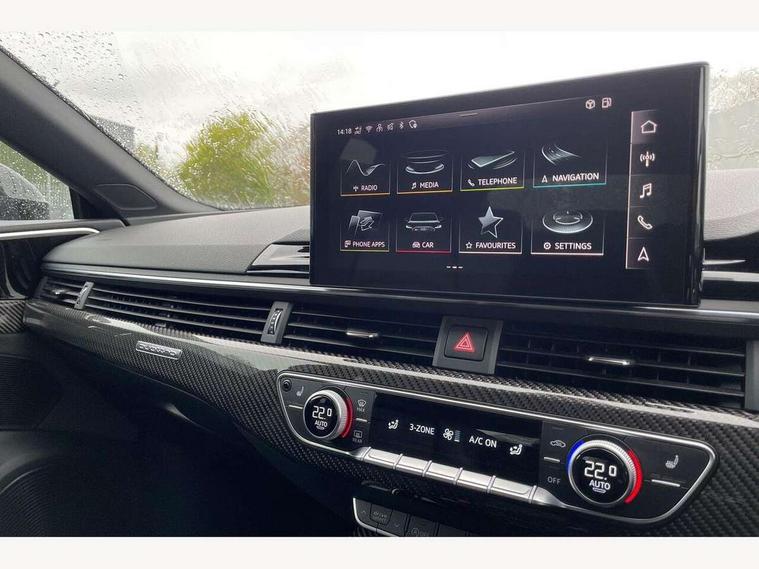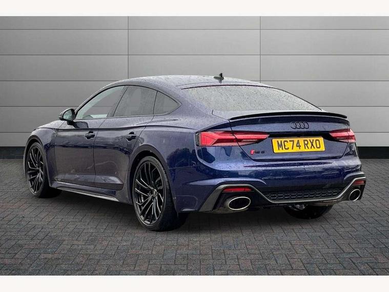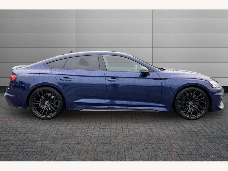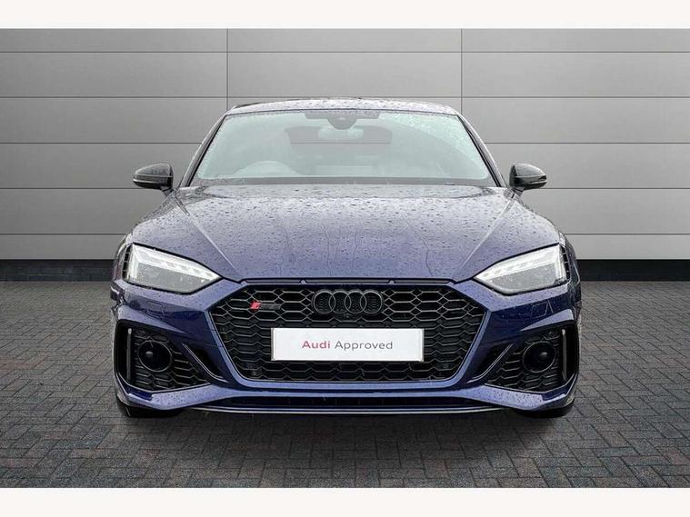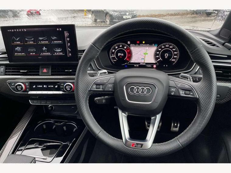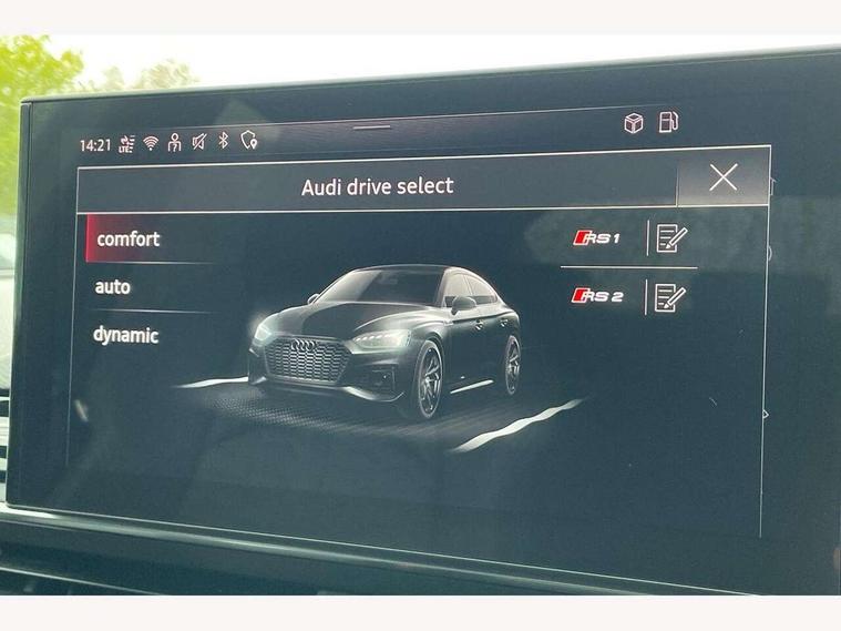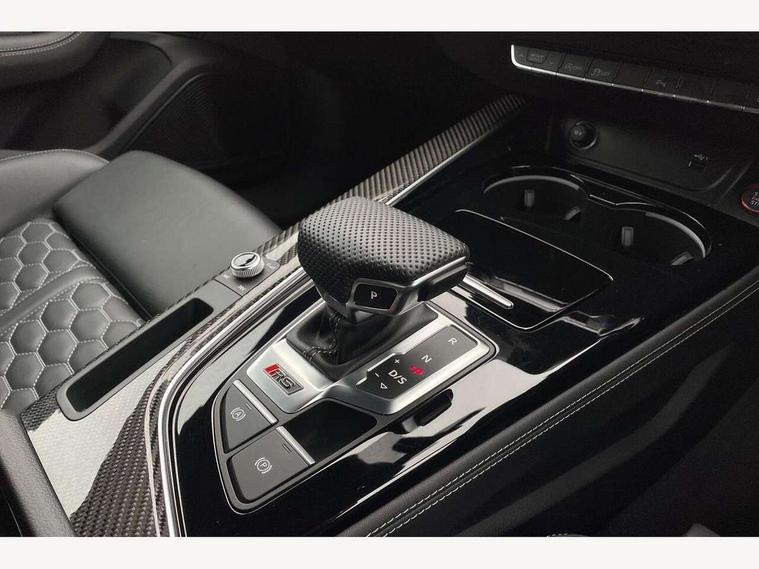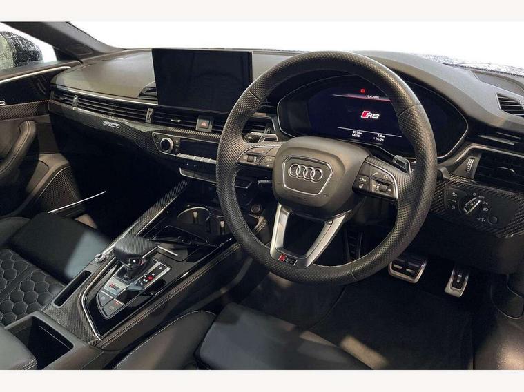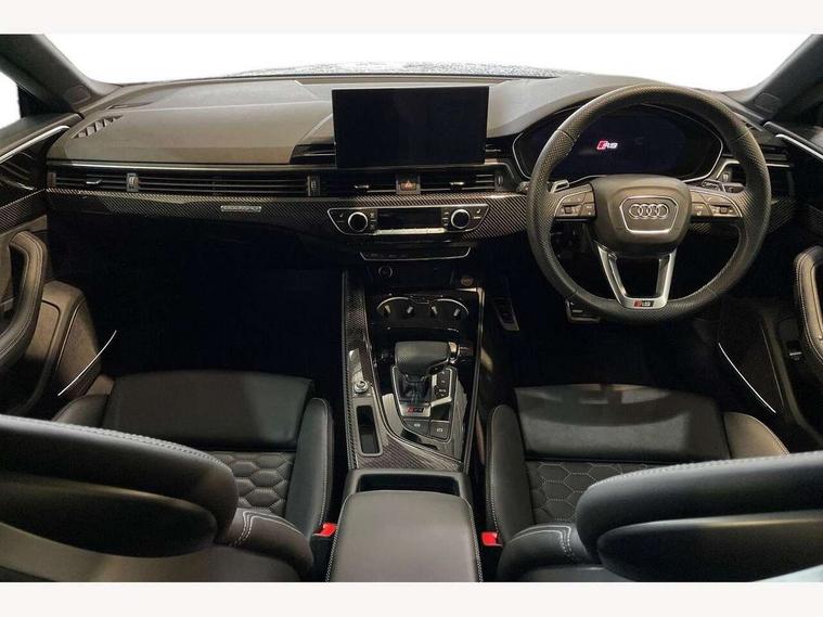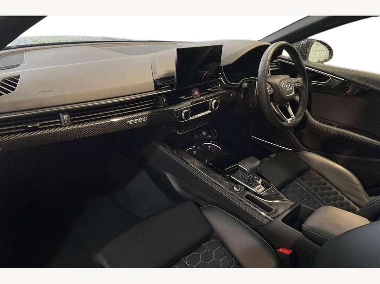 Audi connect safety and service (e-call), Audi parking system plus with front and rear sensors, Audi side assist, Audi smartphone interface, Audi Virtual Cockpit with RS specific design and 12.3" display, Automatic start-stop system with coasting functionality and efficiency programme, Bluetooth interface, Camera based traffic sign recognition, Electromechanical power steering, Email, calendar and text messages displayed via MMI, Lane departure warning, MMI Navigation plus with MMI touch includes 10.1" high resolution colour MMI display, 3D map, Rear view camera, RS Audi drive select, RS drive modes on steering wheel, Service interval indicator, Voice control system, Quattro sports differential, 2 x USB charging port with aux input socket, Audi sound system, DAB digital radio reception, Audi Beam uses LEDs to project the RS logo, Audi matrix LED headlights with LED rear lights + dynamic front and rear indicators, Audi rings and lettering glossy black, Auto dimming rear view mirror, Body colour door handles, Electric front windows, Electric rear windows, Electrically folding, adjustable and heated door mirrors with integrated LED side indicators and kerb view function for passenger side, Exterior mirror housing in high gloss black, High beam assistant, Larger singleframe grill, LED 3rd brake light, LED daytime running lights, Privacy glass with rear acoustic glazing, Rain and light sensors, Rear side wing doors, RS bumper with quattro lettering, RS5 badges on grille, the front wing panels and rear, RS5 dual branch chrome tailpipes with left and right oval pipes, Windscreen with acoustic glazing, 40:20:40 split folding 3 rear bench seat in 2nd row with rear centre armrest, Aluminium shift paddles, Black cloth headlining, Deluxe 3 zone electronic climate control, Electrically adjustable front seats, Front centre armrest, Front head restraints, Front knee pads in Leatherette, Front/rear floor mats, Heated front seats, Illuminated door sill trims with RS5 logo, ISOFIX child seat mounting and top tether, Pneumatic massage function, Rear head restraints, RS Super Sports seats with contrast honeycomb stitching, Single front passenger seat, Stainless steel pedals, Carbon black styling pack - RS5, LED Interior light pack - RS5, 3x3 point rear seatbelts, 6 airbags - Driver, front passenger, curtain and side airbags, Attention and drowsiness assist, Child locks on rear doors, Electromechanical parking brake, Electronic Stabilisation Control (ESC) including ABS, ASR and EDL, Front passenger airbag deactivation, Height adjustable front seatbelts, Hill hold assist, Multi collision brake assist, Pop-up bonnet for pedestrian protection, Pre sense city, RS Model enhanced braking system, Seatbelt monitoring, Tyre pressure warning, Warning triangle and first aid kit, Anti theft alarm system, Anti theft wheel bolts, Immobiliser, Keyless Go, Remote control key with RS emblem, Carbon twill inlays, 20" 5 Segment spoke Evo style design audi sport alloy wheels in glossy black, Tool kit, Tyre repair kit,