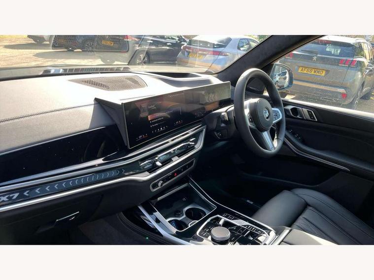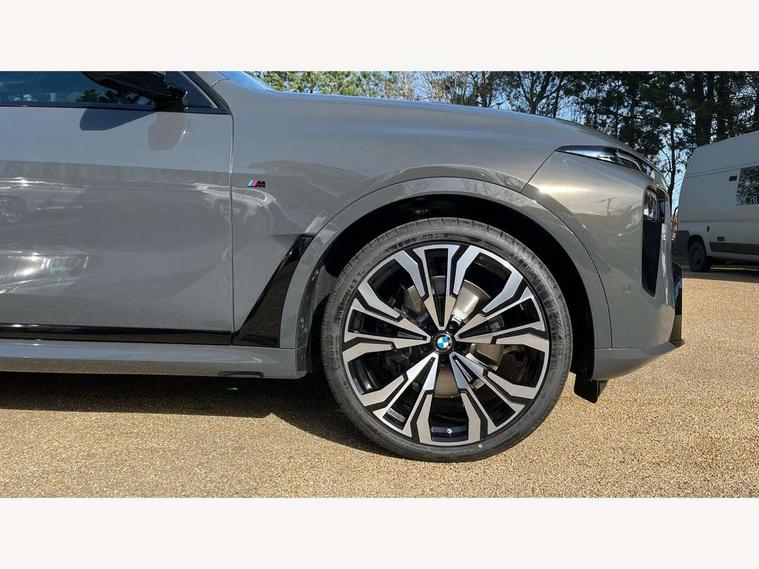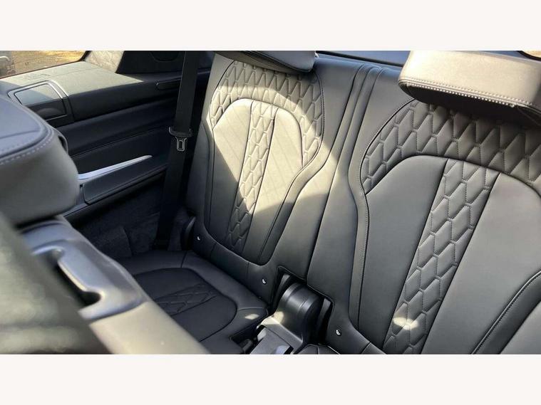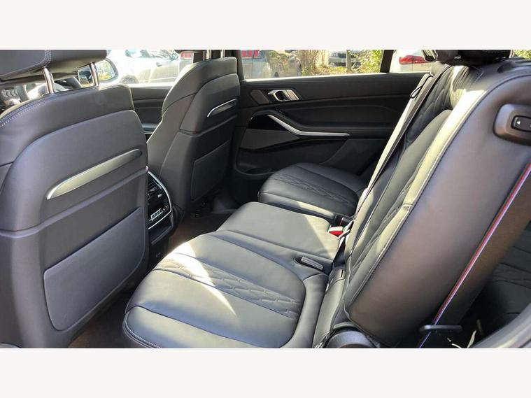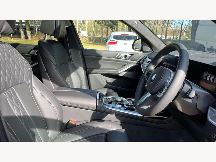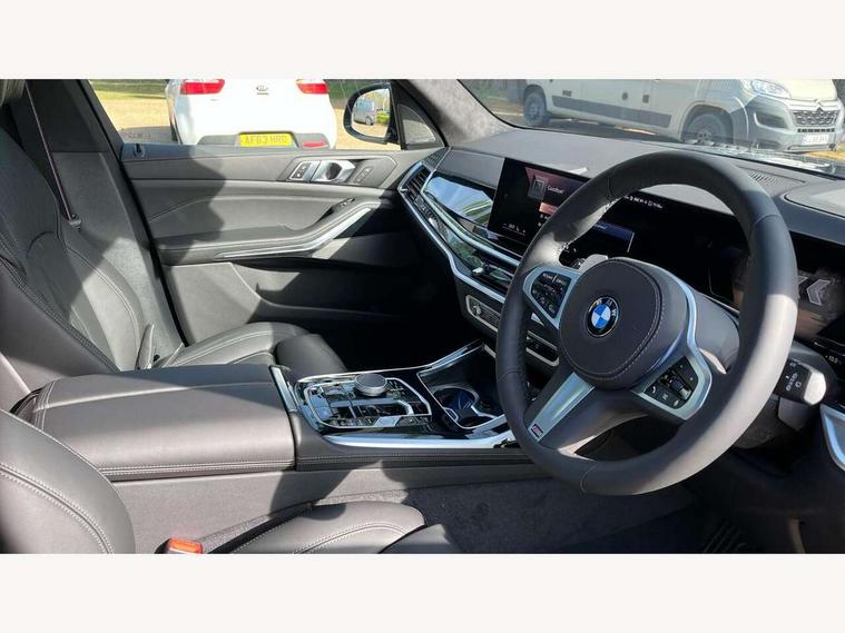 Attentiveness assist, Automatic tailgate operation, BMW ConnectedDrive online services, BMW live cockpit + with curved 12.3 instrument cluster/14.9 central display, nav/Tuner with diversity reception, RDS/4GLTE/remote software upgrade, BMW Teleservices, Condition based service, Cruise control with brake assist, eCall emergency call system, Enhanced bluetooth with wireless charging, Integrated owner's handbook, PAS, Speed limiter, Wi-Fi hotspot, AC Fast charging preparation (Maximum charging power 11kW), Adaptive 2-axle Front and rear air suspension, Drive performance control with ECO PRO comfort + sport mode, Eight speed steptronic sport automatic transmission and gearshift paddles on the steering wheel, Adaptive LED Headlights, Front and rear electric windows, High beam assistant, High gloss black shadow line roof rails, LED daytime running lights, Rain sensor, Rear side wing doors, Third brake light in rear spoiler, Variable intermittent rear wash/wipe, 12V - Power sockets with 2x centre console and 1x luggage compartment, 3 seat bench in 2nd row, Foldable rear centre armrest with 2 cupholders and storage compartment, Front and rear side armrest integrated into door trim, Headrests for all seats, Luggage compartment separating net, Lumbar support with height and depth adjustment in backrest, Single front passenger seat, Three spoke sport M leather steering wheel, Velour floormats, Ambient light interior pack - X5, Driving assistant pack with radar based driver assistance system - X5, Expanded exterior mirror pack - X5/X5 M, M aerodynamics pack - X5, Parking assistant pack - X5, 3 rear seatbelts, Acoustic protection for pedestrians, Active protection, Airbags - driver/front passenger, rear and side, first and second row seats head airbags, front passenger seat airbag deactivation + knee airbag, Anti-lock braking system (ABS), Automatic Stability Control (ASC), Brake energy regeneration, Cornering brake control (CBC), Crash sensor activating central locking release, hazard warning lights, fuel cut off, interior lighting + activation of safety battery terminal clamp, DSC - Dynamic Stability Control, Dynamic Traction Control - DTC, Electromechanical parking brake with automatic drive away release and auto hold function, Electronic brake force distribution, Hill start assistant, M Sport blue painted brake calipers with 'M' designation, Mechanical child proof lock on rear doors, Tyre pressure monitoring system, Tyre pressure sensors, Ventilated front and rear disc brakes, Warning triangle and first aid kit, Alarm system, Closing system with central locking, Comfort access system, Locking wheel bolts,