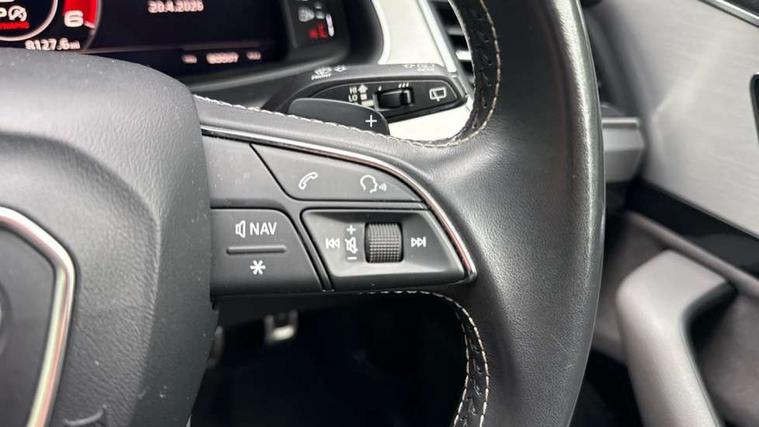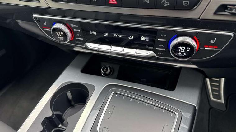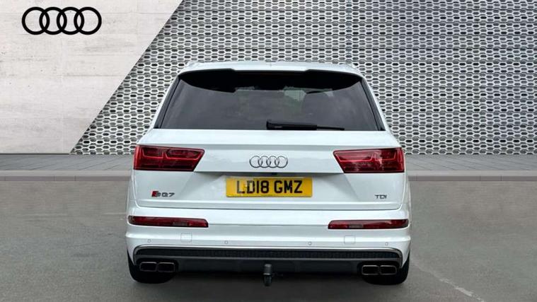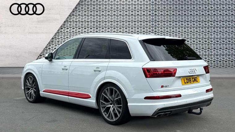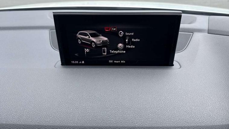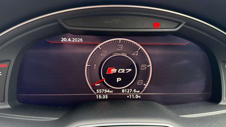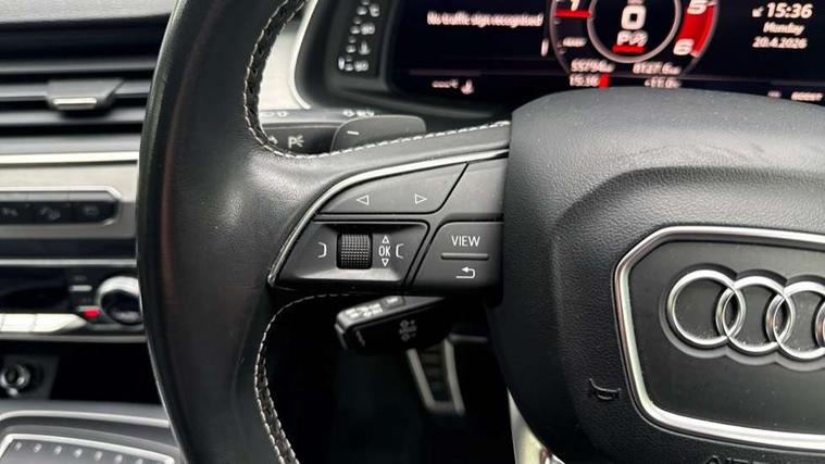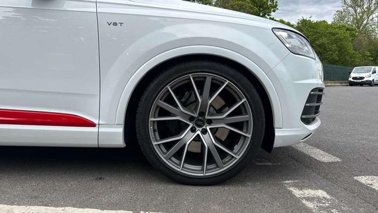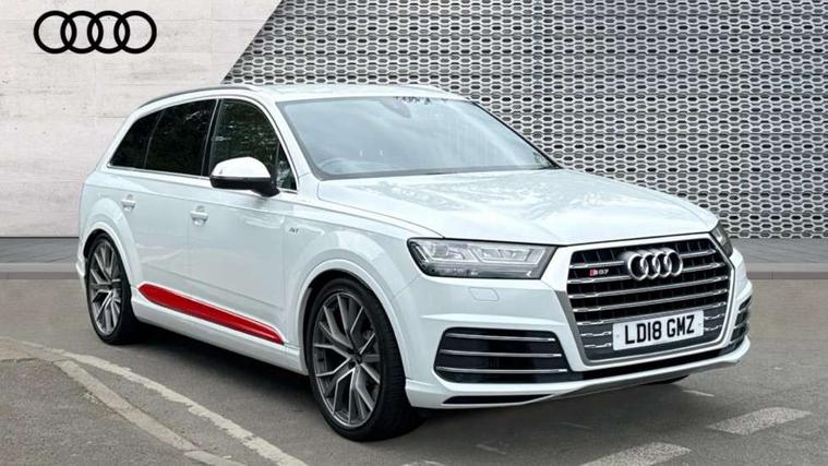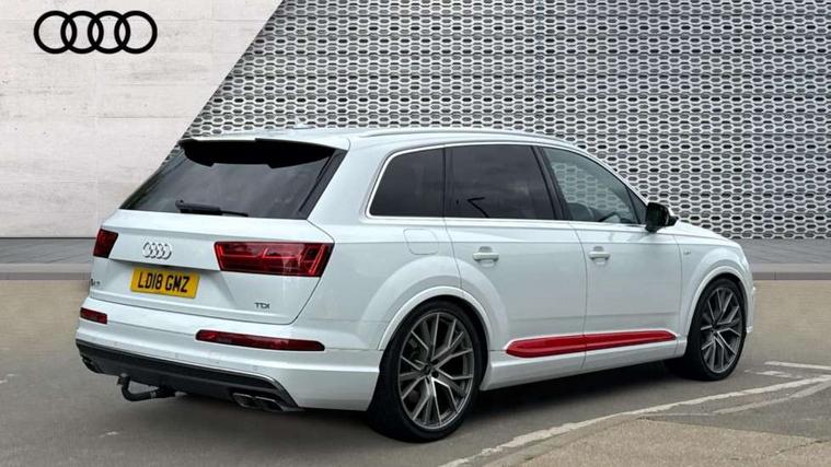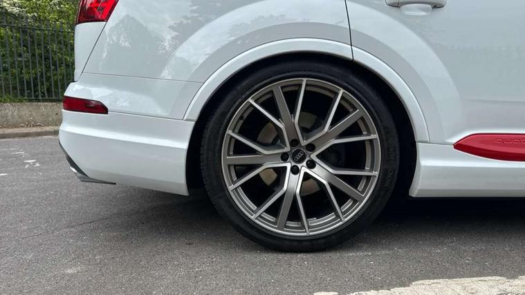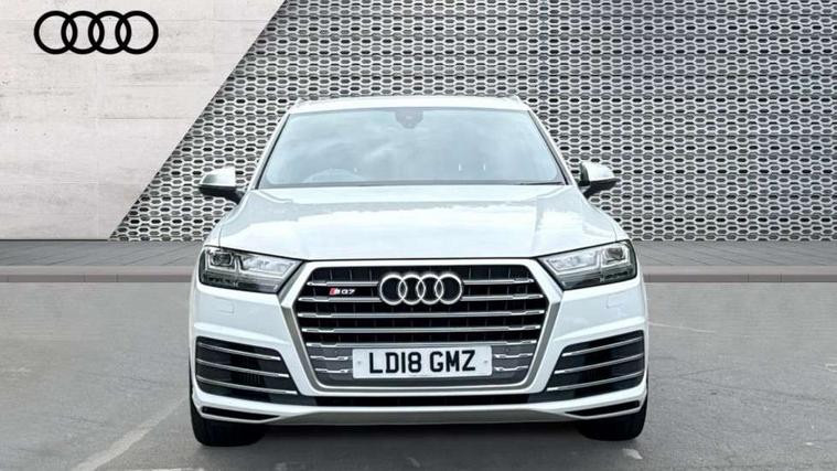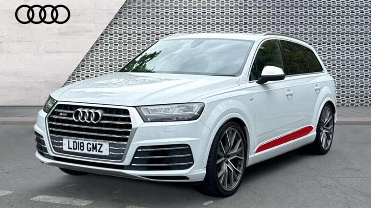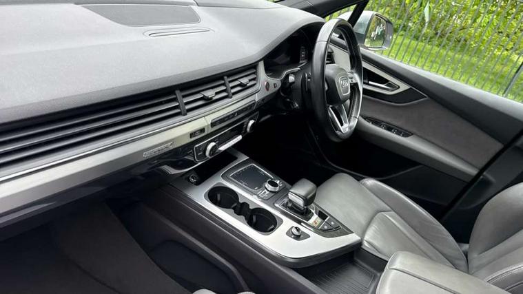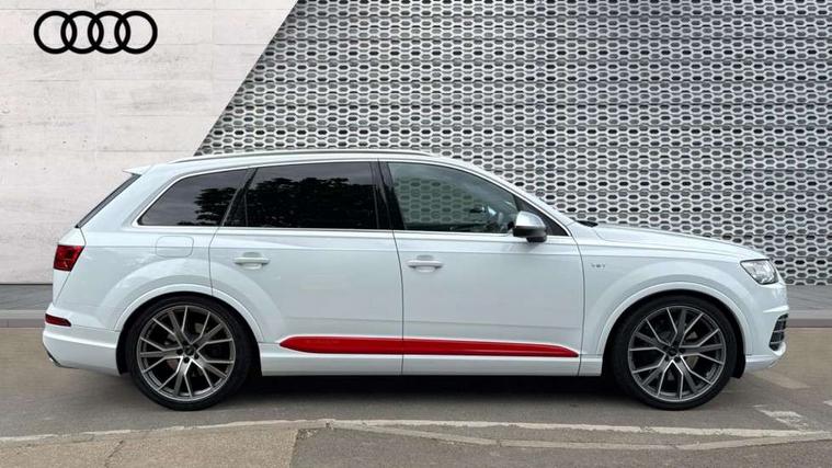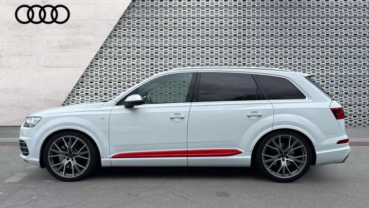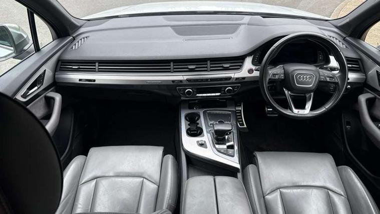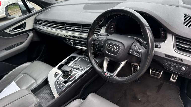 Audi drive select, Audi smartphone interface, MMI - Multi Media Interface control system, MMI navigation plus with touch and 8" colour display, DVD, SD card reader, 10GB music storage, Mobile phone preparation with bluetooth interface, Remote electric boot opening/closing, Service interval indicator, Servotronic speed related PAS, Speed limiter, Voice control system, 85 litre fuel tank, Adaptive air suspension, 2 USB ports, Audi music interface, Aux-in socket, DAB digital radio module, MMI radio plus, Acoustic windscreen, Active exhaust sound system, Aluminium effect front grille, Audi Beam uses LEDs to project the Audi Sport logo, Auto dimming rear view mirror, Body coloured bumpers, Dual branch oval twin exhaust tailpipes, Dynamic rear indicators, Electric front+rear windows, Headlight washers, High beam assist, LED daytime running lights, LED tail lights, Loading sill protector in stainless steel, Platinum grey front lip spoiler, Rain and light sensors, Rear wiper, Roof spoiler, S body styling, 2 cupholders in front centre console, 35/30/35 split fold 2nd row seats, 4 way electrically adjustable lumbar support for drivers seat, 4 way electrically adjustable lumbar support for front passenger seat, Aluminium scuff plates, Door sill trims with S line logo, Electric 3rd row 50/50 split/fold, Electric adjustable front seats, Four zone electronic climate control, Front ashtray and cigar lighter, Front centre comfort armrest with storage + cupholders, Front head restraints, Front/rear floor mats, Gearshift paddles, Heated front seats, ISOFIX on front passenger and rear outer seats, Leather gear knob, Rear centre armrest with 2 cupholders, Rear headrests, Stainless steel pedals, Sunvisors with illuminated vanity mirrors, Top tether anchor plate for isofix child seat, Interior light pack - Q7, 3 point seatbelts on all seats, ABS+Electronic Brake force Distribution, Curtain airbags, Driver and passenger airbags, EDL + ASR, Electrically operated child locks on rear doors, Electromechanical parking brake, ESP, Front passenger airbag deactivation, Front side airbags, Hill descent control, Hill hold assist, Seatbelt warning, Traction control, Tyre pressure monitoring system, Warning triangle and first aid kit, Alarm with interior monitoring, Immobiliser, Keyless Go access/ignition system, Locking wheel bolts, Remote central locking, Chrome door inserts, Tool kit, Tyre repair kit,