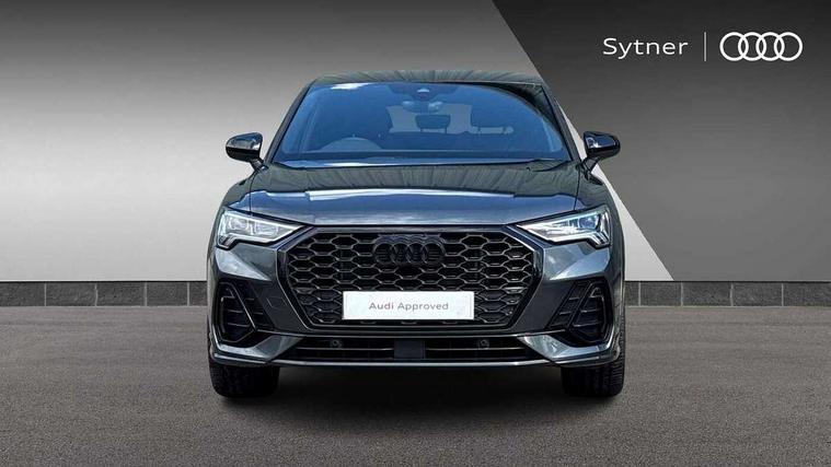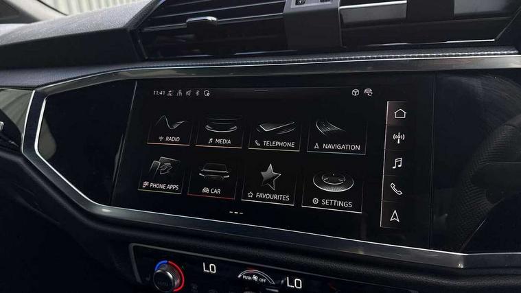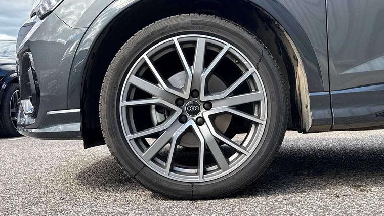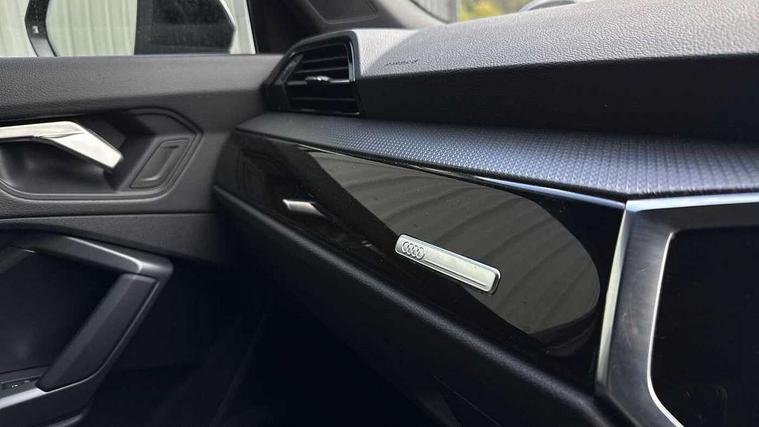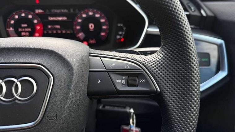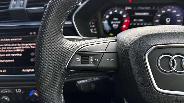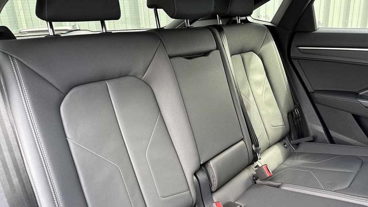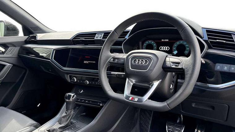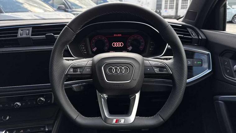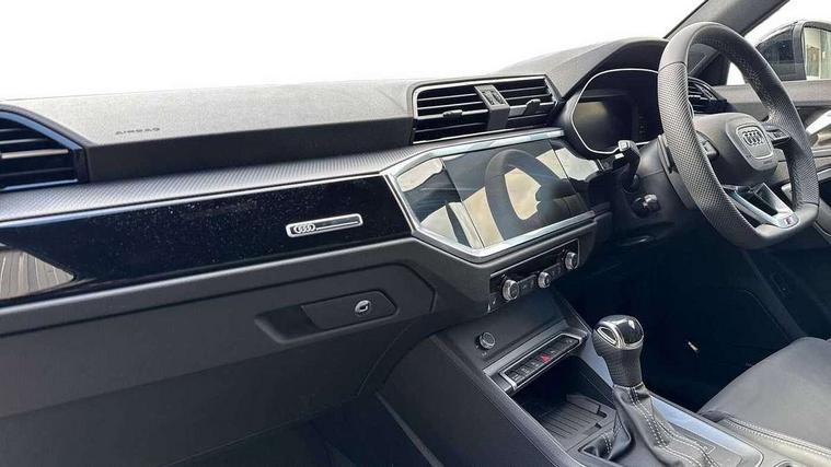 Audi connect safety and service, Audi drive select, Audi lane departure warning, Audi Virtual Cockpit - 10.25" display, Bluetooth interface, Camera based traffic sign recognition, Distraction and Fatigue warning, Legal emergency call, MMI Navigation Plus with high resolution 10.1 inch touchscreen colour display, Power operated tailgate, Progressive steering, Service interval indicator, Smartphone interface includes wireless Apple carplay/Android Auto, Start stop system with recuperation, Voice control system with natural language interaction, Sports suspension, 2 USB-C ports with charge and data functions, 6 passive loudspeakers, DAB digital radio module, Acoustic windscreen, Audi Beam uses LEDs to project the Audi logo onto the ground as you exit your Q3, Auto dimming door mirrors, Auto dimming frameless rear view mirror, Electrically folding, adjustable and heated door mirrors with integrated LED side indicators and kerb view function for passenger side, Front and rear electric windows, Front fog lights, Front underbody protection in manhattan grey paint finish, High gloss black finish B and C pillars, Honeycomb design radiator grille in matt anthracite black, LED Dynamic rear indicators, LED headlights with LED daytime running lights, LED rear lights, LED third brake light, Privacy glass dark tinted rear and rear-side windows (from B-pillar backwards), Rain and light sensors, Rear diffuser grille in grained matt black, Rear diffuser strip in matt anthracite black, Rear side wing doors, Rear underbody protection in matt black, Rear wiper, S line front and rear bumpers and side skirts in contrasting Manhattan grey paint finish, Variable front intermittent wipers, 12V socket in rear centre console, 3 seat bench in 2nd row, 40:20:40 folding with manual adjustment for 60:40 forwards/backwards position and backrest angle, Adjustable rear seat bench/backrest with centre armrest and cupholder, Black carpet mats, Black cloth headlining, Dual zone electronic climate control, Electric lumbar support, Front and rear black floor mats with contrast stitching in rock grey, Front and rear headrests, Front centre armrest, Height and reach adjustable steering wheel, Illuminated door sill trims with S logo, ISOFIX child seat mounting for front passenger with airbag deactivation and outer rear seat including top tether attachment point for outer rear seats, Luggage compartment sill protection in stainless steel, Manual front seats with height adjustment, Perforated leather gearknob, Single front passenger seat, Stainless steel pedals, Twin leather upholstery with front sport seats + S embossing, Black styling pack - Q3, Non smoking pack - Q3, 3x3 point rear seatbelts, 6 airbags - Driver, front passenger, curtain and side windows, Audi pre-sense front with pedestrain and cyclist recognition, Electrically operated child locks on rear doors, Electromechanical parking brake, Electronic stabilisation control including ABS, ASR and EDL, Front seatbelt reminder, Hill descent control, Hill hold assist, Pre sense basic, Seatbelt monitoring, Tyre pressure warning, Warning triangle and first aid kit, Anti theft wheel bolts, Immobiliser, Remote central locking, Thatcham approved category 1 anti theft alarm, Aluminium look interior elements, Detail dashboard around MMI touch colour display in glass look, black with surround in aluminium look, Leatherette door armrest, Piano black inlay,