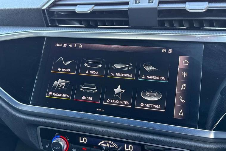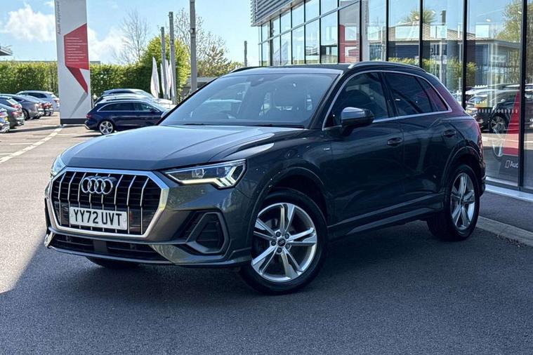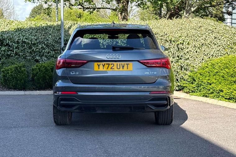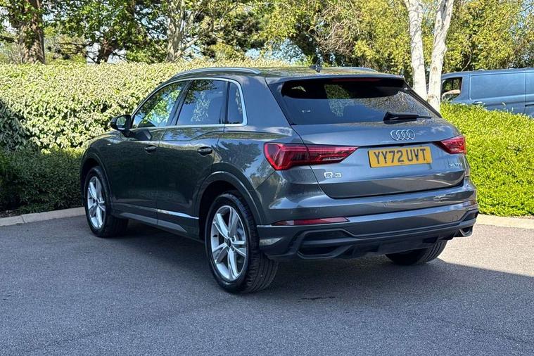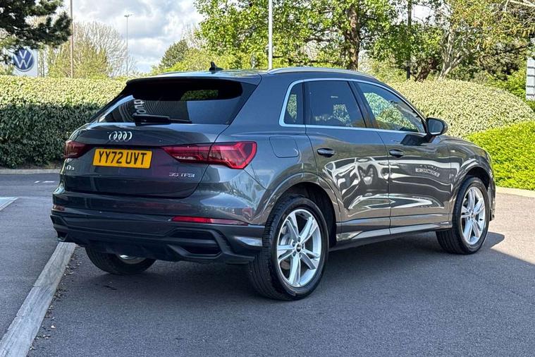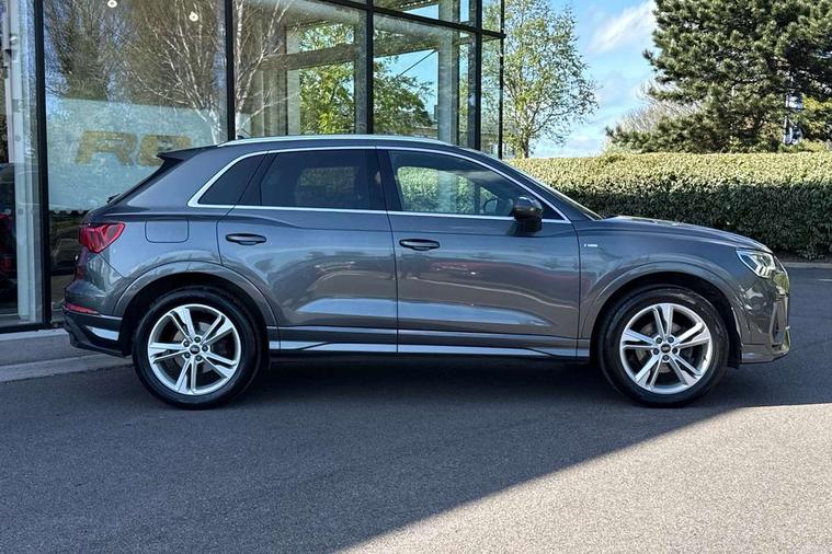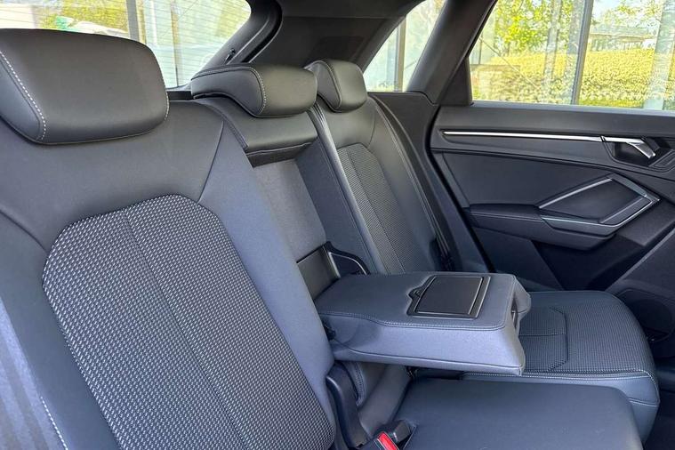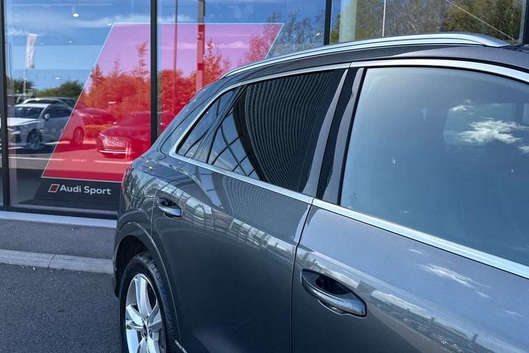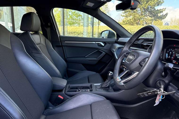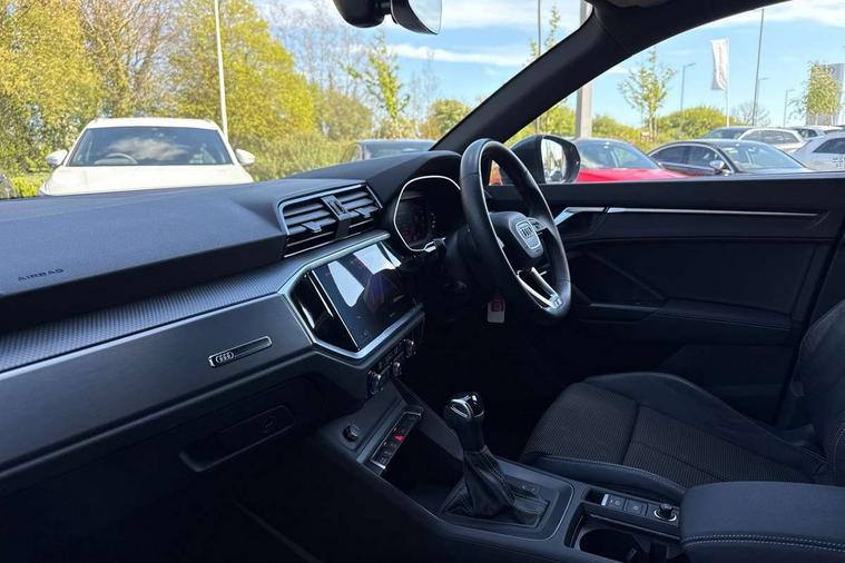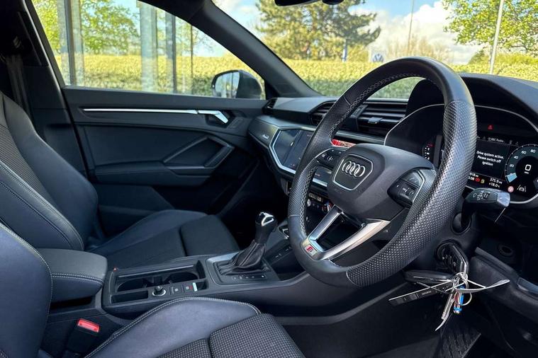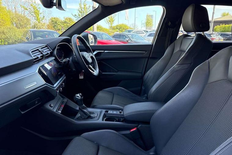 Amazon alexa Integration, Audi drive select, Audi lane departure warning, Audi Virtual Cockpit - 10.25" display, Bluetooth interface, Camera based traffic sign recognition, Legal emergency call, MMI Navigation Plus with high resolution 10.1 inch touchscreen colour display, Power operated tailgate, Progressive steering, Service interval indicator, Smartphone interface includes wireless Apple carplay/Android Auto, Start stop system with recuperation, Voice control system with natural language interaction, Sports suspension, 2 USB-C ports with charge and data functions, 6 passive loudspeakers, DAB digital radio module, Acoustic windscreen, Aluminium roof rails, Aluminium window trim, Auto dimming frameless rear view mirror, Body colour front spoiler blade, Body coloured bumpers, Electrically folding, adjustable and heated door mirrors with integrated LED side indicators and kerb view function for passenger side, Front and rear electric windows, Front fog lights, Front side air inlets in matt platinum grey, Grille vertical bars in aluminium silver/Matt, High gloss black finish B and C pillars, LED Dynamic rear indicators, LED headlights with LED daytime running lights, LED rear lights, LED third brake light, Privacy glass dark tinted rear and rear-side windows (from B-pillar backwards), Rain and light sensors, Rear diffuser grille in grained matt black, Rear diffuser strip in matt titanium black, Rear side wing doors, Rear wiper, S line badges on front wings, S Line front and rear bumpers, Side skirt insert in matt Platinium grey, Titanium black radiator grille, Variable front intermittent wipers, 12V socket in rear centre console, 3 seat bench in 2nd row, 40:20:40 folding with manual adjustment for 60:40 forwards/backwards position and backrest angle, Adjustable rear seat bench/backrest with centre armrest and cupholder, Black cloth headlining, Dual zone electronic climate control, Front and rear black floor mats with contrast stitching in rock grey, Front and rear headrests, Front and rear roof module including reading lights, Front centre armrest, Glove compartment lighting, Height and reach adjustable steering wheel, Illuminated door sill trims with S logo, ISOFIX child seat mounting for front passenger with airbag deactivation and outer rear seat including top tether attachment point for outer rear seats, Luggage compartment light, Manual front seats with height adjustment, Perforated leather gearknob, Single front passenger seat, Stainless steel luggage compartment sill finisher, Stainless steel pedals, Ambient lighting pack - Q3, Non smoking pack - Q3, 3x3 point rear seatbelts, 6 airbags - Driver, front passenger, curtain and side windows, Audi pre-sense front with pedestrain and cyclist recognition, Electrically operated child locks on rear doors, Electromechanical parking brake, Electronic stabilisation control including ABS, ASR and EDL, Front seatbelt reminder, Hill descent control, Hill hold assist, Pre sense basic, Seatbelt monitoring, Tyre pressure warning, Warning triangle and first aid kit, Anti theft alarm, Anti theft wheel bolts, Immobiliser, Remote central locking, Dark matt brushed aluminium inlay, Detail dashboard around MMI touch colour display in glass look, black with surround in aluminium look, Leatherette door armrest,