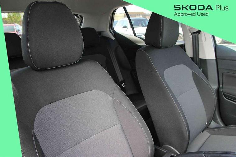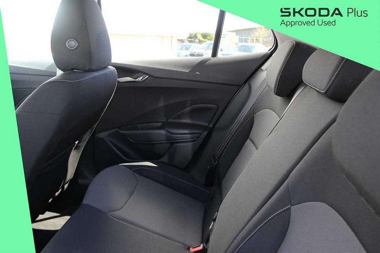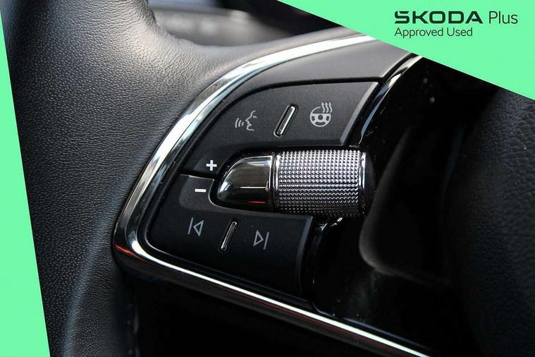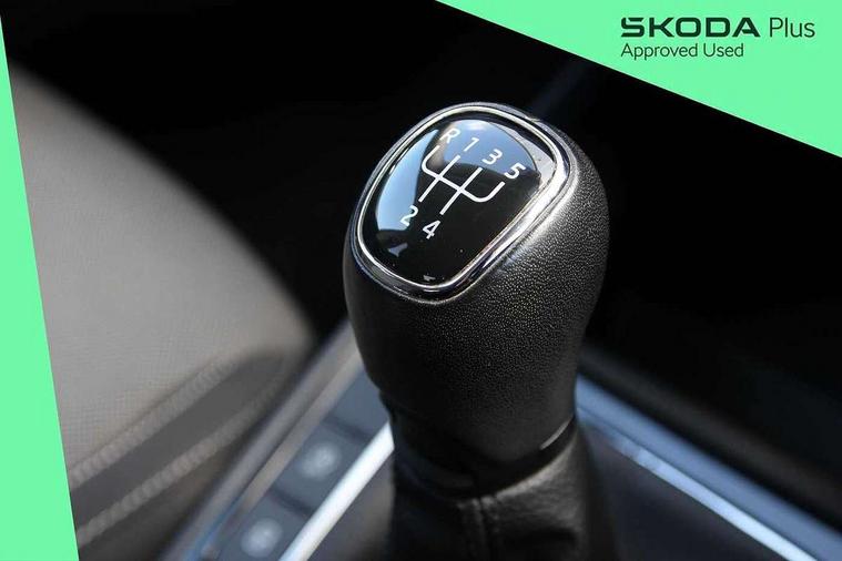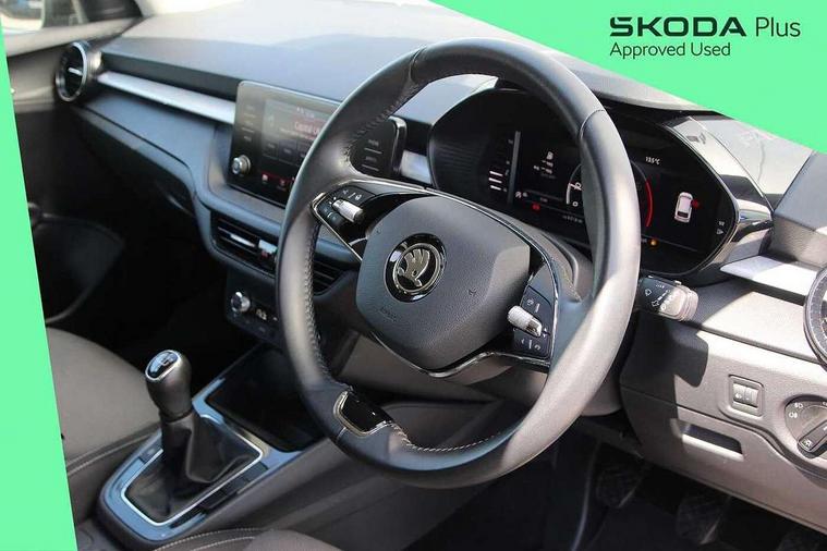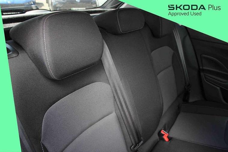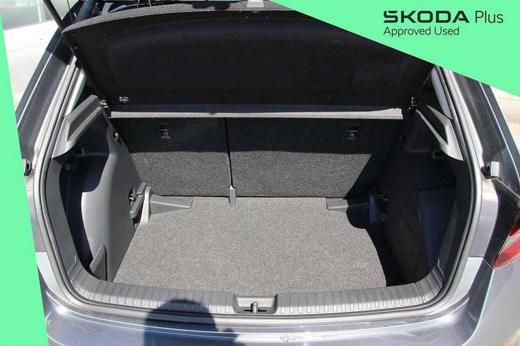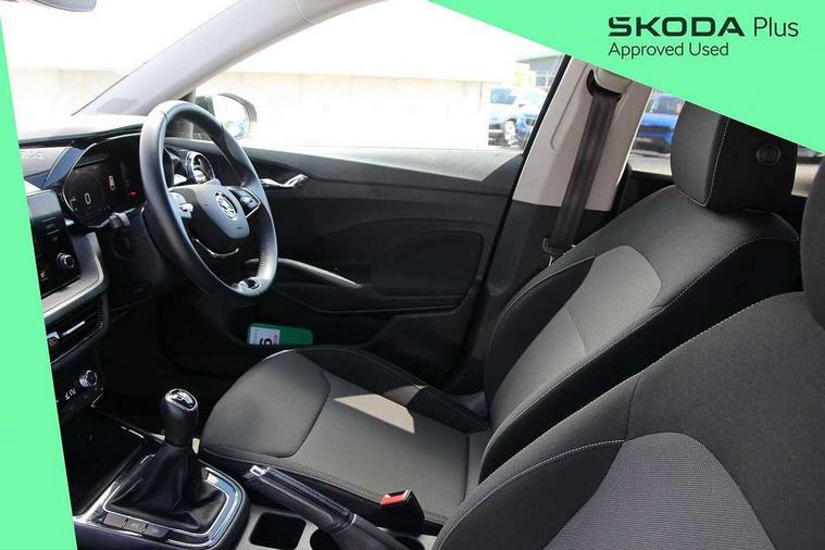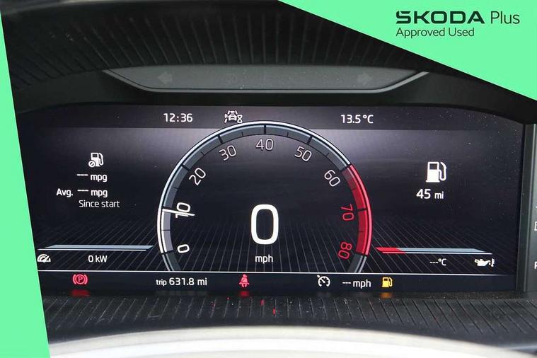 Bluetooth connection, Driver alert system - DAS, Electromechanical power steering, Exterior temperature gauge, Lane assist including road edge detection, Service interval indicator, Virtual cockpit with 10.25" colour display, 2x USB-C in the front (for data transmission and charging), 6 Speakers (4 in front and 2 in rear), Auxiliary socket for external MP3 player, Bolero radio with 8" colour display, DAB digital radio reception, Basic rear lights, Body coloured bumpers, Dimming rear view mirror with black frame, Door mirror integrated indicators, Electrically adjustable and heated door mirrors, Electrically adjustable front windows with function auto up/down, Front window wiper intermittent control, Headlight range control - Automatic, Ice scraper in fuel cap, LED daytime running lights with coming and leaving home feature, Mechanical adjustable rear windows, Privacy glass, Rear LED fog light, Rear side wing doors, Rear window wiper with washing nozzles, Roof mounted spoiler, SKODA tailgate lettering in chrome, Third brake light, 3 rear headrests, Backrest split and folding, Central console with fixed cup holder and storage box, Chrome handbrake release button, Fabric upholstery, Gearshift knob/handle in leather, Grain satin black interior door handles, Hand brake lever handle in leather, Height adjustable front headrests, Height adjustable steering wheel, ISOFIX and TopTether anchorage points to the outer rear seats, ISOFIX and TopTether on the front passenger seat, Luggage compartment lighting, Pollen filter, Rear seat bench unsplit, Single front passenger seat, Storm grey headlining, Sun visors with mirror and airbag label on passenger side, Ticket holder, Umbrella in drivers door, 3-point height adjustable front seats belts with pretensioner and force limiter, Automatic warning lights in case of crash, Driver and passengers airbag with switch off function, e-Call+, ESC including ABS, MSR, ASR, EDS, HBA and XDS, Front and rear seat belt warning, FRONT ASSIST (AEB City and AEB Inter Urban), Front side airbags, Head airbags, One tone horn, Pedestrian protection, Three rear 3-points safety seat belts with pretensioner and force limiter including stop function for outer rear seat belts, Tyre pressure monitoring system, Anti-theft alarm system including immobiliser, interior monitoring, backup horn, and towing protection, Anodized cross line upper decorative trim, Colour Edition air vents, Grain satin black central console cover, Grain satin black lower decorative trim, Satin black door and side trim panel in front, Anti-theft wheel bolts protection, Super-low rolling resistance tyres,