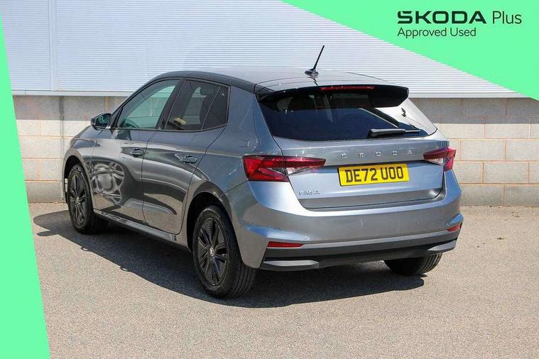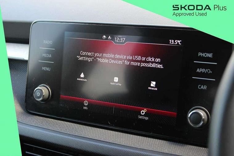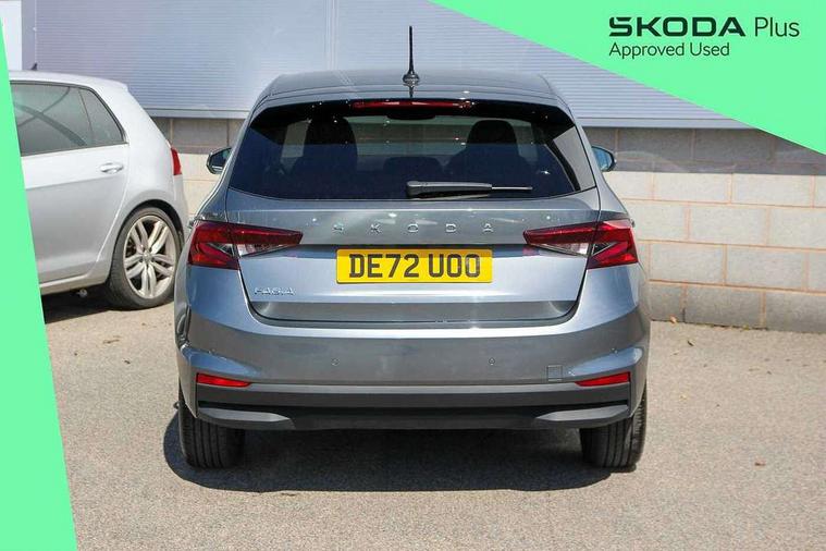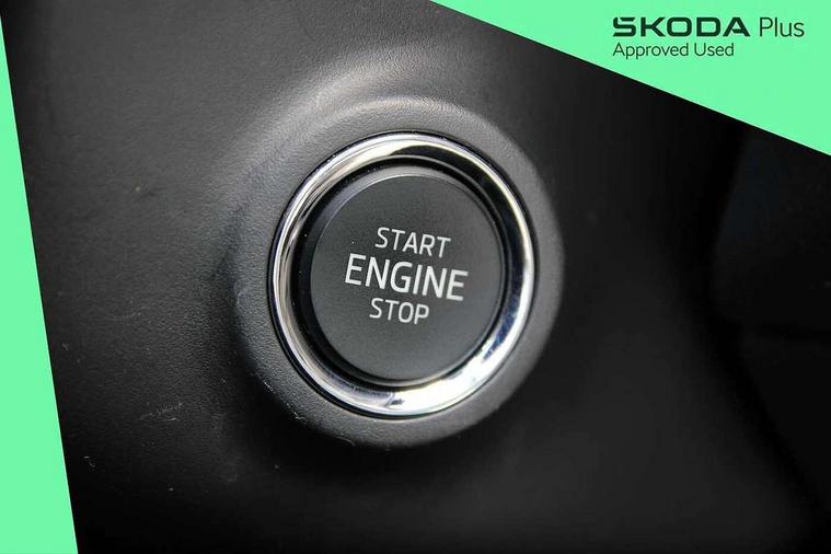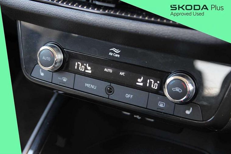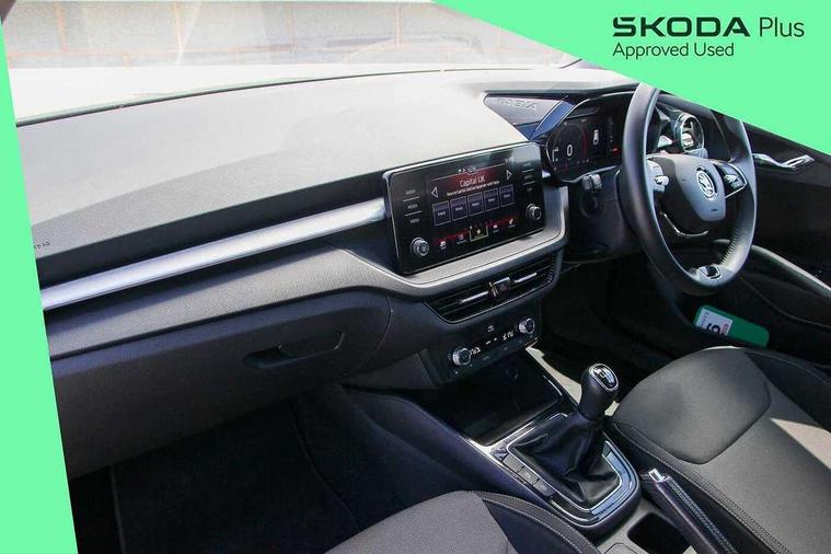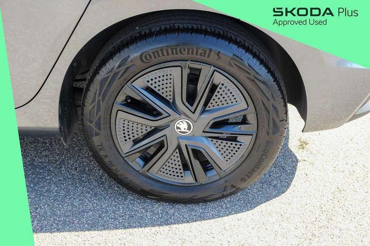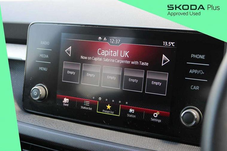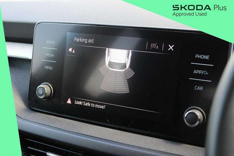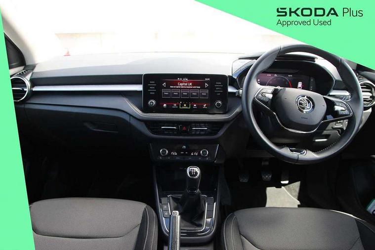 Bluetooth connection, Driver alert system - DAS, Electromechanical power steering, Exterior temperature gauge, Lane assist including road edge detection, Service interval indicator, Virtual cockpit with 10.25" colour display, 2x USB-C in the front (for data transmission and charging), 6 Speakers (4 in front and 2 in rear), Auxiliary socket for external MP3 player, Bolero radio with 8" colour display, DAB digital radio reception, Basic rear lights, Body coloured bumpers, Dimming rear view mirror with black frame, Door mirror integrated indicators, Electrically adjustable and heated door mirrors, Electrically adjustable front windows with function auto up/down, Front window wiper intermittent control, Headlight range control - Automatic, Ice scraper in fuel cap, LED daytime running lights with coming and leaving home feature, Mechanical adjustable rear windows, Privacy glass, Rear LED fog light, Rear side wing doors, Rear window wiper with washing nozzles, Roof mounted spoiler, SKODA tailgate lettering in chrome, Third brake light, 3 rear headrests, Backrest split and folding, Central console with fixed cup holder and storage box, Chrome handbrake release button, Fabric upholstery, Gearshift knob/handle in leather, Grain satin black interior door handles, Hand brake lever handle in leather, Height adjustable front headrests, Height adjustable steering wheel, ISOFIX and TopTether anchorage points to the outer rear seats, ISOFIX and TopTether on the front passenger seat, Luggage compartment lighting, Pollen filter, Rear seat bench unsplit, Single front passenger seat, Storm grey headlining, Sun visors with mirror and airbag label on passenger side, Ticket holder, Umbrella in drivers door, 3-point height adjustable front seats belts with pretensioner and force limiter, Automatic warning lights in case of crash, Driver and passengers airbag with switch off function, e-Call+, ESC including ABS, MSR, ASR, EDS, HBA and XDS, Front and rear seat belt warning, FRONT ASSIST (AEB City and AEB Inter Urban), Front side airbags, Head airbags, One tone horn, Pedestrian protection, Three rear 3-points safety seat belts with pretensioner and force limiter including stop function for outer rear seat belts, Tyre pressure monitoring system, Anti-theft alarm system including immobiliser, interior monitoring, backup horn, and towing protection, Anodized cross line upper decorative trim, Colour Edition air vents, Grain satin black central console cover, Grain satin black lower decorative trim, Satin black door and side trim panel in front, Anti-theft wheel bolts protection, Super-low rolling resistance tyres,
