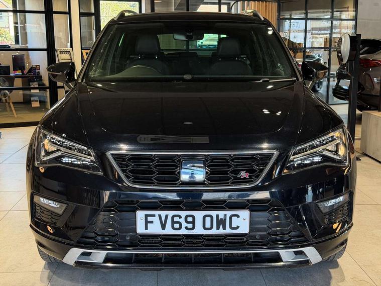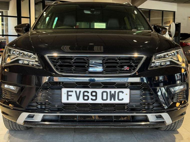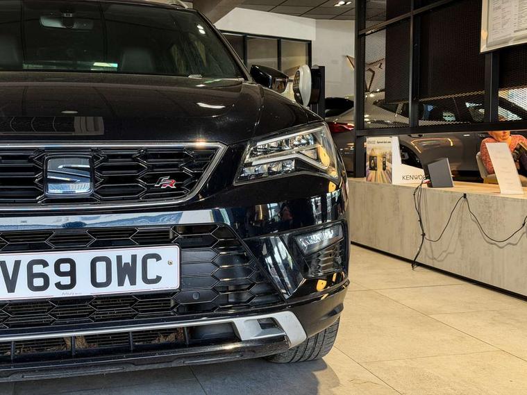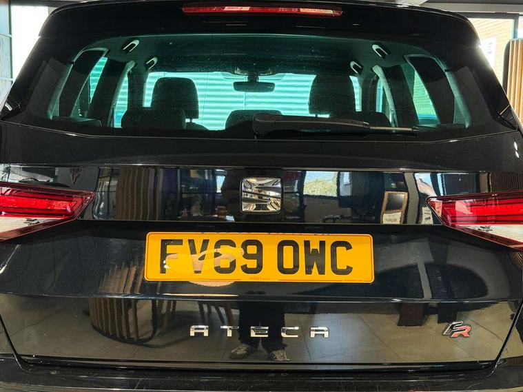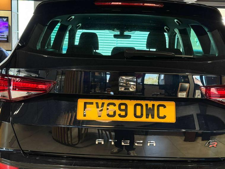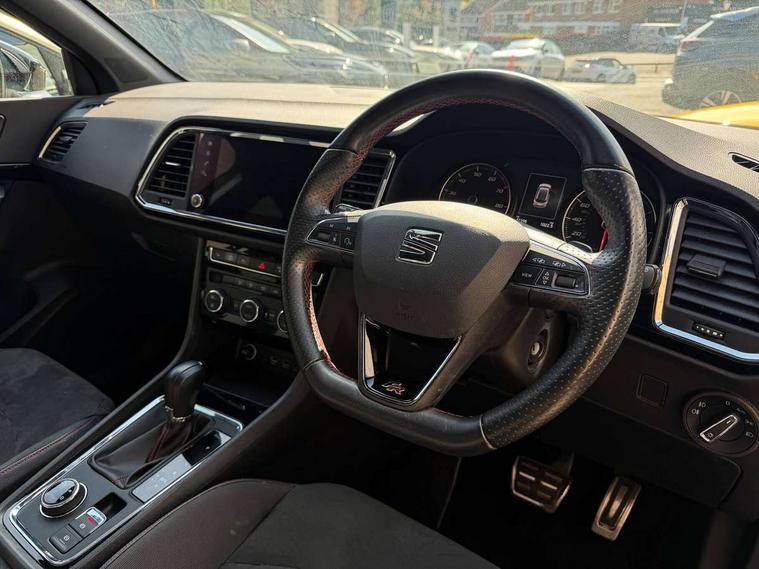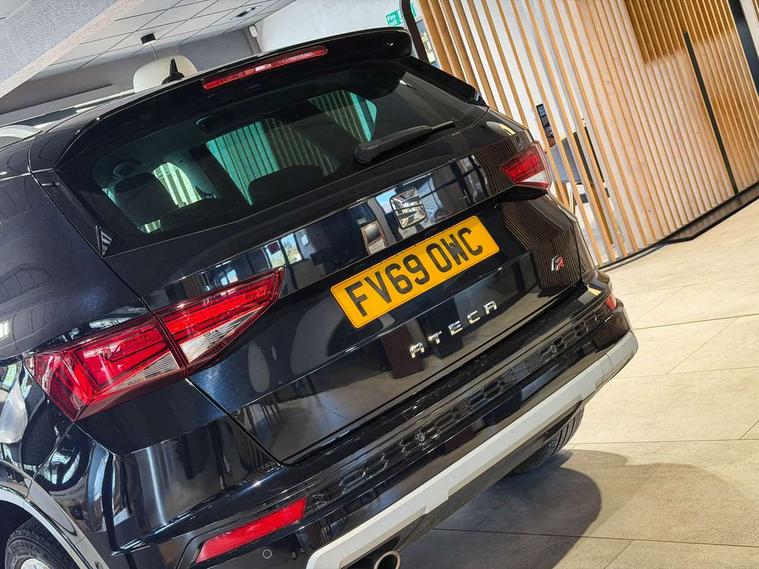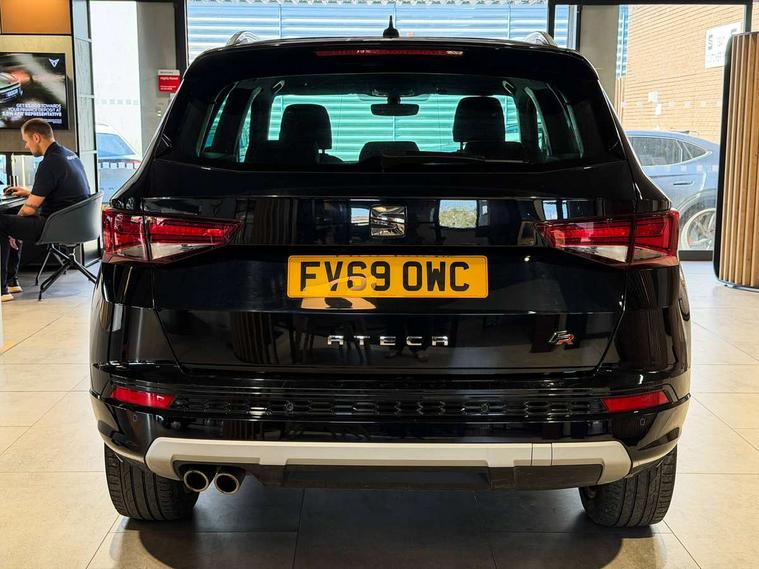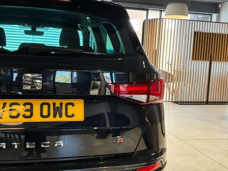 'Lights On' Reminder warning buzzer, 3.5" driver's display, Cruise control, Digital clock, Driver alert system, Front assist city emergency braking and pedestrian protection, Full Link Smartphone Integration with Mirror Link, Apple Car Play, Google Android Auto, Low fuel warning light, Multi function display, Outside temperature gauge, Power assist steering, Remote fuel flap release, RPM counter, Satellite navigation system, SEAT drive profile with driving experience button, SEAT logo boot release, Self parking functionality (includes front and rear parking sensors), Trip computer, Comfort suspension, XDS electronic differential lock, SEAT USB media cable, Steering wheel mounted audio/phone controls, Aluminium front door sills, Armrest with air outlet in rear, Auto dimming rear view mirror, Auto headlights with automatic coming and leaving home function, Body colour bumpers, Body colour door handles, Body colour door mirrors, Body coloured wheel arches, Chrome front grille frame, Chrome roof rails, Chrome side window trim, Dark tinted rear windows, Door mirrors with welcome light silhouette, Electric adjustable/heated/folding door mirrors, Frameless interior mirror, Front and rear electric windows, Front grille in glossy black, Full LED headlights, Illuminated aluminium front door sill with trim logo, LED daytime running lights, LED front fog lights, Rear fog lights, Rear LED tail lights, Rear spoiler, Rear wash/wipe, Twin chromed exhaust pipes, Visible dual exhaust pipes, 12V socket in front, 4 Lashing eyes in boot, 60/40 split folding rear seat, Adjustable front armrest with storage compartment, Aluminium pedals, Ambient spot lighting and front footwell illumination, Black roof lining, Driver and passenger seats, height-adjustable, with lumbar adjustment and height-adjustable headrests, Driver and passenger sun visor, covered and illuminated mirror, driver sun visor with card holder, Dual zone climate control, Front and rear head restraints, Front courtesy lights, Front cupholders, Front reading lights, Front seat back storage pockets, Gear shift indicator, Illuminated boot, Illuminated glovebox, Instrument lighting with brightness control, ISOFIX points in outer rear seats with top tether anchorage points, Leather steering wheel and gear knob, Microsuede upholstery with front sports seats, Multicoloured ambient lighting with LED interior illumination, Rear armrest and easy back seat release mechanism from boot, Rear reading lights, Steering wheel gearshift paddles, Storage box under drivers seat, Convenience pack - Ateca, Navigation system pack - Ateca, 3x3 point rear seatbelts, ABS, Automatic post collision braking, Driver/Front Passenger airbags, Drivers knee airbag, Electronic parking brake with auto hold, Electronic stability control, ESP+EBA, Front and rear seatbelt reminder, Front passenger airbag deactivation, Front side airbags, Hill hold control, Tiredness recognition system, Traction control, Twin curtain airbags, Tyre pressure monitoring system, 2 folding remote keys with window open/close function, Immobiliser, Locking wheel bolts, Remote central locking, Volumetric alarm with back up horn, Chrome interior detailing, 18" Performance alloy wheels,