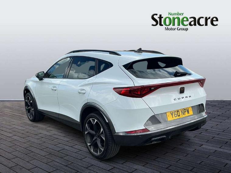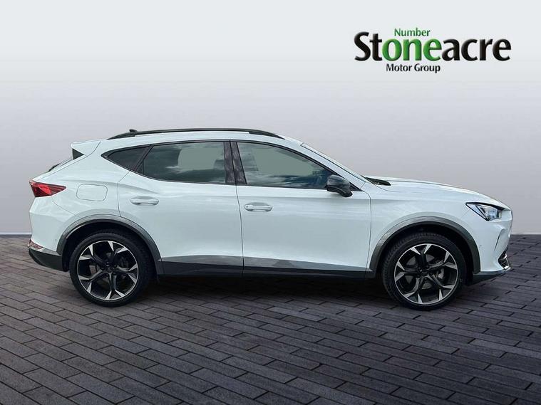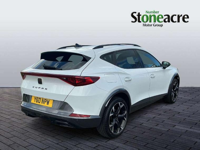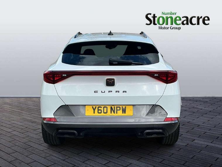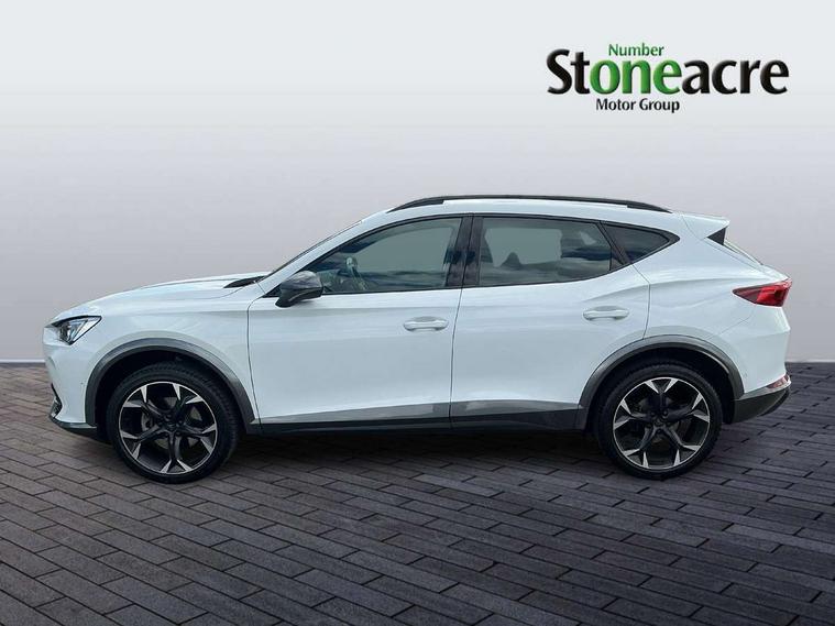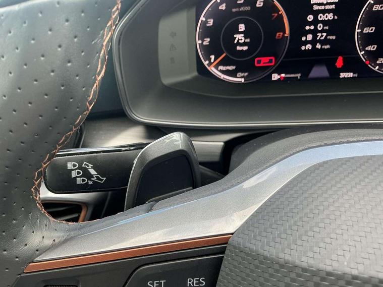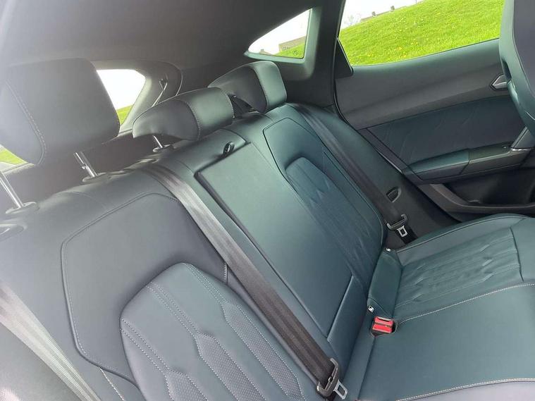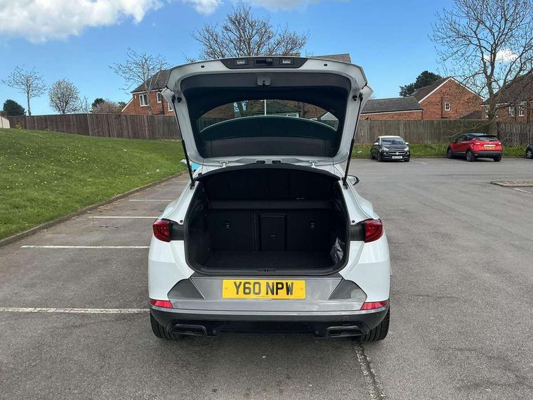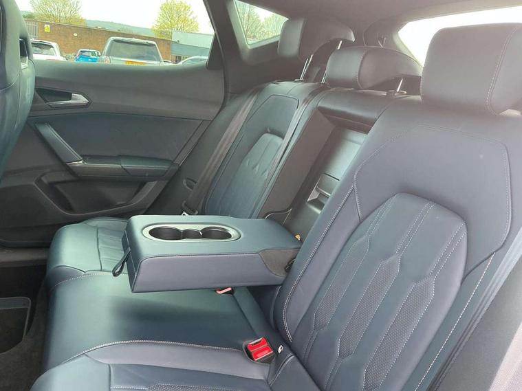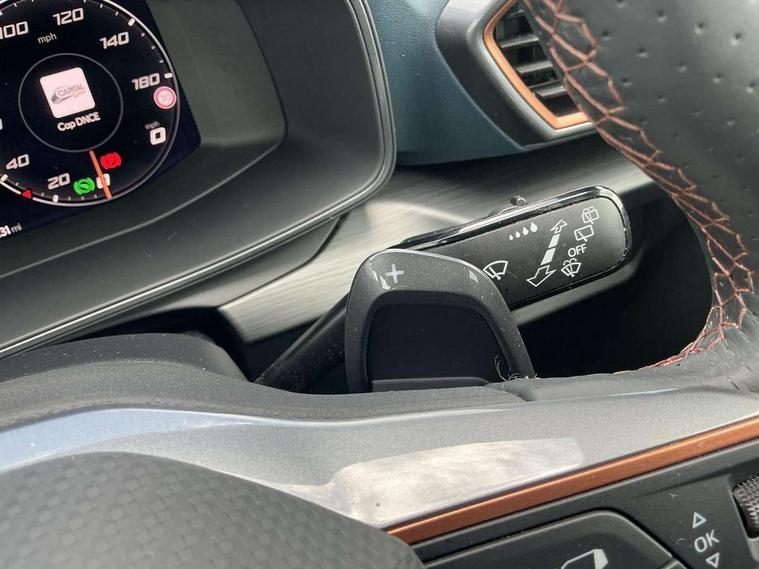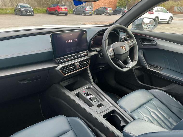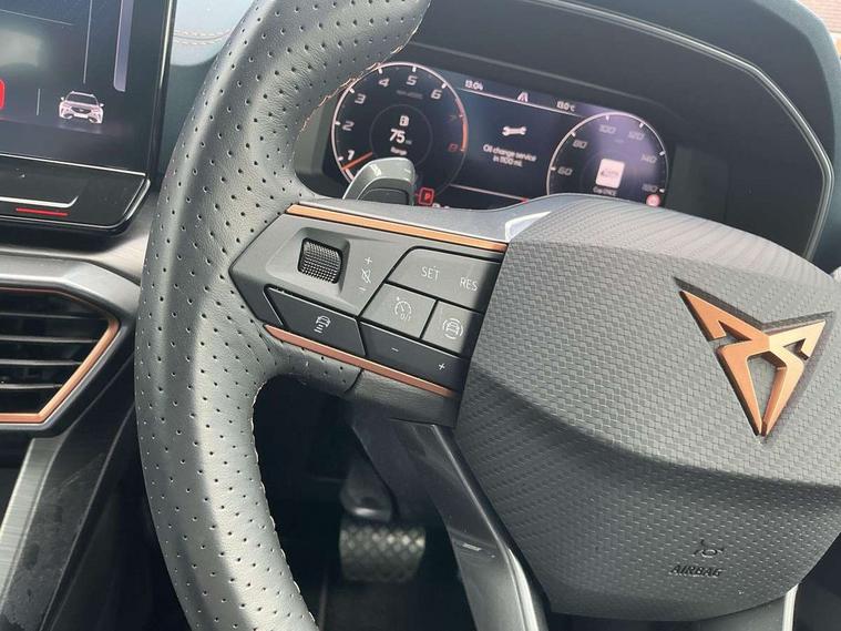 Digital cockpit and configurable dashboard, Driver alert system, Driving profile selection, Forward collision warning with automatic braking, Lane assist, Navigation system with 12'' Touchscreen Display, Park assist (inc front/rear parking sensors), PAS, Predictive adaptive cruise control with speed limiter, Rear view camera, RPM, trip computer, outside temp gauge, instrument light brightness, low fuel warning light, lights on reminder, gearshift indicator, Service interval indicator, Start/stop system with regenerative braking, Voice control system, Wired Android Auto, Wireless apple carplay, Wireless phone charger, Electronic locking differential and dynamic traction support, Standard suspension, 2 front and 2 rear USB type C sockets, Auxiliary input socket, DAB radio, Auto dimming rear view mirror, Body colour door handles, Body coloured bumpers, Dark grey wing mirror, Daytime running light with automatic headlight control and coming home feature, Dynamic headlight range control, Electric front/rear windows, Electrically adjustable heated and folding door mirrors with memory function, Front fog lamps with cornering function, Gloss black roof rails and window surrounds, LED Headlights, LED Taillights with dynamic indicator, Rain sensing wipers, Rear diffuser with black simulated exhaust pipes, Rear side wing doors, Rear wash/wipe, Third brake light, Tinted rear windows, Welcome lights, 12v power supply in centre console, 12V socket, 12v socket in loadspace, 2 front and 2 rear reading lights, 230V socket, 3 seat bench in 2nd row, 60/40 split rear bench seat with armrest and mechanical seat release, Black headlining, Dust/pollen filter, Front and rear head restraints, Front centre armrest, Height/reach adjust steering wheel, Illuminated interior front door sills, Illuminated sunvisor with mirror, Isofix, Leather multi function heated steering wheel with gear shift paddles, Luggage tie-down hooks, Single front passenger seat, Three zone climate control with control panel in rear, Variable luggage/load compartment floor, Wraparound lighting, Genuine Nappa leather Pack - Cupra, 3 point seatbelts on all rear seats, ABS, Brake control system - ESC and brake booster, Child proof door locks, Driver and front passenger airbags with front passenger airbag de-activation, Electronic parking brake, Front and rear disc brakes, Front side curtain airbags, Hill hold control, Public e-call, Seat belt reminder for front and rear seats, Tyre pressure monitoring system, Anti theft alarm system, Keyless entry and start system (KESSY), Locking wheel bolts, Copper and aluminium interior detailing, 19" 'Exclusive' machined sport matte black and silver alloy wheels,