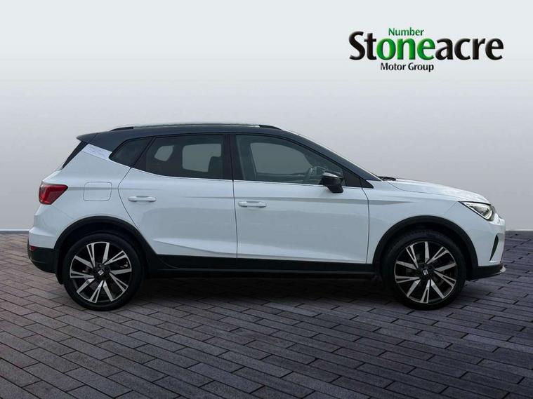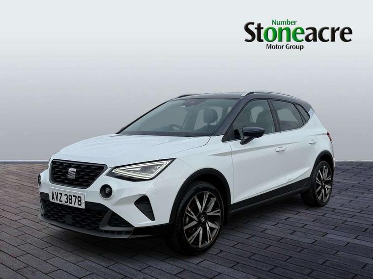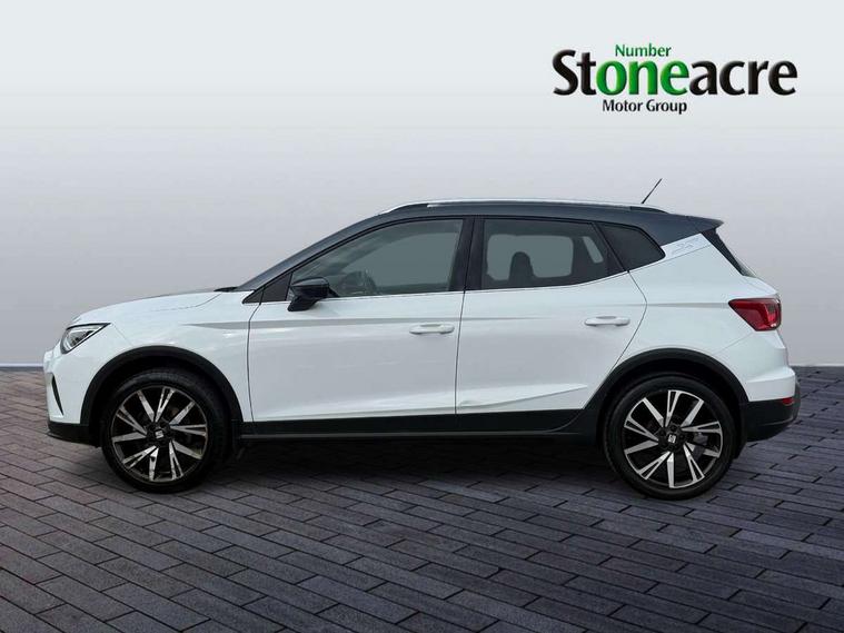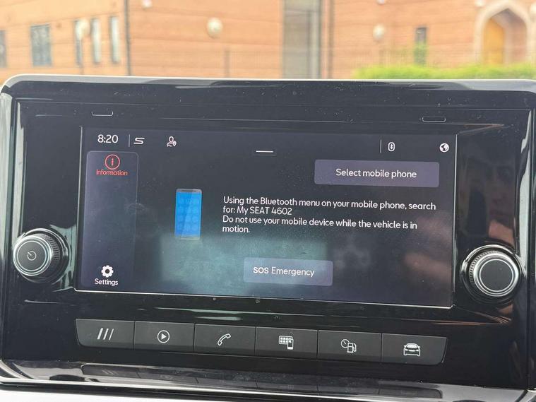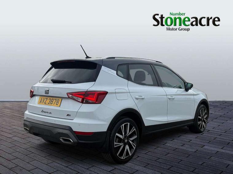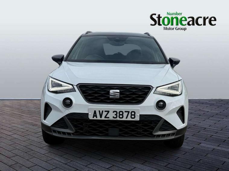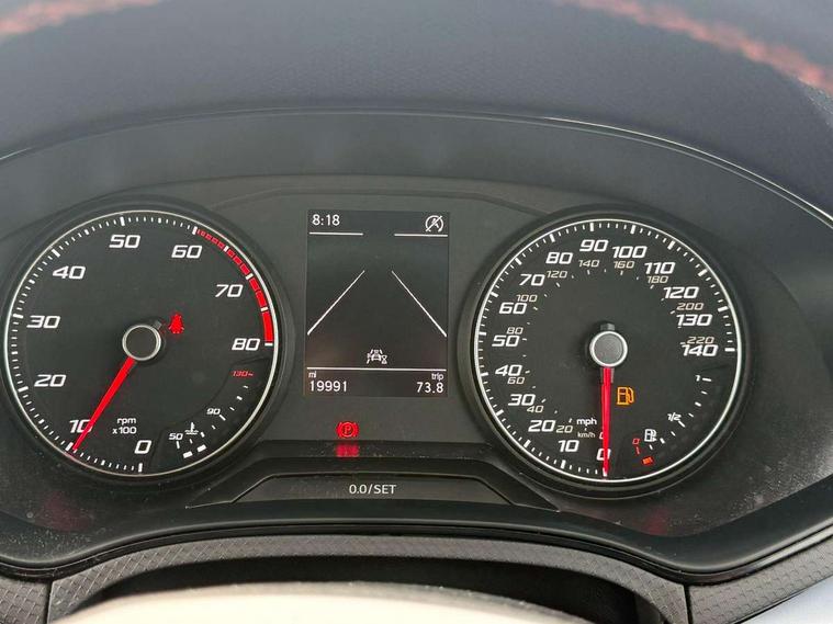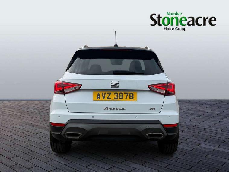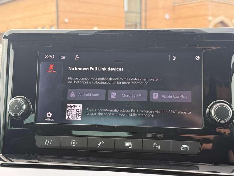 'Lights On' Reminder warning buzzer, Analogue cockpit with physical dials, Digital clock, E-call, Electric speed sensitive power steering, Full Link Smartphone Integration with Mirror Link, Apple Car Play, Google Android Auto with USB Type C cable for Apple and Android compatibility, Lane keeping system, Low fuel warning light, Outside temperature display, Rear parking sensor, RPM counter, Seat connect with safety, service and remote, SEAT Drive profile - Four different models normal-sport-eco-individual, steering response, throttle response, Trip computer, Wireless phone charger, Bluetooth interface for hands free and audio streaming, DAB digital radio and AM/FM radio, Media system with 8.25" colour touchscreen with USB port (type c), Steering wheel mounted audio controls, Anti theft roof antenna, Automatic activation of hazard warning lights, Body coloured bumpers, Body coloured door handle inserts, Chrome roof rails and window surrounds, Dark tinted rear windows, Dimming rear view mirror, Electric front/rear windows, Electrically adjustable and heated door mirrors, Front fog lights with cornering function and rear fog light, FULL LED automatic headlights with dynamic headlight range control, coming and leaving home, LED daytime running lights, LED rear tail lights and licence plate lights, Protective side mouldings, Rear side wing doors, Rear spoiler, Rear window wash/wipe, Roof colour door mirrors, Third brake light, Twin exhaust pipe styling hidden exhaust pipe, Visible VIN plate, Windshield wiper with intermittent control and potentiometer, 2 cupholders, 3 seat bench in 2nd row, 60/40 split folding rear seat, Aircare filter, Black interior roof, Double boot floor, Driver sunvisor with covered mirror + card holder, Dual zone climate control, Front comfort seats, Front courtesy light with 2x front and 2x rear reading lights, Gear shift indicator, Height adjustable front seats, Height/reach adjustable steering column, Illuminated boot, Instrument lighting with brightness control, Interior ambient lighting, Interior light in footwell, central console and door panel, ISOFIX points in outer rear seats with top tether anchorage points, Microsuede cloth upholstery, Passenger sunvisor with vanity mirror, Perforated flat bottomed leather steering wheel/gear knob/handbrake with red stitching and FR logo, Single front passenger seat, Two front and three rear height adjustable headrests, Interior chrome pack - Arona, 3 point seatbelts on all rear seats, ABS, Active front headrests, Child locks on rear doors, Driver and front passenger airbags with front passenger airbag de activation, front side and curtain airbags, Electronic stability control, Emergency Brake Assist (EBA) and front assist, Front and rear seatbelt reminder, Hill hold control, Multi-Collision braking, Tiredness recognition system, Traction control, Tyre pressure monitoring system, Alarm with back-up horn, Electronic engine immobiliser, KESSY Keyless entry and go, Locking wheel bolts, Remote central locking + deadlocks, Tow away protection, Titan black dashboard,