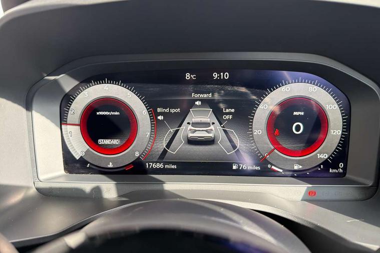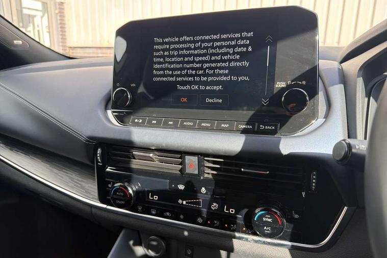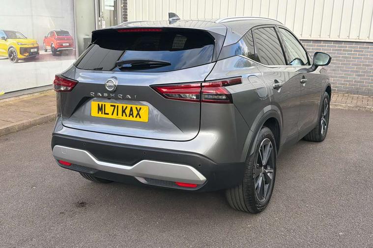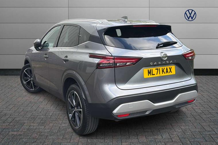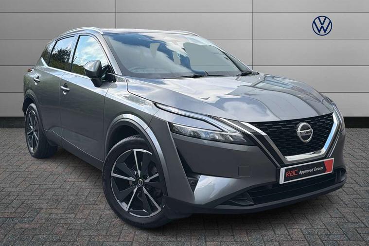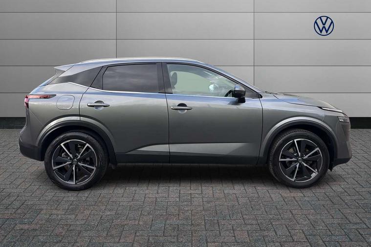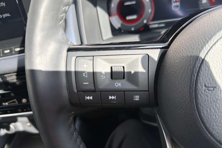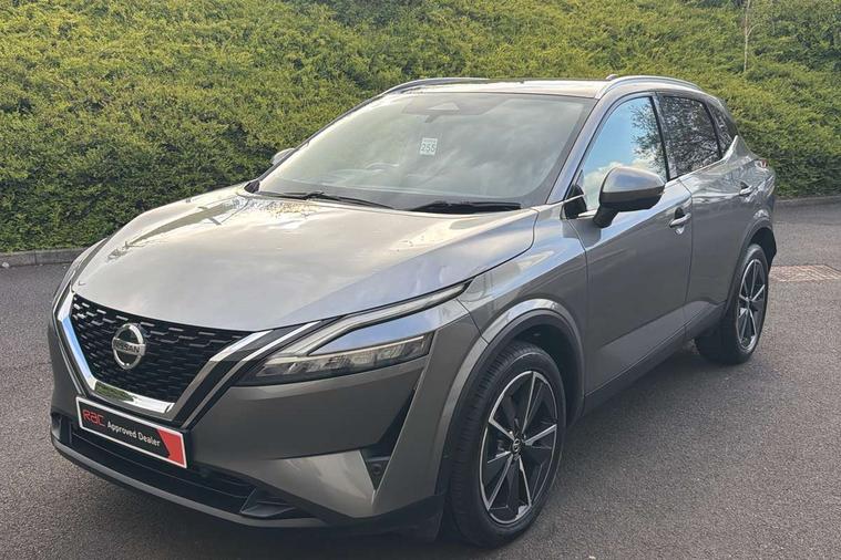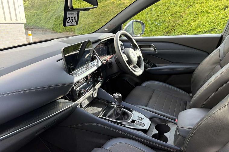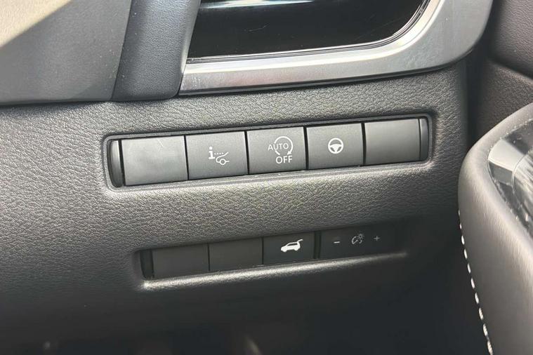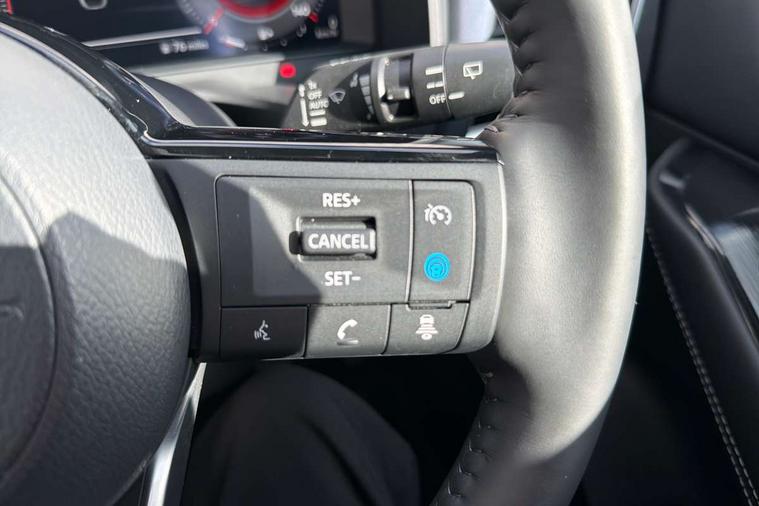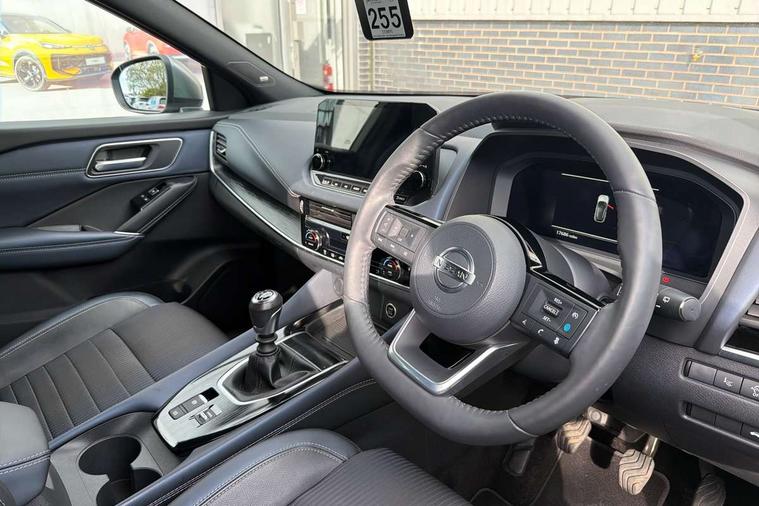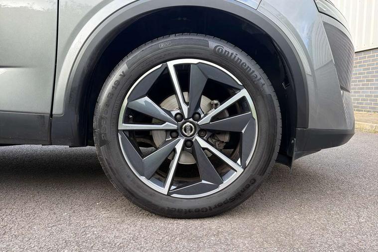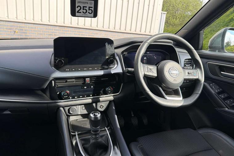 Blind spot warning, Drive modes (sport, normal, eco), Electric speed sensitive power steering, Emergency and breakdown call, Front and rear parking sensors, Full Digital 12.3" TFT Digital Combimeter, Hands free power tailgate, Idle stop/start system, Intelligent Cruise control (ICC), Intelligent driver alert system, Intelligent forward collision warning, Intelligent lane intervention, Lane departure prevention, Lane departure warning system, Moving object detection, Push button starter, Rear cross traffic alert, Traffic sign recognition with legal speed adjustment, Trip computer, 6 speakers, AM/FM audio system with DAB, Bluetooth audio streaming, Front USB connections (Type-A and Type-C), Rear USB charging only ports (Type-A and Type-C), Auto dimming rear view mirror, Auto rear wiper when reversing, Body colour mirror caps, Body coloured door handles, Bodyside mouldings, Chrome side window finisher, Electric auto folding door mirrors, Electrically adjustable and heated door mirrors with LED turn indicator, Fixed panoramic glass roof with electric sunshade, Follow me home headlights, Intelligent auto headlights, LED daytime running lights, LED signature rear lights, One touch front and rear electric windows with remote opening and closing, Partially body coloured bumpers, Privacy glass, Rear roof spoiler, Rear styling plate, Roof rails, Shark fin antenna, Splash free rain sensing wipers, Super UV and infrared cut glass, Three blink turn signal, 12v power socket in dashboard and luggage, 2 way electrical driver lumbar adjustment, 2x Rear coat hooks, 3 rear headrests, 4 grab handles, 6 Luggage hooks - 4 on floor, 2 on side, 60/40 split folding rear seat, 8 way electric adjustable drivers seat, Ambient lighting around centre console, Ambient lighting in front doors, Centre console storage tray, Chrome interior door handles, Cloth/syntech leather monoform upholstery, Dark headlining, Driver and front passenger sunvisors with illuminated vanity mirrors, Driver seat back pocket, Dual zone automatic climate control with pollen filter, Front centre console and armrest, Front cupholder, Front door with bottle holders, Glovebox with light, Hard trunk cover, Height adjustable front headrests, Leather shift knob, Leather steering wheel, Luggage board system, Luggage space lighting, Manual lumbar support on passenger seat, Manually adjustable passenger (slide recline + lifter), Multifunction steering wheel, Passenger seat back pocket, Rear armrest with 2 cupholders, Rear door bottle holders, Soft PVC kneepad, Steering wheel switches, Tilt/telescopic adjustable steering wheel, Two rear isofix child seat anchorage points with top tether, Welcome light and doors with console tray ambient lighting, Drive assist pack - Qashqai, Heat pack - Qashqai, Tech Pack (Drive Assist + HUD), 3x3 point rear seatbelt pretensioners + load limiters, ABS, ESP, EBD and brake assist, Active brake limited slip, Auto hold function, Child locks on rear doors, Curtain and front side, far side airbags, Driver and passenger airbags, Driver, passenger and 2nd row rear seat belt reminder, Electronic parking brake, Front seatbelt pretensioners + load limiters, Height adjustable front seatbelts, Hill start assist, Intelligent blind spot intervention, Intelligent front emergency braking with pedestrian, cyclist recognition and junction assist, Intelligent rear automatic braking, Tyre pressure monitoring system, Vehicle dynamic control, Capless fuel filler, Engine immobiliser, Nissan i-key, Remote central door locking with deadlocking, Thatcham Cat.1 alarm, 19" Alloy wheels,