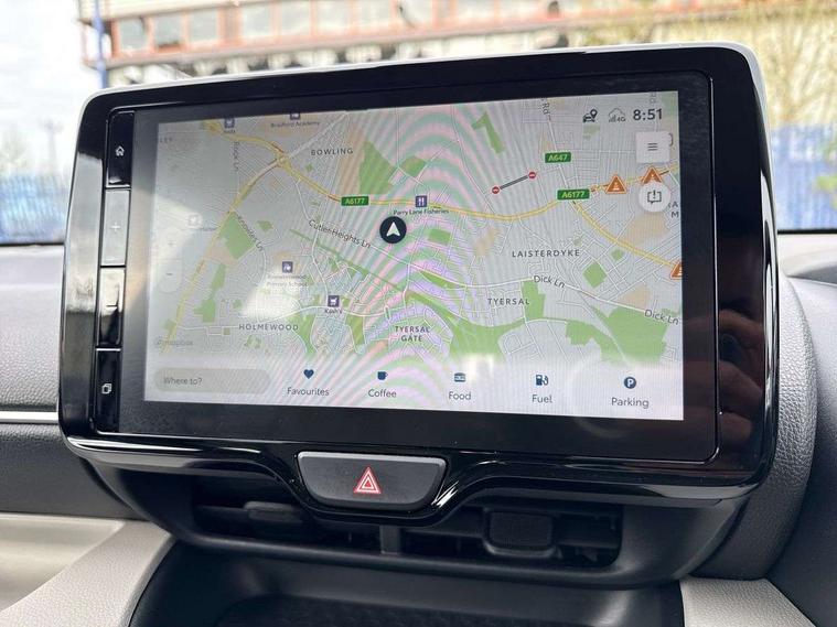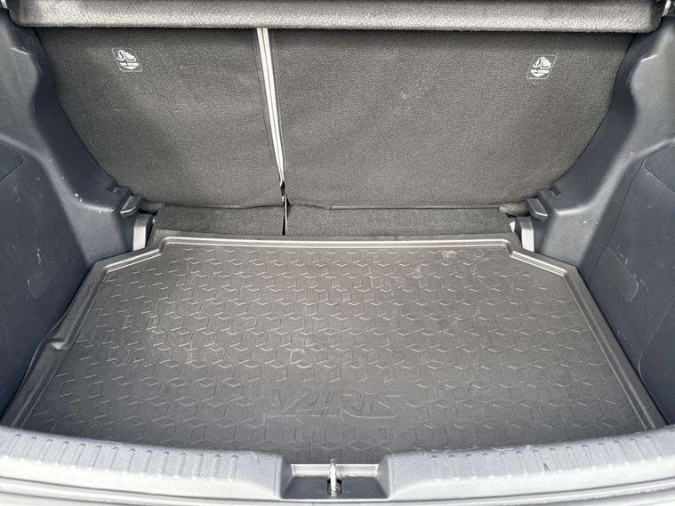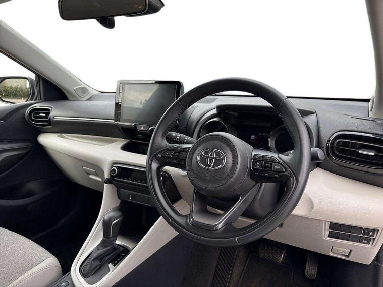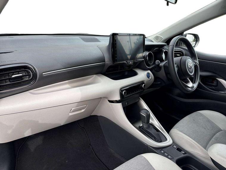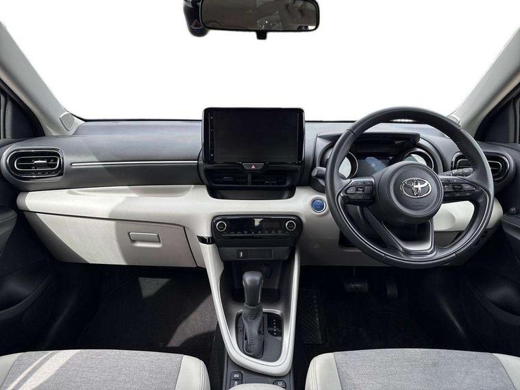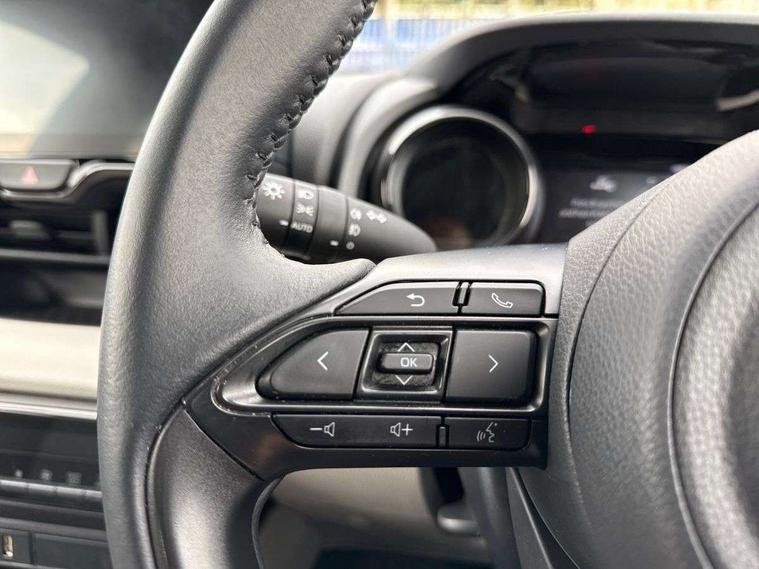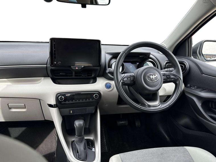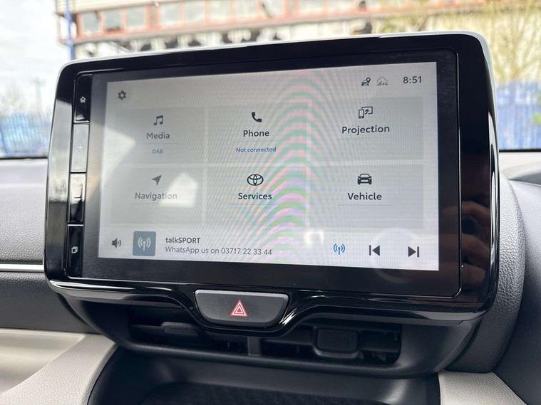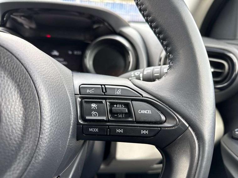 Adaptive cruise control, Adjustable speed limit with speed warning, Blind spot monitoring, Bluetooth connectivity, Colour binocular inspired displays with digital speedometer, E-call, Electric power steering, Hybrid energy display, Multi information display switches on steering wheel, Reversing camera, Smartphone integration with Apple CarPlay and Android auto, Tailgate, Touch 2 navigation system, Voice recognition, Vehicle Stability Control (VSC), 6 speakers, 9" HD multimedia display touch screen with Toyota smart connect, USB connection, Acoustic windscreen glass, Auto windscreen wipers, Automatic headlights, Automatically retractable door mirrors, Body coloured door mirrors, Electric adjustable heated door mirrors, Follow me home headlights, Front auto power windows with anti jam protection, Full LED rear lights, LED daytime running lights, LED front fog lights, LED front light guide, LED Headlights, LED High mounted stop lamp, LED Indicators, LED rear light guide, Manual headlight levelling, Painted chequered front grille, Rain sensor, Rear auto power windows with anti jam protection, Rear privacy glass, Rear side wing doors, Rear spoiler, Rear wiper, Satin lower front grille, Shark fin antenna, Turning signal integrated indicators in door mirrors, Variable front intermittent wipers, 3 adjustable rear headrests, 3 spoke leather steering wheel, 60/40 split folding rear seat, Active headrests, Adjustable boot height, Coat hooks in rear grab handles, Cup holders (2 front & door), Data Communication Module (DCM) connected services, Dual zone automatic air conditioning, Fabric seat with partial synthetic leather upholstery, Front armrest, Front sport seats, Glovebox, Grey roof lining, Height adjustable driver's seat, Height adjustable passenger seat, Isofix seat fixing, Leather gearshift, Map pockets on the backs of the front seats, Pollen filter, Shopping bag hooks, Single front passenger seat, Tilt/telescopic steering column, Parking pack - Yaris, 3 point seatbelts on all rear seats, ABS+EBD+Brake assist, Electronic parking brake, Emergency brake light system (EBS), Front passenger airbag on/off switch, Front seatbelt reminder, Hill start assist control (HAC), Rear child proof door locks, Rear seat belt reminder, Supplemental Restraint System (SRS) 8 airbags: Driver & passenger's airbags, dual side curtain airbags, side impact airbags, front centre airbag, Toyota Safety Sense 2, Precollison + Night time Pedestrian & Cyclist Detection, Lane Trace Assist, Auto High Beam, Intelligent ACC & Road Sign Assist, Tyre pressure warning system, 2x Master key, Alarm/immobiliser, Keyless smart entry with push button start, Remote AC via MyT, Remote locking via MyT, Remote powered central double locking doors, Satin chrome interior styling, Soft touch instrument panel, Space saver spare wheel,