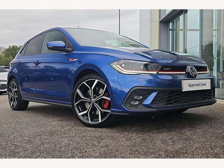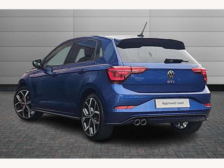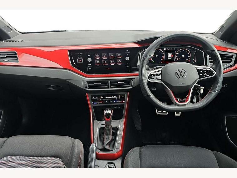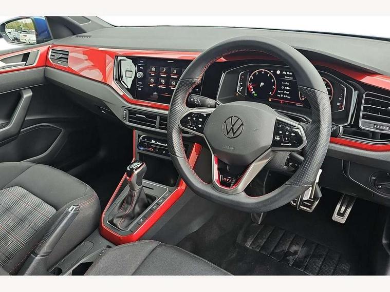 Adaptive cruise control with follow-to-stop and speed limiter, Bluetooth mobile phone interface, Digital Cockpit Pro with 10.25" Display, Driver alert system, Dynamic road sign display, Eco mode, Emergency call service, Power assisted speed sensitive steering, Preparation for We connect and We connect plus, Speedo and rev counter, electronic odometer, trip, service interval display and fuel gauge, Travel Assist - Lane keeping system and traffic jam assist, Travel assist including emergency assist, Trip computer, Warning signal and warning light for front and rear seatbelts not fastened, Washer fluid level indicator, Wireless app connect, Adaptive chassis control, Front wheel drive, Heavy duty rear axle, Rear shock absorpion sports version, Sports select suspension lowered by 15mm, Start-stop system with battery regeneration (recuperation - energy recovery during braking), DAB Digital radio, Diversity antenna for FM reception, Front and rear 6 speakers, Body colour bumpers, Body colour door handles, Electric front windows, Front scuff plates in aluminium with GTI logo, Heat insulating darkened glass in side and rear windows, Heat insulating glass windscreen, Power folding adjustable/heated exterior mirrors and front passenger exterior mirror lowering function, Rear electric windows, Rear fog light, Rear side wing doors, Rear windscreen washer and wiper with interval delay, Sport bumpers with air intakes with honeycomb structure, Third brake light, Twin chrome exhaust tailpipes, 12V power socket in centre console, 2 USB-C ports in the front, 2 USB-C charging sockets on the center console in the rear, 3 rear head restraints, 60/40 split folding rear seat and rear seat bench not split, Air care climatronic air conditoning system with active combination filter and 2-zone temperature control, Black roof lining, Ceramique headliner, Chrome plated radiator grille inserts, air vent surrounds and light switch surrounds, Door and side trim panel, Driver and front passenger seat height adjustment, Driver/passenger sunvisors with illuminated vanity mirrors, Front + rear carpet mats, Front centre armrest, Front footwell illumination, Front seat backrest storage pockets, GTI sports gearshift knob in aluminium leather, Handbrake lever handle in leather, Isofix child seat preparation easy-fit (for two outer rear seats, and front passenger seat) compatible with I-size, LED interior light with switch off delay and dimmer, 2 reading lights front and rear, Luggage compartment cover, Luggage compartment floor, Luggage compartment lighting, Single front passenger seat, Stainless steel pedals, Standard pedal cluster, Three spoke leather wrapped multifunction sports steering wheel with shifting paddles, IQ LED matrix headlights pack - Polo, Light and sight pack - Polo GTI, Sports suspension pack - Polo, 3 point height adj front seatbelts + pretensioners, 3x3 point rear seatbelts, ABS, Driver and front passenger airbag with front passenger airbag deactivation, Drivers and front passengers safety optimised head restraints, ESC (Electronic stability control) + EDL (Electronic Differntial lock) and ASR (Traction control), Extended and predictive pedestrian/ cyclist protection, Front and rear disc brakes with red brake calipers, Front curtain and side airbags with center airbag, Hill hold control, Manual child lock in rear doors, Two tone horn, Tyre pressure loss indicator, Alarm with interior protection, Anti-theft alarm system with interior monitoring, backup horn, and towing protection, Anti-theft wheel bolts, Electronic engine immobiliser, Chrome applications on rotary light, mirror adjustment, window regulator switches, outlet with frame in black, Low rolling resistance tyres,