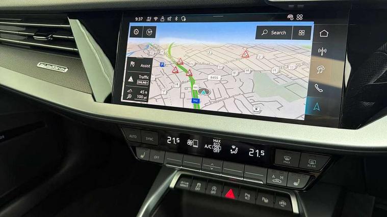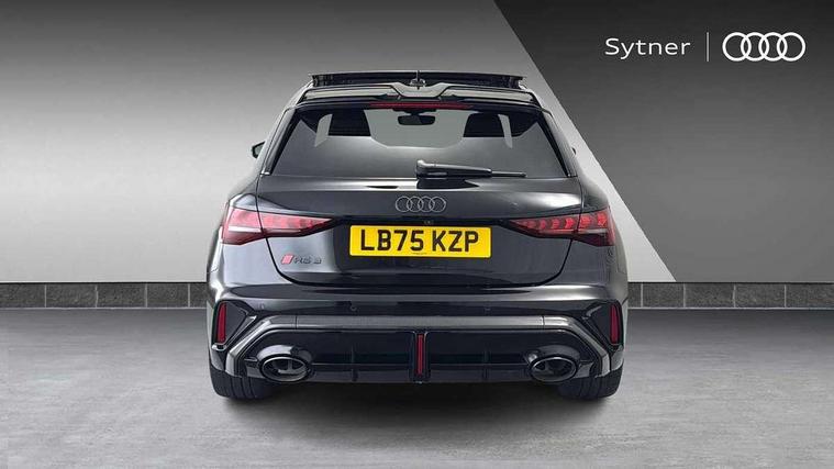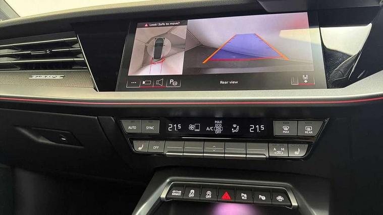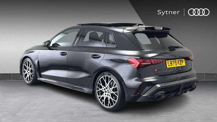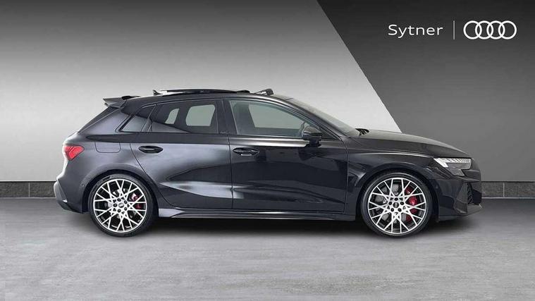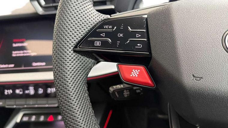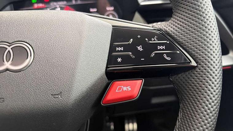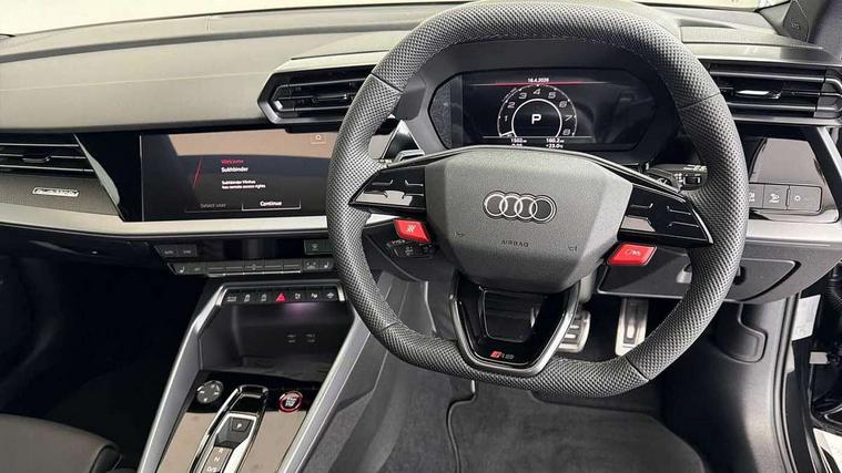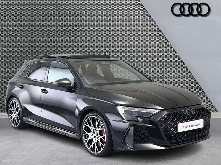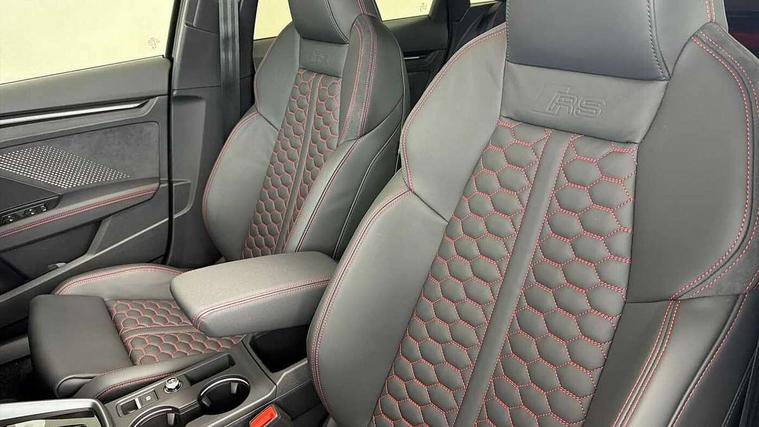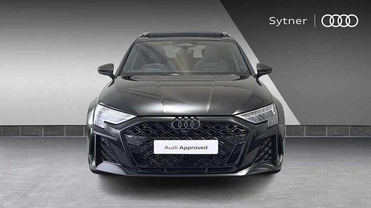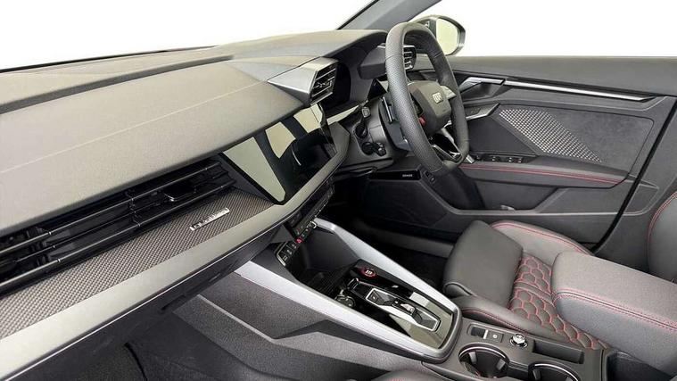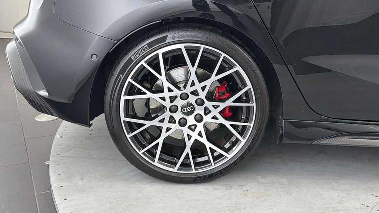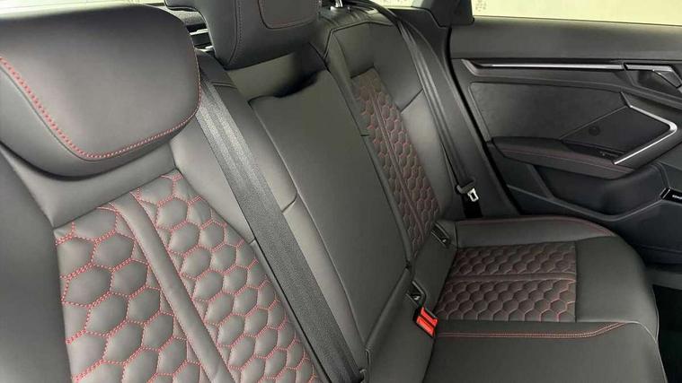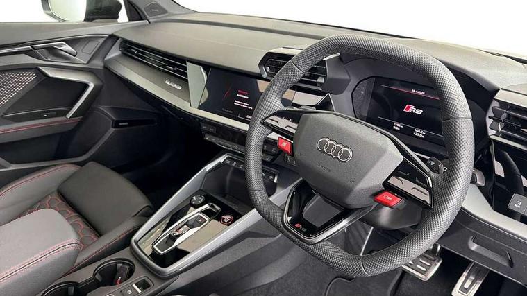 Adjustable speed limiter, Audi drive select comfort, auto, dynamic and efficiency, Audi virtual cockpit plus with RS specific design and 12.3" display with additional graphic display options, Automatic start/stop system with recuperation, Bluetooth interface, Camera based traffic sign recognition, Collision avoidance assistant, Driver attention and fatigue detection, e-Call (emergency call), MMI Navigation Plus with high resolution 10.1" colour touch screen display, Progressive steering, RS specific driving modes - RS Individual, RS Performance and RS Torque rear, Service indicator, Smartphone interface with app store includes wireless Apple carplay, Android auto and Amazon alexa integration, Trip computer, Voice control system with natural language interaction, Adaptive suspension, Increase of top speed to 174 mph, Quattro permanent four wheel drive, Audi Phonebox light with wireless charging, DAB Digital radio, USB ports with charging function in the rear, Audi beam LED projection of RS logo on ground as you exit, Auto dimming frameless rear view mirror, Carbon door mirror housings, Electrically adjustable/heated/folding/auto dimming door mirrors with integrated LED indications + kerb view function for passenger side, Engine compartment cover with carbon trim, Exterior model badging, Front electric windows, Heat insulating glass windscreen, LED 3rd brake light, Light and rain sensors, Privacy glass - dark tinted rear window, rear door and side windows, Rear electric windows, Rear side wing doors, Rear wiper, Roof edge spoiler in carbon, RS sport exhaust system - dual branch with flap control and gloss black oval tailpipe trims, 12V socket and storage compartment in front centre console, 3 seat bench in 2nd row, 3 Spoke flat top and bottomed black leather multi function steering and gear shift paddles, 3-zone deluxe automatic air conditioning, 40/20/40 split folding rear seat bench, Black cloth headlining, Black front and rear floor mats, Front and rear headrests, Front centre armrest, Front door sill trims with RS 3 logo, Heated front seats, Height and reach adjustable steering wheel, Manual boot compartment lid, Rear centre armrest with cupholder, Seat side bolsters, Single front passenger seat, Stainless steel pedals and front footrest in black, Vanadium look - Interior door handles, Door trim, power latching, Air vents, window controls, mirror adjust, rear door lock, Selector lever in centre console, Black Styling plus package - RS3, Extended ambient lighting package Pro with Multi-coloured contour lighting of instrument panel - RS3, RS exterior features pack in carbon and gloss black - RS3, Storage package - RS3 Sportback, 3x3 point rear seat belts, Driver and front passenger airbag with passenger airbag deactivation, Electronic Stabilisation Control (ESC) including ABS, ASR and EDL, First aid kit with warning triangle and 2 safety vests, Hill hold assist, Pre-sense front with pedestrian and cyclist detection, Seatbelt monitoring, Tyre pressure loss indicator, Anti theft alarm, Anti-theft wheel bolts, Electronically operated child locks, Immobiliser, Black dashboard, Inlays in carbon atlas structure, Tyre repair kit,
