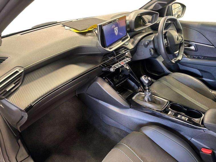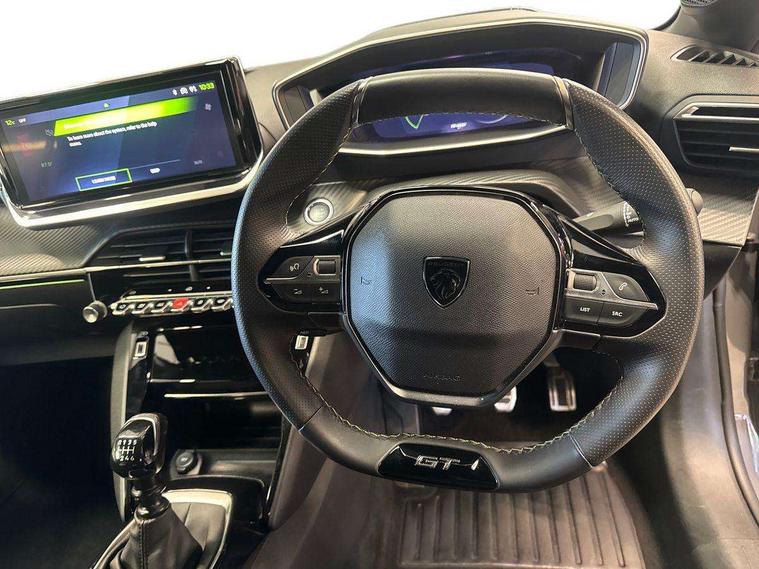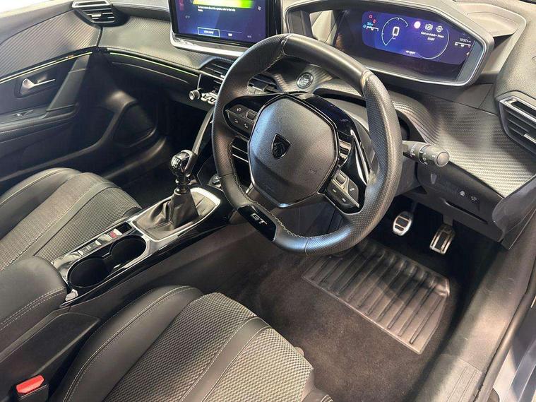 Bluetooth telephone facility, Drive mode select (Eco/Normal/Sport), Driver attention warning, Emergency call service, Exterior temperature indicator with ice warning, Front and rear parking sensors, Multi function trip computer, PEUGEOT i-Cockpit with 10" configurable 3D colour head up instrument panel, PEUGEOT i-Cockpit with 10" HD capacitive colour touchscreen, PEUGEOT i-Cockpit with compact steering wheel, PEUGEOT SOS and assistance, Push button start, Smart phone docking station, Smartphone 15W wireless charging plate, Speed limit recognition and recommendation, Start/stop system, Wireless mirror screen with apple carplay and android auto, 6 Speakers - 2 tweeters and 4 door speakers, DAB Digital radio, Peugeot i-connect infotainment system - 10in HD touchscreen, AM/FM/DAB digital radio, Wifi Mirroring, Bluetooth & 2 USB connection, USB-A socket (x1) and USB-C socket (x1) - rear, USB-C data and charge socket and USB-C charge socket in front, Voice recognition for radio, navigation and telephony features, 2 X Rear number plate lights, Acoustic windscreen, Antenna - Gloss Black 'fin' design, Automatic hazard light activation upon heavy brake application, Body coloured exterior door handles, Dark tinted rear side and tailgate windows, Diamond black rear spoiler (roof), Door sills protection with PEUGEOT signature lettering, Electric heated and power folding door mirrors with courtesy floor lighting, Frameless electrochrome interior rear view mirror, Full LED headlights with automatic height adjustment and PEUGEOT smartbeam assist, Gloss black B pillar, Gloss black door mirror shells, Gloss black front bumper grille with body colour accents, Gloss black rear cluster connecting strip, Gloss black wheel arch extensions, Gloss black window weatherstrips, GT model designation badging on C pillar, GT model designation badging on tailgate, Headlights left on audible warning, LED 3 claw horizontal rear lighting signature (with daylight function) and LED brake lights, indicators and reversing lights, LED daytime running lights with distinctive 3 claw signature, LED front indicators, LED third brake light, Model designation badges front and rear in basalt grey, One touch electric front/rear windows with pinch protection, Rear bumper with gloss black finish, Rear reversing lights, Rear side wing doors, Rear windscreen wiper triggered automatically in reverse gear, Roof spoiler, Tailgate with heated rear windscreen and wiper blade, Variable front intermittent wipers, 1/3 to 2/3 split folding rear seats, 12V socket, 3 seat bench in 2nd row, 8 Colour personalisable ambient lighting, Adamite green contrast stitching to front and rear armrest, front centre console, dashboard facia, Aluminium pedals, Automatic mono zone climate control air condition, Boot lighting, Driver and front passenger dynamic seats, Driver and front passenger seat manual adjustment in longitudinal and back rest angle, Driver and front passenger seat mechanical height adjustment, Driver and passenger sun visors, front footwells and central storage with LED lighting, Electric power steering with reach and rake adjustable steering column, Front centre armrest with storage compartment, Front LED interior light, front LED reading spotlights(x2), rear LED reading spotlight(x2), Gear shift indicator, High centre console with 2 cup holders, Luxury carpet mats, Map pockets on the backs of the front seats, Multi function full grain perforated leather steering wheel with adamite green stitch detail and 'GT' emblem, Passenger seat height adjuster, Piano keys gloss black plated toggle switches to access main functions of the vehicle, Rear centre headrest, Roof lining - Mistral black, Seatbelt unfastened on the move audible and visual alert for front and rear seats, Single front passenger seat, Visibility pack - 208, 2x Isofix child seat fitting on outer rear seats, 3 rear 3 point seatbelts, ABS (Anti-lock Braking System) with EBD (Electronic Brakeforce Distribution) and EBA (Emergency Braking Assistance), Active safety brake with night function/cyclists/pedestrians, Child locking functionality on rear doors, Driver and front passenger airbag with passenger airbag deactivation, Driver/front passenger side airbags, Electric parking brake, ESP with Hill Assist, Front and rear curtain airbags, Front and rear disc brakes, Front optimised safety headrests and 3 x rear retractable headrests with height adjustable, Front three point retractable seatbelts with force limiters, Remote plip(x2) for locking, unlocking, includes emergency key blade, Tyre pressure monitoring system, Acoustic vehicle alert system (AVAS), Alarm - Connected, volumetric , perimetric, anti lift sensor, Automatic door locking when moving off, Deadlock, Electronic code immobiliser, Peugeot Open and Go System, Remote central locking, Carbon effect Dashboard, front and rear door panel finish, 17" Yanaka two tone diamond cut alloy wheels wheels includes gloss black inserts, Space saver spare wheel,
