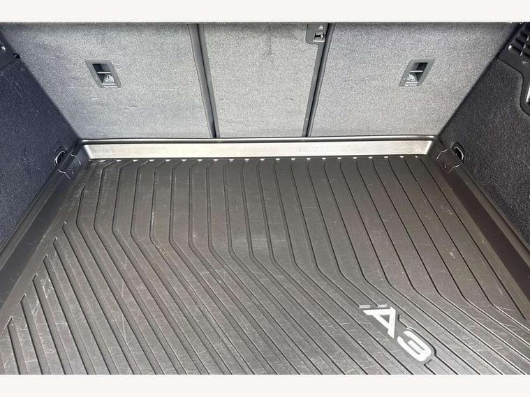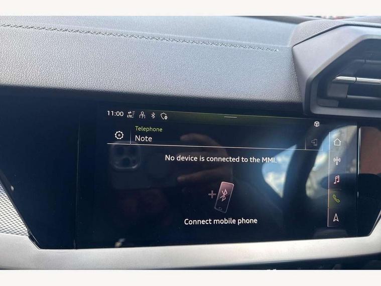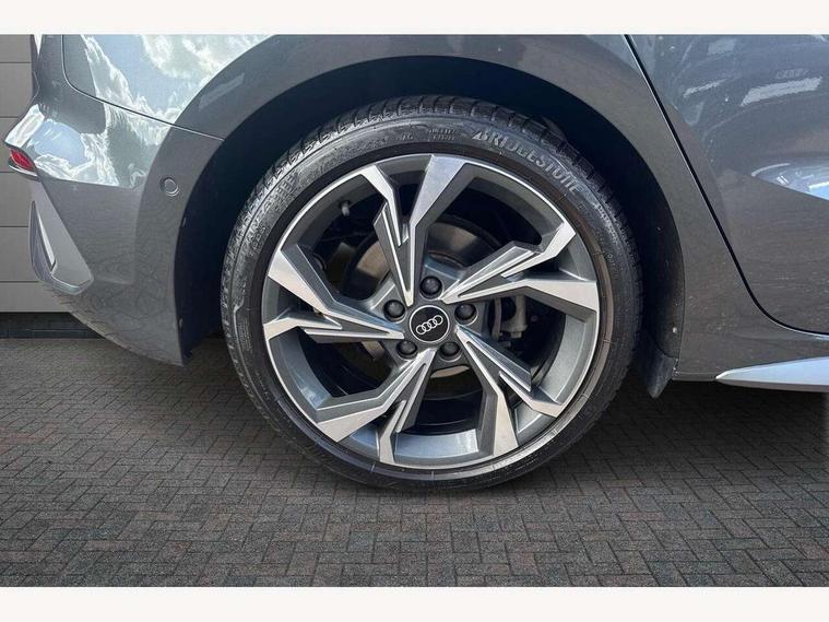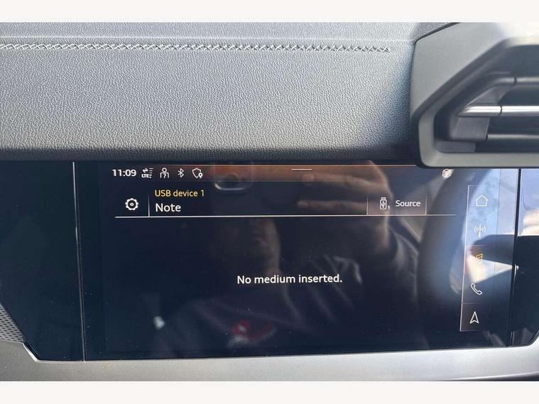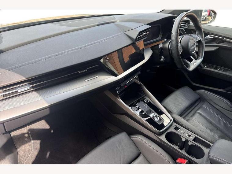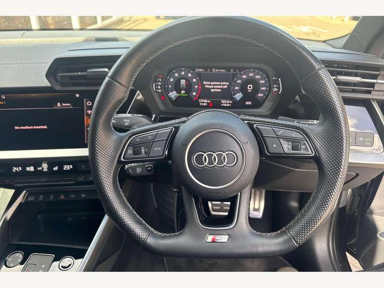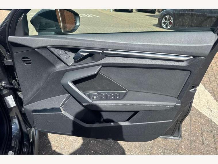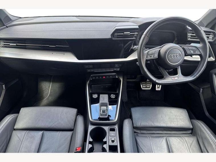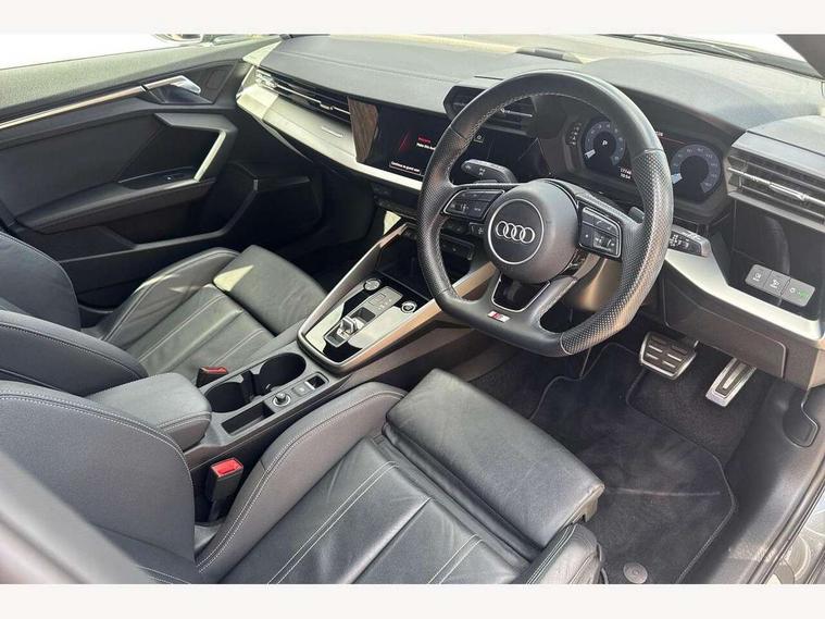 Audi connect emergency call and service, Audi drive select (Auto, Comfort, Dynamic, Efficiency and Individual), Audi smartphone interface, Audi Virtual Cockpit - 10.25" digital and colour instrument cluster, Automatic start/stop system with recuperation, Bluetooth interface, Collision avoidance assistant, Electromechanical power speed sensitive steering, Lane departure warning system, MMI Navigation Plus with high resolution 10.1" colour touch screen display, Service indicator, Trip computer, Voice control system with natural language interaction, 2xUSB-C connection with data and charging functions, 6 passive loudspeakers, DAB Digital radio, 3rd brake light, Acoustic glass windscreen, Aluminium window trim, Auto dimming frameless rear view mirror, Electrically adjustable/heated/folding/auto dimming door mirrors with integrated LED indications + kerb view function for passenger side, Front electric windows, Illuminated aluminium inserts front door sills with S logo, LED daytime running lights, LED headlights with LED rear lights and dynamic rear indicators, Light and rain sensors, Privacy glass - dark tinted rear window, rear door and side windows, Rear electric windows, Rear side air outlets in grained matt black, Rear side wing doors, Rear wiper, S line bumpers, S roof spoiler, 12V socket and storage compartment in front centre console, 3 seat bench in 2nd row, 40/20/40 split folding rear seat bench with cupholder, Black cloth headlining, Dual zone electronic climate control, Front and rear centre armrest in leather, Front and rear headrests, Front/rear floor mats, Height and reach adjustable steering wheel, Illuminated vanity mirror, Interior lighting - glove compartment light and right hand side, Luggage compartment floor covering, Manual boot compartment lid, Manually adjustable front seats, Seat side bolsters, Single front passenger seat, Stainless steel pedals and front footrest in black, Twin leather upholstery with front sports seats S embossed logo, Aluminium interior elements pack - A3 Sportback, S line styling pack - A3 Sportback, 3x3 point rear seat belts, Driver and front passenger airbag with passenger airbag deactivation, Electronic Stabilisation Control (ESC) including ABS, ASR and EDL, First aid kit with warning triangle and 2 safety vests, Front side airbags with head airbags and interaction airbag, Pre-sense front with pedestrian and cyclist detection, Seatbelt monitoring, Tyre pressure loss indicator, Anti theft alarm, Anti-theft wheel bolts, Immobiliser, Manual child locks, Remote control central locking, Accent surfaces in the dashboard and centre console in platinum grey silk effect paint finish, Dark spectrum aluminium inlays,