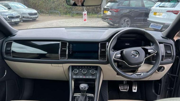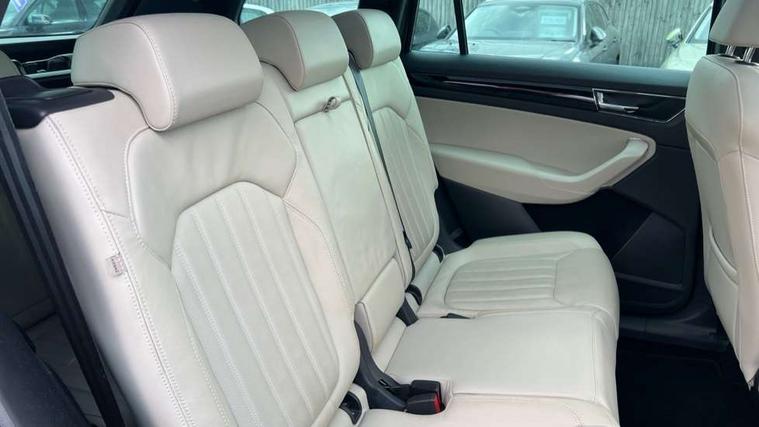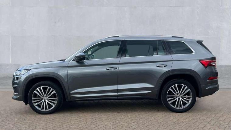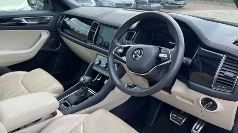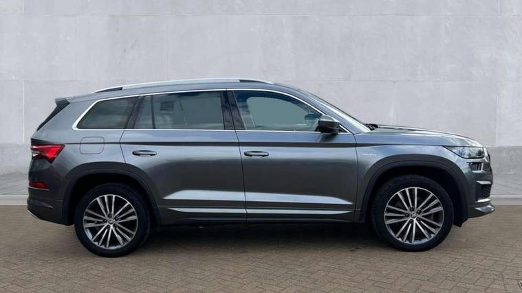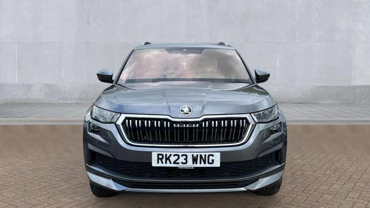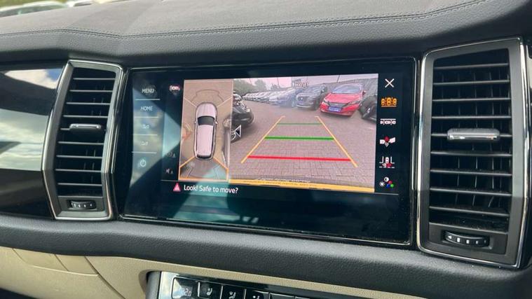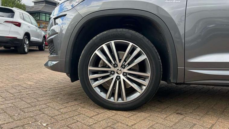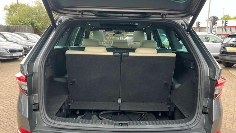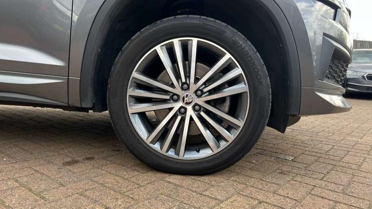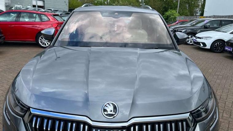 Area view, Blind spot detection system, Bluetooth system, Columbus satellite navigation with 9.2" touchscreen, integrated Wi-Fi, web radio, Digital voice enhancement, e call+, ECO Stop/start function, Exterior temperature indicator, Progressive steering, Smartlink wireless for apple carplay and wired for android auto, Speed limiter, Tailgate unlocking from outside, USB C Port x 2 in front centre console, Virtual Cockpit - 10.25" digital display, Wireless charging, Canton sound system, DAB Digital radio, Aero front windscreen wipers with intermittent function, Aero rear window wiper, Auto dimming rear view mirror, Black wheel arch surrounds, Body colour bumpers, Body colour door mirrors and handles, Body colour door panels, Chrome front grille, Chrome roof rails with chrome window surround, Electric adjustable/heated/folding door mirrors, driver side auto dimming with boarding sports and memory function, Electric front and rear windows, Extended rear spoiler with finlets in gloss black, Front fog lights, Full LED matrix headlights with AFS (adaptive front light system), cornering function and AWL (all weather lighting system), Headlight washers, Heated rear window, Invisible tailpipe, L&K front and rear bumpers including lower rear chrome strip, LED daytime running lights, LED rear fog light, LED third brake light in rear spoiler, Light assistant (coming/leaving home/tunnel light), Off-road style lower front bumper element, Panoramic sunroof, Privacy glass, Rain and light sensors, Rear LED lights (high functionality) with welcome effect and dynamic indicators, Rear side wing doors, Safety reflectors on front and rear doors, Window control switches with black trim, Without engine designation, 12V socket in boot, 2 rails with 2 hooks, 2 seat bench in 3rd row, 3 seat bench in 2nd row, 4 foldable roof handles with rear coat hooks, 60:40 foldable rear seat with sliding adjustment and backrest angle adjustment, Aluminium pedals, Bottle holders in door panel in the 1.5 litre front and 1 litre rear, Cargo storage compartments, Chrome headlight control button, Chrome interior door handles, Coat hooks on B pillar, Covered storage compartment on driver side, Decorative door sill covers, Front centre armrest with storage compartment, cup holder and 12V socket, Front courtesy lights, Gear shift lever with chrome frame and black gloss insert, Grey stitching in front and rear armrests and door armrests + door inserts, Height adjustable front headrests, Illuminated and cooled glovebox, Illuminated luggage compartment, Isofix child seat fittings in outer rear seats with top tether, Manually adjustable steering column, Net programme in boot (1x horizontal Net, 2x vertical Nets), Overhead glasses storage compartment, Pollen filter, Rear centre armrest with cupholders, Single front passenger seat, Sliding trunk cover, Small Bags on the inner sides of the front backrests, Sunvisors with illuminated vanity mirrors, Three rear height adjustable headrests, Ticket holder on A Pillar, Umbrella in door panel, Variable boot floor, LED Interior light pack - Kodiaq, Auto door release and activation of warning lights in the event of an accident, Child locks on rear doors, Driver and front passenger airbag with knee airbag and front passenger airbag deactivation, Electronic parking brake with hill start assist, Emergency rear braking signal, ESC (incl. ABS+MSR+ASR+EDS+HBA+DSR+RBS+MKB), Front assist with autonomous emergency braking, Front side airbags with curtain airbags, Fuel cut off safety device, Height adjustable front 3 point seatbelts + pretensioners, Hill hold control, Rear disc brakes, Safety vest holder in door, Seat belt reminder for all seats, Three point rear seat belts, Two tone horn, Tyre pressure monitor, Alarm with interior monitoring and tilt sensor with safe function, Anti-theft wheel bolts, Immobiliser, Keyless entry and start system (KESSY), Remote central locking with 2 keys, Grey stitching in dashboard, Piano black decorative inserts, Plaquette L&K front fenders, Temporary spare wheel (space saver),