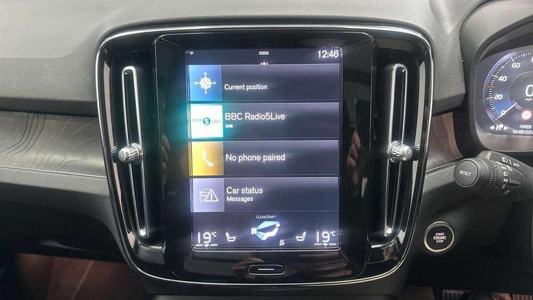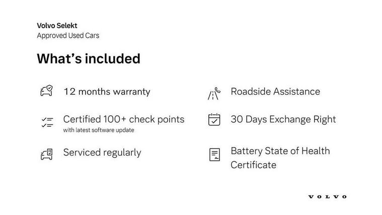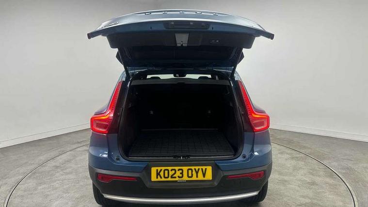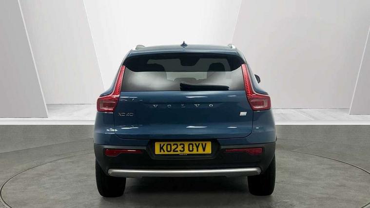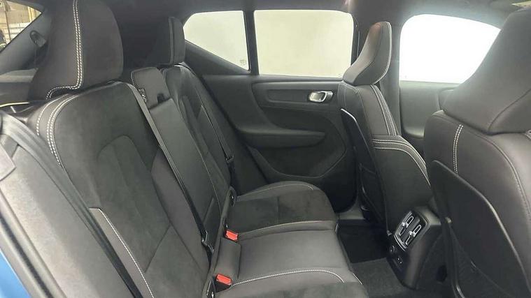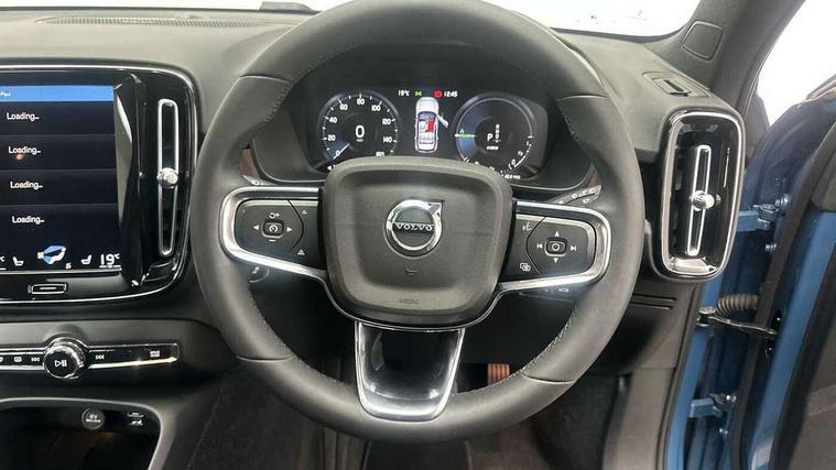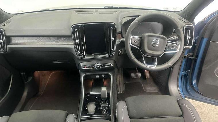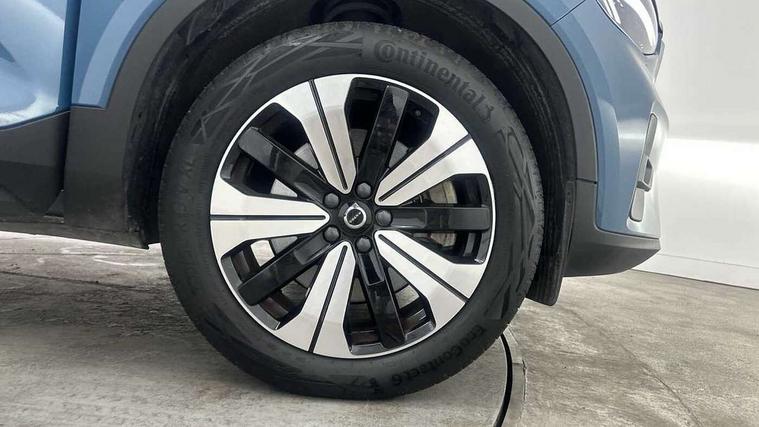 12.3" Active TFT crystal driver's instrument display, 360 degree surround view parking camera, 9" centre console portrait touch screen, Adjustable steering wheel force, Bluetooth hands free telephone kit, Drive mode selector, E-call, Front park assist, Hands free power tailgate, Lane keep assist with driver alert control, Oncoming Lane Mitigation, Rear park assist, Sensus navigation with European mapping and traffic information, Speed limiter, Speed sensitive steering, Voice activated control for key functions, Wireless Smartphone Integration includes Apple CarPlay and Android auto, Wireless/Inductive Mobile Phone Charging, 3.7 kW monophase on board charger, 7m 10amp charge cable with 3 pin plug and 7m 1 phase 16amp type 2/mode 3 charge cable, Dynamic chassis, Electric front axle drive, Recharging port located in nearside front wing, DAB Digital radio, Low speed exterior sound speaker, Premium Sound by Harman Kardon, Dolby Pro Logic II Surround Sound, Dirac Unsion, 12 speakers/600W and subwoofer, Steering wheel mounted remote controls, Active bending pixel LED headlights with adaptive shadow technology, Active high beam incorporating daytime running lights, Adaptive brake lights with high level LED brake lights, Auto dimming interior mirror, Automatic headlamp levelling, Dark tinted windows for rear door side windows and cargo compartment, Front and rear electric windows, Front recharge aluminium tread plates, Headlight cleaning system, High gloss black front and rear skid plate, High gloss black mesh front grille with high gloss black surround, High gloss black window trim, Home safe and approach lighting, Integrated roof rails in high gloss black, LED front fog lights, Power glass tilt and slide panoramic sunroof with sun curtain, Puddle lights, Rain sensor with automatic windscreen wiper activation, Rear side wing doors, Rear wiper, Roof antenna, Roof spoiler, Visible VIN plate, 12V socket in front tunnel console and cargo compartment, 2 zone electronic climate control with clear zone air quality system and pollen filter, 3 seat bench in 2nd row, 3 Spoke tailored steering wheel with chrome trim, 60/40 versatile split folding rear seat, A-pillar parking ticket holder, C-pillar Recharge logo, Centre console cupholders and storage, Floor mats, Front door pocket, front cupholder, ambient front door, rear reading, rear courtesy, instrument panel and tailgate lighting, Front footwell illumination, Front headrests, Front reading light and theatre lighting, Front seat cushion extensions, Front tunnel pocket, Glovebox bag hook, Heated front seats, Height adjustable passenger seat, Height/reach adjustable steering column, High gloss centre tunnel deco, Illuminated glovebox, Illuminated luggage compartment, Illuminated vanity mirrors, Isofix attachments on rear seats, Load protection net, Multi directional lumbar support, Power driver seat with memory + exterior mirrors memory, Power folding rear headrests, Power passenger seat, Rear armrest / integral cup holders / storage tray, Single front passenger seat, Underfloor cargo storage, Climate pack without heated front seats - XC40, Driver assist pack - XC40, 3x3 point rear seatbelts, City safety includes pedestrian, cyclist and large animal detection and front collision warning with full auto brake, Drivers knee airbag, Dual stage driver/passenger airbags, Electronic parking brake with auto hold, First aid kit, Front and outer rear seatbelt reminder and pretensioners, Front seats SIPS airbags, Hill descent control, Hill start assist, Inflatable curtain, Passenger airbag cut-off device, Power child locks on rear doors, Road sign information display, Run off Road Mitigation, Run off Road Protection, SIPS (Side Impact Protection System), Slippery road and hazard light alert, Stability and Traction Control with Spin control, Engine Drag Control and Corner Traction Control, Tyre pressure monitoring system, Vehicle deceleration control with Anti-lock Brake System, Electronic Brake Distribution and Emergency Brake Assist, Warning triangle, WHIPS whiplash protection system - front, Anti-theft alarm including immobiliser/volume sensor + level sensor, Care key with user defined top speed, Key integrated remote control central locking + fuel flap with deadlocking system and auto open/close power windows, Keyless drive includes keyless entry and keyless start, Locking wheel nuts, Private locking for tailgate,