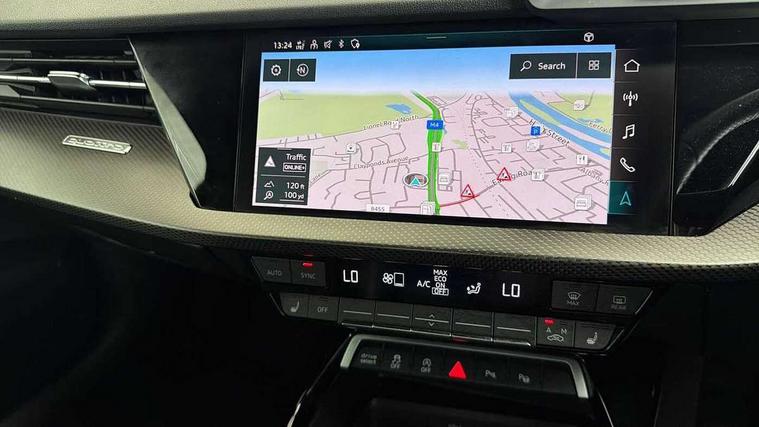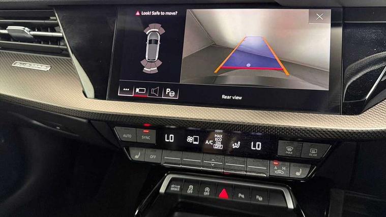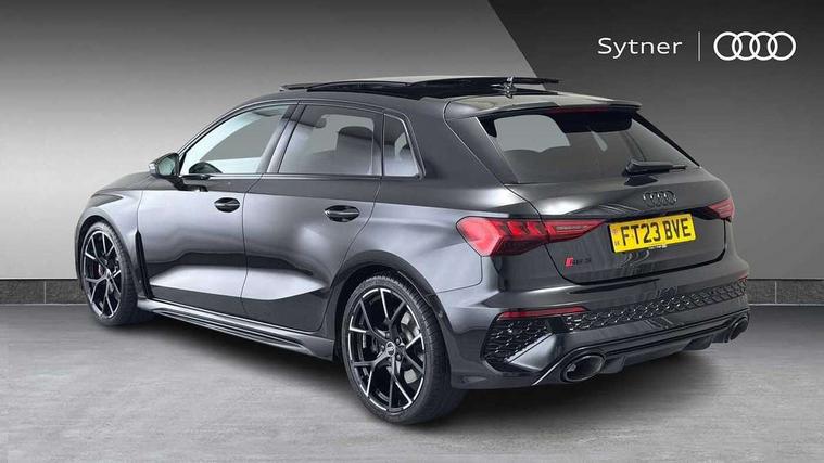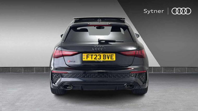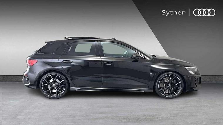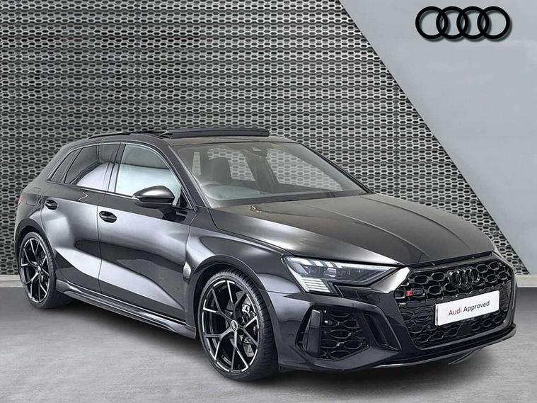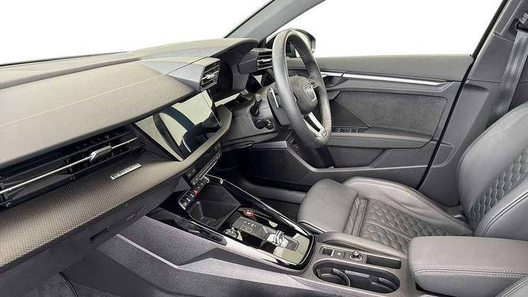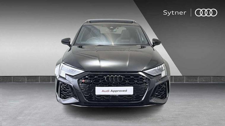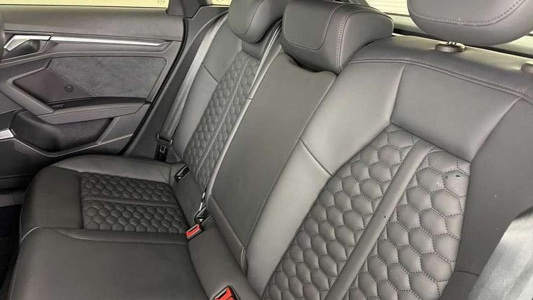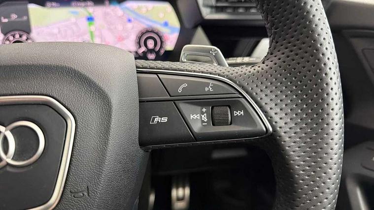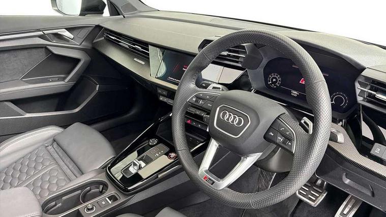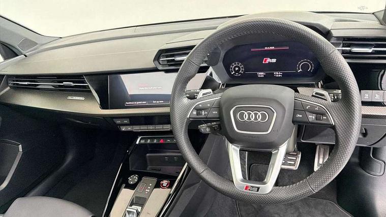 Adaptive cruise assist, Adaptive cruise control, Audi smartphone interface, Audi virtual cockpit with RS specific display 12.3" full colour digital instrument cluster, Automatic start/stop system with recuperation, Bluetooth interface, Camera based traffic sign recognition, Collision avoidance assistant, Emergency e-call, Head up Display, Lane departure warning system, Legal emergency call, Parking assist with parking system plus, Power operated tailgate - Luggage compartment lid opens electrically, Progressive power assisted steering, Reversing camera, Quattro permanent four wheel drive, Rear suspension, DAB Digital radio, 3rd brake light, Acoustic glass windscreen, Audi beam uses LEDs to project the Audi sport logo onto the ground as you exit your RS 3, Audi matrix LED headlights, LED rear lights, dynamic front and rear indicators and headlight cleaning system, Auto dimming rear view mirror, Black side skirts, Body colour roof, Carbon exterior door mirror, Carbon fibre engine cover, Daytime running lights, Electric adj heated/folding + auto dimming exterior mirrors with memory + LED indicator + auto kerb side function for passenger side exterior mirror, Front spoiler in high gloss black, Heat insulating glass windscreen, Light and rain sensors, Panoramic glass sunroof, Privacy glass - dark tinted rear and rear side windows from B-pillar backwards, Rear side wing doors, Rear window wiper and washer system, RS exterior features in gloss black, RS sports exhaust system, 3 seat bench in 2nd row, 3 spoke leather multifunction steering wheel with gear shift paddles, 4 way lumbar support for front seats, 40/20/40 split folding rear seat bench, Black cloth headlining, Dual zone electronic climate control, Electrically adjustable front seats with memory function for driver's side, Front and rear headrests, Front centre armrest, Front sports seats RS embossed logo, Front/rear floor mats, Heated front seats, Honeycomb stitching and RS embossing, Illuminated door sill trims inlays in aluminium with RS 3 logo, Illuminated vanity mirror, RS emblems, Single front passenger seat, Stainless steel pedals and front footrest in black, Aluminium interior elements pack - RS3, Ambient lighting pack - RS3, Comfort and sound pack - RS3, Driver assistance pack with 3 spoke leather multi function steering wheel - RS3, MMI navigation plus with MMI touch - RS3, RS bodystyling - RS3, Storage Pack - RS3, 3x3 point rear seat belts, ABS/EBD, ASR, Audi pre sense front, Driver/Front Passenger airbags, EDL, ESC - Electronic Stability Control + traction control, Front passenger airbag deactivation, Front side airbags with head airbags and interaction airbag, Hill hold assist, Seat belt reminder with passenger presence detection in rear, Tyre pressure loss indicator, Warning triangle and first aid kit, Anti theft alarm, Anti-theft wheel bolts, Electronically operated child lock, Remote control central locking, Full decorative carbon trim, 19" 5 Y spoke black with graphic print alloy wheels, Tool kit, Tyre repair kit,