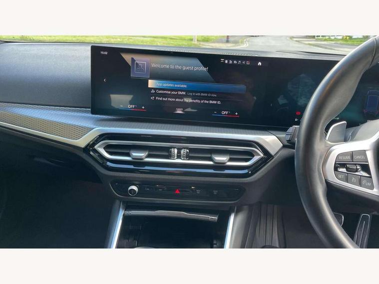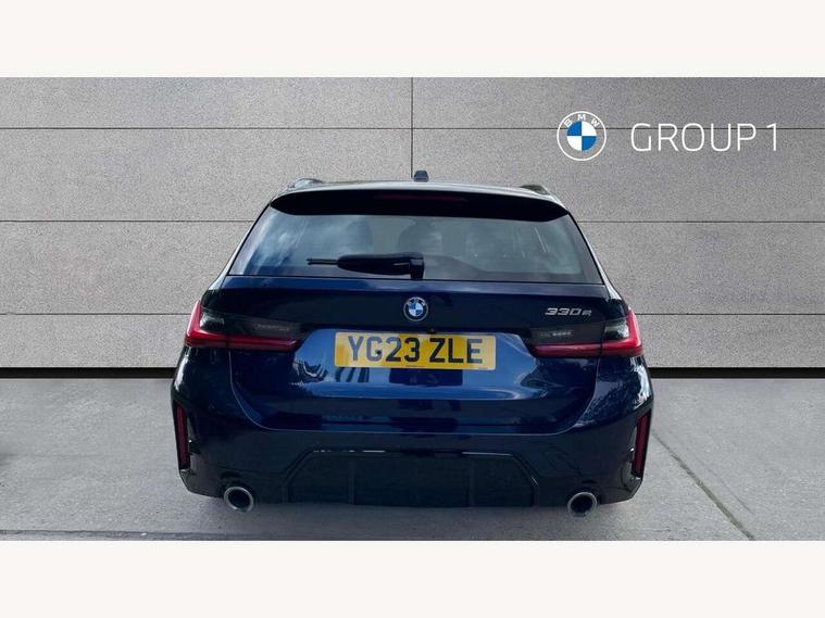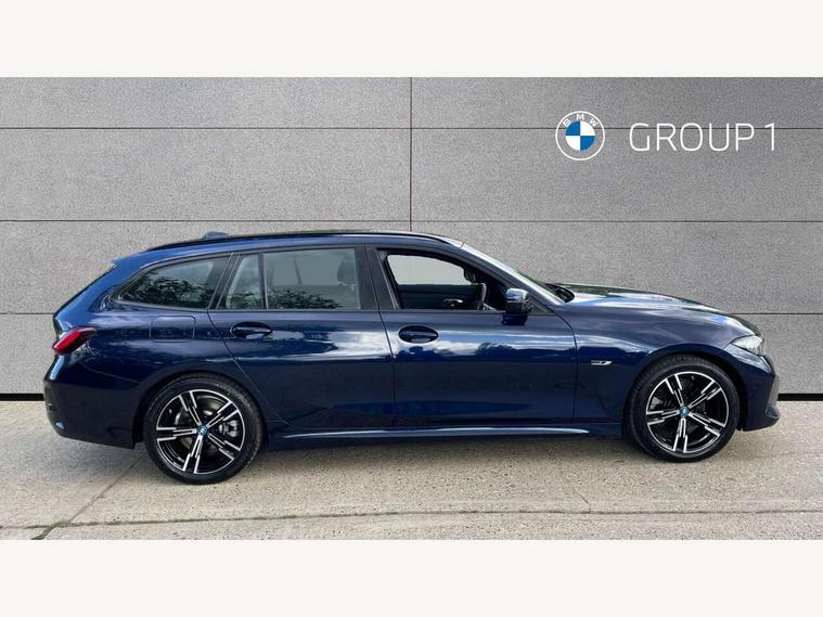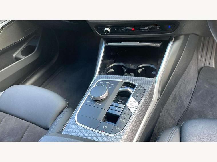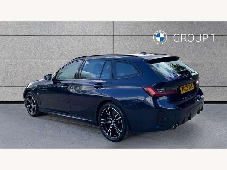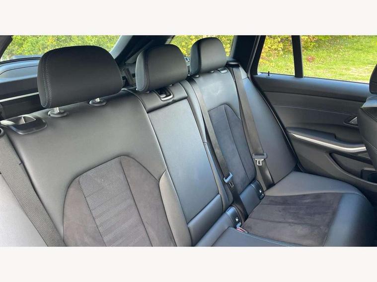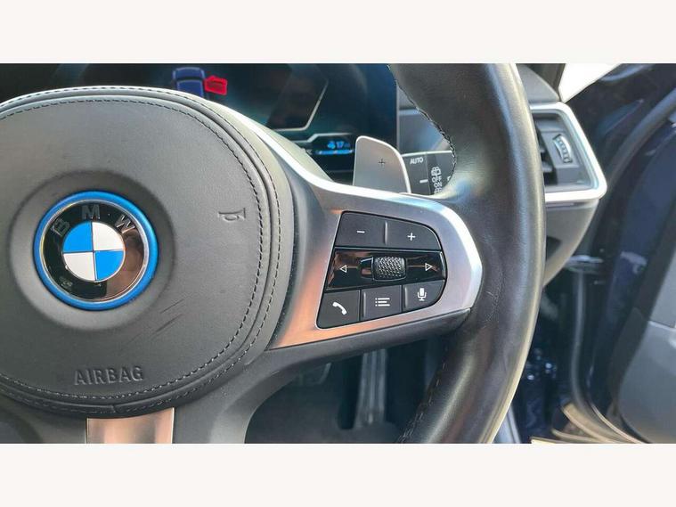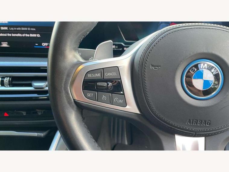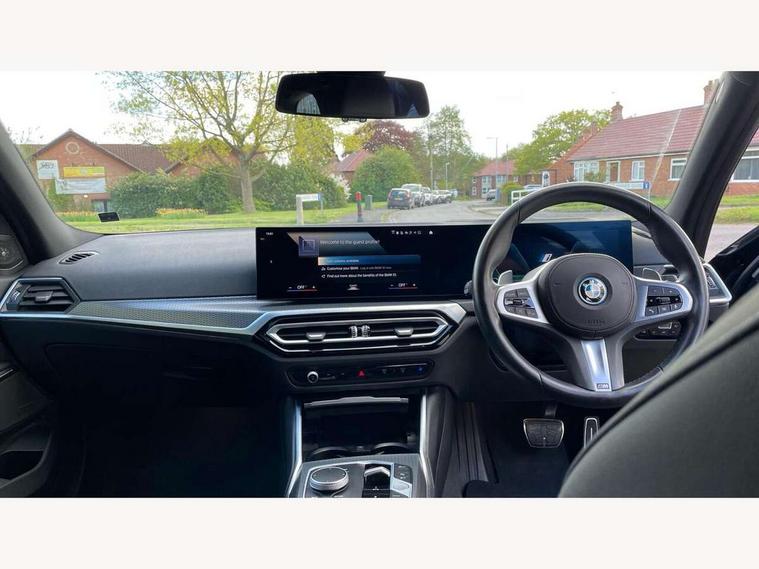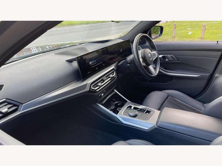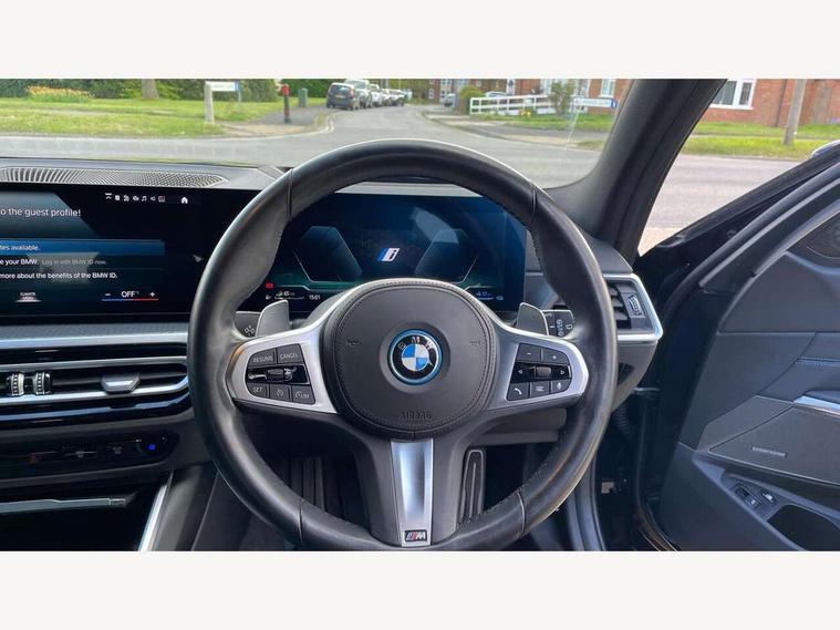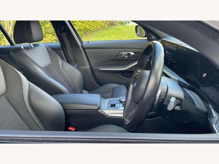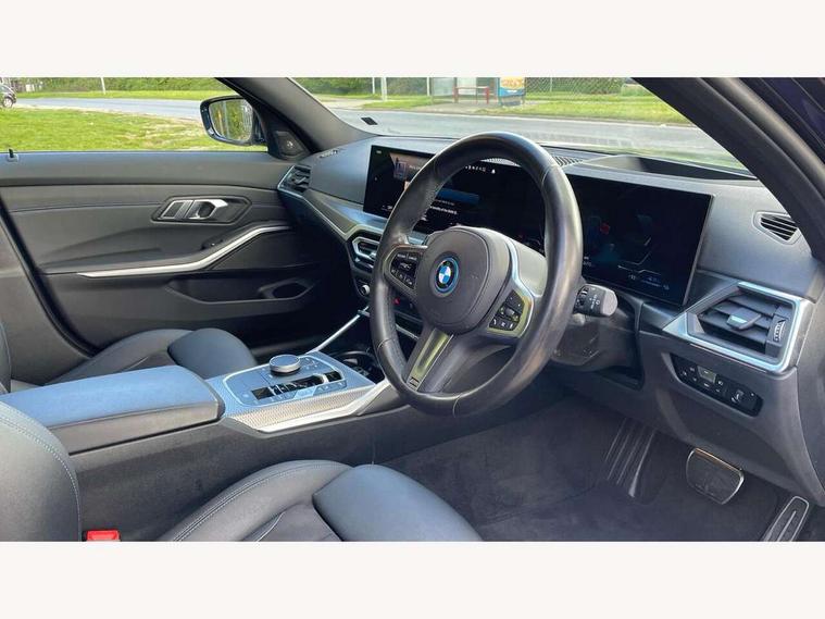 Active guard plus, Attentiveness assist, Automatic Start/stop button, BMW iDrive, BMW Teleservices, Condition based service, ConnectedDrive Services, Driving experience switch, Live cockpit plus with Navigation + 12.3" instrument display + 14.9" display, Intelligent voice assist, 2 USB, 4G LTE connect, Oil sensor for level and grade, PAS, Preparation for driver assistance, Shifting point display, Double joint spring strut front axle, Electronic differential lock control (EDLC), Fast charging cable - Mode 3, Flexible charger (Mode 2), Fuel tank breather system, Sport automatic transmission with steering-wheel mounted gearshift paddles and launch control, Standard suspension, DAB tuner, "Electrified by i" exterior badging on charging flap, 3rd brake light, Acoustic glazing, Automatic headlight beam throw control with load dependent regulating reaction, dynamic compensation of braking dive and acceleration squat, BMW emblem, engine compartment lid and tailgate, Body colour roof fin, Door sill strips, Electric windows - front and rear, with open/close fingertip control, anti-trap facility and comfort closing, Follow me home headlight function, Front and rear bumper system with replaceable deformation elements, Front apron plastic in body colour, Fuel filler flap - right rear in body colour, Heated washer jets, High gloss shadow line exterior trim, High gloss shadow line roof rails, Illuminated bow type door handles in body colour drivers side with door lock, Interior rear view electrochromatic mirror with automatic anti dazzle function, LED rear lights, Licence plate panel integrated into front bumper and tailgate, Matt black B-pillar finsher, Matt black window recess cover, Model designation on right side of tailgate, One piece front bumper cover including towing eye cover in body colour, Rain sensor with automatic headlight activation, Rear side wing doors, Rear wiper, Reversing lights, Side frame decorative moulding black matt, Visible exhaust tailpipe finisher, Welcome lights in interior and door handle area, 12V power socket in front storage compartment, 2 front cupholder in centre console with clamping elements and matt black inlay, 3 seat bench in 2nd row, 3 zone automatic air conditioning, 40:20:40 split folding rear seat with loading system, Ambient inside door handle light, Ambient light design projected onto the left and right entering and exiting area, Ambient lighting front and rear with 9 selectable colours, Ambient storage compartment lighting in the centre console, Anthracite headlining, Armrest integrated in front and rear door trim + front centre console armrest, Battery in luggage compartment, BMW ID, Contour lighting in instrument panel and door trim panel, Cruise control operation in steering wheel, Driver backrest width adjustment, Folding rear centre armrest with 2 cupholders, Front and rear ambient footwell lighting, Front and rear door exit lighting (left / right), Front and rear headrests, Front and rear reading lights, Front and rear velour floor mats, Front sport seats, Heated front seats, Height adjustable mechanically and infinitely variable steering column, Illuminated armrest storage compartment, Illuminated glove compartment, Illuminated luggage compartment, Lashing eyelets in luggage compartment, M Sport multifunction leather steering wheel, Make-up mirror lights, Single front passenger seat, Standard seat for driver and passenger with manual adjustment, Sunvisors with vanity mirrors and ticket pocket, Toolkit located in luggage compartment, Connected pack professional - 3 Series Saloon/Touring, Interior and exterior mirror pack - 3 Series Touring/Saloon, M Aerodynamics package - 3 Series Saloon/Touring, M sport exterior styling pack - 3 Series Saloon/Touring, Storage compartment pack - 3 Series Saloon/Touring, 3x3 point rear seatbelts, BMW emergency call, Child locks on rear doors, Crash sensor activating of airbags, Unlocking doors, hazard warning lights, interior light, safety battery terminal, Driver and front passenger with seat occupancy detection for driver's and passenger side, Driver and passenger side airbags, body protection at side and airbags deploy from seat backrests, Dynamic brake control, Dynamic stability control + (DSC+) - Anti-lock Braking System (ABS) with brake assist and cornering brake control + Automatic Stability Control (ASC), Dynamic Traction Control - DTC, Electric parking brake including automatic hold function and automatic release of the parking brake when driving off, Head airbags in 1st and 2nd row, head protection at side, curtain airbags open from headliner above 1st and 2nd row, Plastic fuel tank, Side impact protection, Tyre pressure monitoring with three level warning strategy, Ventilated front and rear disc brakes, Warning triangle and first aid kit, Alarm system, Centre lock switch, Closing system with central locking, Electronic vehicle immobiliser,