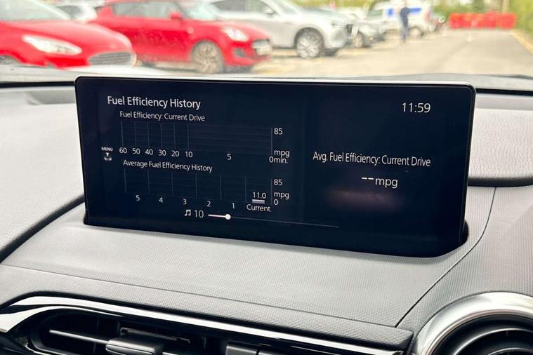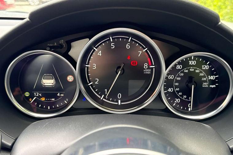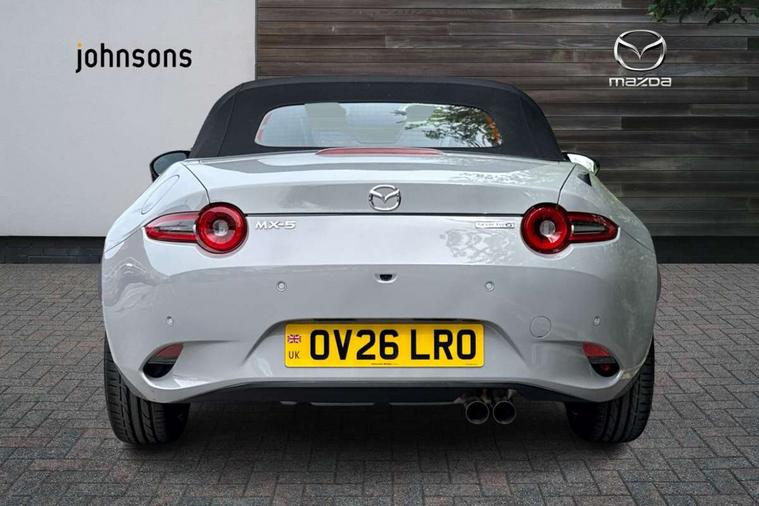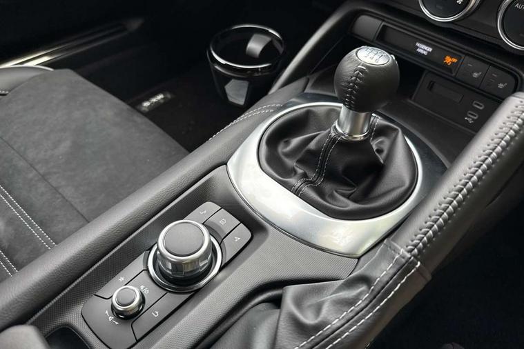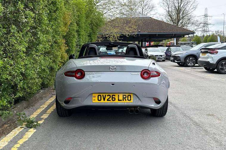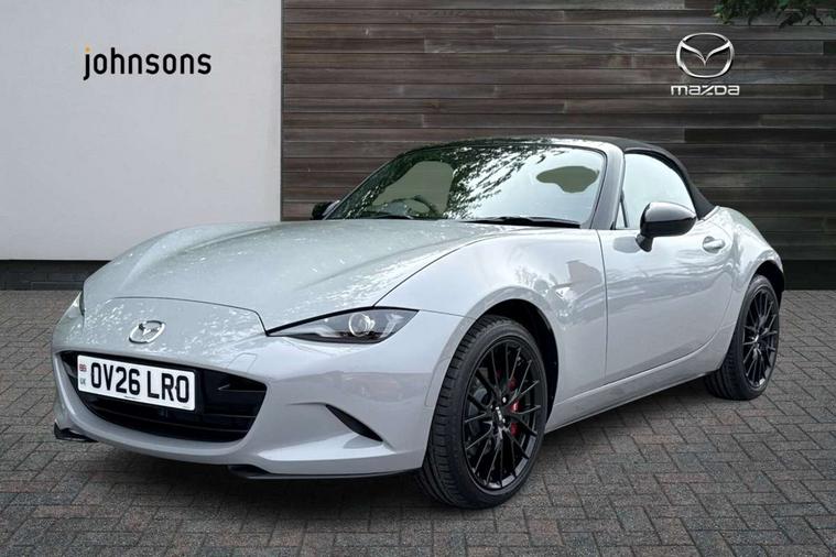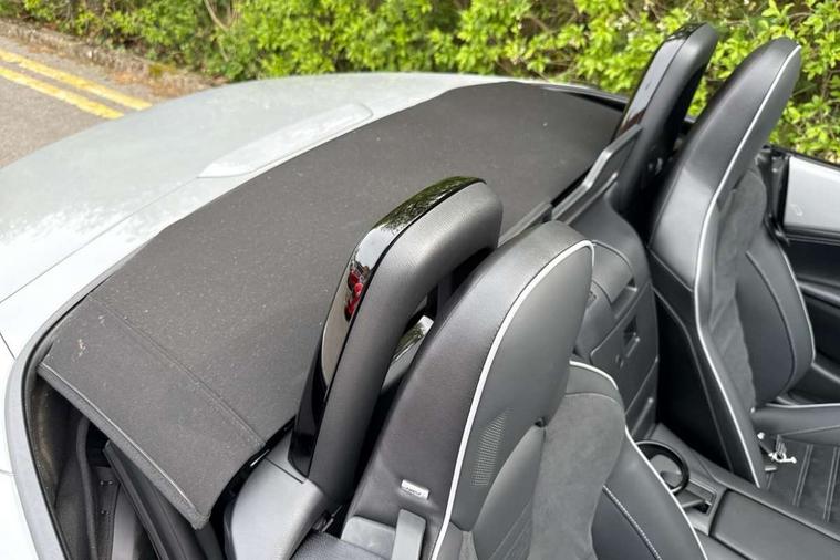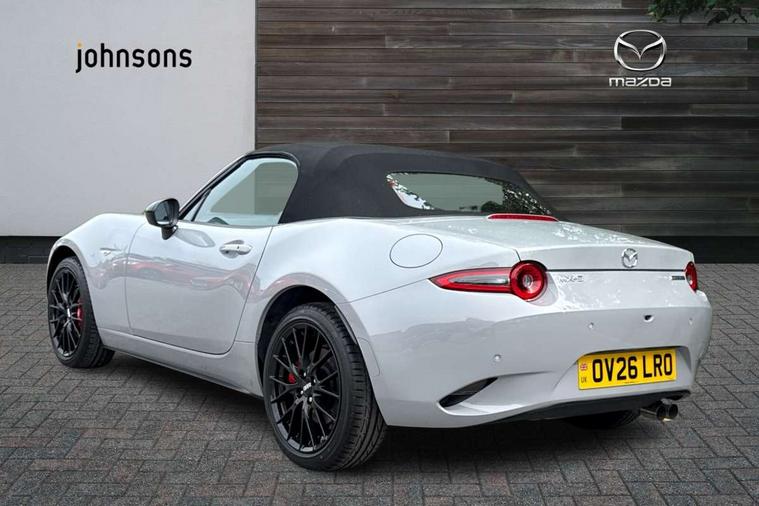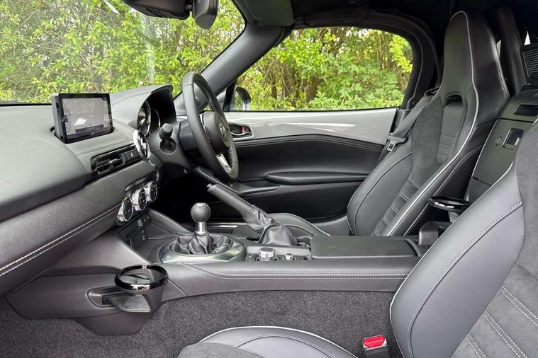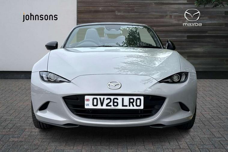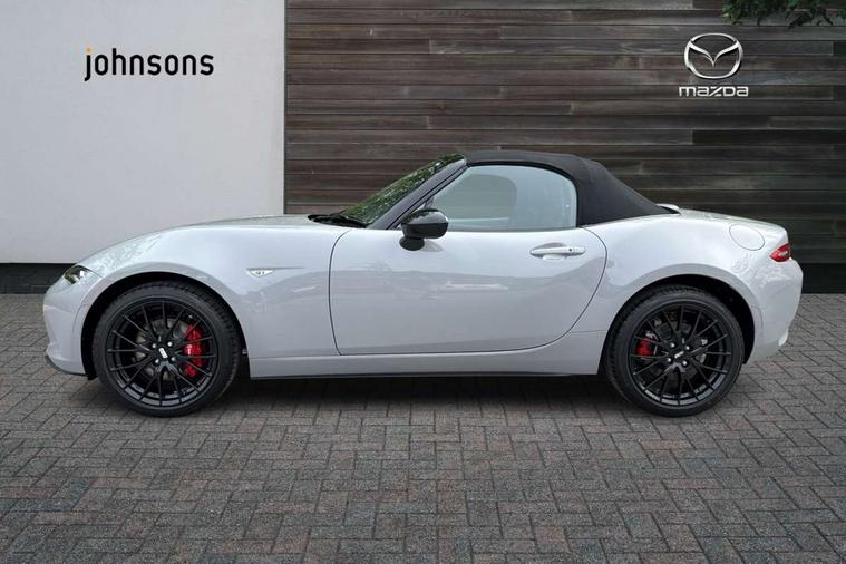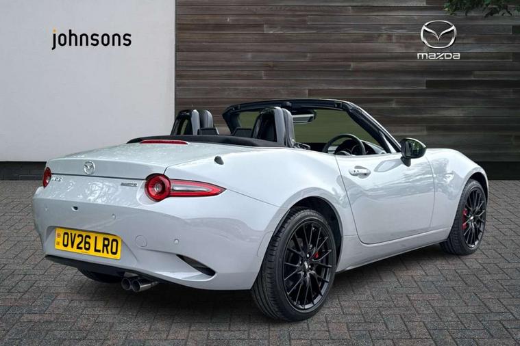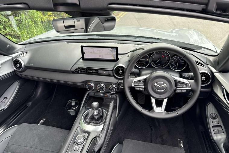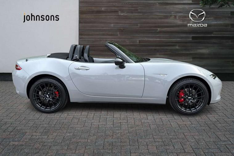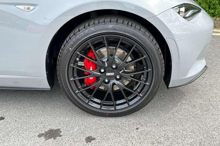 8.8" Colour centre touch screen display with Mazda Connect infotainment, Aha and stitcher app, Analogue speedometer, Apple car play/Android Auto, Blind spot monitoring with rear cross traffic alert, Cruise control with Intelligent speed assist, Driver alert system, eCall emergency call system, Emergency stop signalling system, Engine start/stop button, Hands free phone preparation, Integrated bluetooth with hands-free calling, bluetooth audio and easy access to phone contacts, Integrated navigation system, Kinematic posture control, Lane departure warning system, Lane keep assist, Multi dot display tachometer and electric odometer, PAS, Rear parking sensor, Reversing camera, Service indicator, Traffic sign recognition, Trip computer, Water temperature gauge, Asymmetric limited slip differential, I-ELOOP, i-stop, Sports suspension featuring Bilstein dampers, 2 x USB Type-C inputs, Multimedia Commander including separate volume dial, Premium Bose sound system with 9 speakers with 2 in each front headrest, AM/FM/DAB radio and MP3, Steering wheel mounted audio/bluetooth controls, Adaptive LED Headlights, Automatic headlamp levelling, Body colour bumpers, Body colour co ordinated interior upper door trim, Coming/leaving home lighting function, Dual exhaust pipes, Dusk sensitive headlamps, Electric front windows/one touch facility, Frameless auto dimming rear view mirror, Front intermittent wipers, LED 3rd brake light, LED daytime running lights, LED indicator lights, LED rear lights, Manually operated black premium cloth soft top with heated rear glass window, Piano black electric/heated door mirrors, Piano Black fashion bars, Rain sensing front wipers, Rear boot, Stainless steel scuff plates with MX-5 logo, 12V socket, Alcantara/leather upholstery, Centre console storage box, Chrome Air conditioning dials, Climate control air conditioning, Coin Box, Driver and front passenger sunvisors with covered vanity mirror and driver ticket holder, Driver seat manual slide, recline and tilt adjustment, Front centre armrest, Front head restraints, Gear shift indicator, Heated front seats, in 3 heat levels, Interior courtesy light, ISOFIX front passenger seat child seat compliance, Leather gear knob, Leather handbrake lever, Leather steering wheel, Lockable rear centre box with lid, Passenger seat + manual slide/recline adjust, Recaro sports seats, Single front passenger seat, Strut brace, Tilt/telescopic steering column, Two cupholders, Windblocker, 3 point ELR front seatbelts with pretensioners, ABS+Electronic Brake force Distribution, Deployable Hood System (DHS), Driver and passenger seatbelt reminder audible warning, Dynamic stability control with track mode, Exit warning, Front dual stage driver and single stage front passenger airbags, Front smart city brake support with autonomous emergency braking (SCBS), Hill hold assist, Passenger airbag deactivate switch, Red brembo brake callipers, Side airbags, Smart city brake support - Rear (SCBS-R), Traction control, Tyre pressure monitor, Remote central locking with deadlocking and remote boot release, Smart keyless entry, Superlocking, Thatcham category 1 alarm + immobiliser, Centre Console - Vinyl leather, Chrome air vent surrounds, Dashboard panel - Black Vinyl, Exterior body colour co-ordinated upper door panel trim with black vinyl, 17" BBS Gun Metallic alloy wheels, Tyre puncture repair kit,