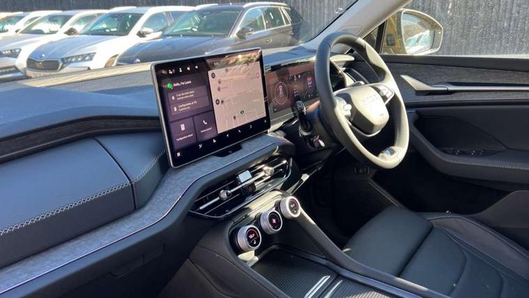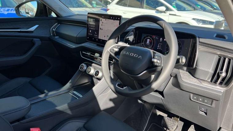 13" satellite navigation touchscreen display, Blind spot detection with door exit warning, Bluetooth system, ChatGPT functionality, Driver alert - Fatigue and drowsiness monitor, Dry display cleaner, Emergency call, Front and rear parking sensors, Front cross traffic assist, Lane assist, PAS, Rear traffic assist, Tailgate unlocking from outside, Traffic sign recognition, USB C Port x 2 in front centre console, Virtual Cockpit - 10.25" digital display, Voice control system, Wireless charging for two smartphones (15W) with cooling function, Wireless SmartLink for Apple CarPlay and Android Auto, Stop/start function, 2x USB-C in the rear, DAB Digital radio, Aero front windscreen wipers with intermittent function, Auto dimming rear view mirror, AWL (all weather lighting) and all weather light with cornering function, Black wheel arch surrounds, Body colour bumpers, Body colour door mirrors and handles, Cornering light and poor weather light, Electric folding /adjustable/separted heated/folding door mirrors, auto dimming with boarding sports and memory function, Electric front and rear windows, Exterior black decorative trims, Front grille with horizontal light strip, Heat insulating glass in windshield, Heated rear window, Ice scraper in fuel tank cap, Invisible tailpipe, LED daytime running lights, LED matrix headlights with AFS and LED fog lights, LED rear light with welcome effect and dynamic turn signals, LED third brake light in rear spoiler, Light assistant with automatic headlight control and coming home feature, Logo projection in door mirrors, Multiple matrix beam, Privacy glass, Rear roof spoiler, Rear side wing doors, Rear window wiper, Red decorative strip between rear LED lights, Safety reflectors on front and rear doors, Unique dark chrome design logo on alloy wheels, Window control switches with black trim, Windscreen wipers with rain sensor, Without engine designation, 1.5l bottle holder points in all door, 1x centre rear reading light, 2 seat bench in 3rd row, 2 spoke multi-function leather heated steering wheel with paddle shift, 3 configurable smart dials with 32mm coloured display, 3 seat bench in 2nd row, 4 foldable roof handles with rear coat hooks, Ambient interior lighting - Dashboard, front-door stowage compartments, front and rear door panels and footwell lighting, Automatic gear selector on steering column, Chrome interior door handles, Driver/front passenger reading lights, Fabric headlining, Fixed bench 40:60:40 split folding backrests, Front and rear floor mats, Front centre armrest with jumbo box storage compartment, cup holder and 12V socket, Height adjustable front headrests, Isofix child seat fittings in outer middle row rear seats and front passenger with top tether, Manually adjustable steering column, Pollen filter, Rear centre armrest with cupholders, Rear seat boot backrest release, Single front passenger seat, Skoda lettering on steering wheel, Storage pocket including mobile phone pockets on the backs of the front seats, Sunvisors with illuminated vanity mirrors, Three rear height adjustable headrests, Ticket holder on A Pillar, Tri zone climate control, Umbrella in door panel x1 made from sustainable materials, Upper and lower glovebox with card holder and coin compartment, USB C port by rear view mirror for charging only (15W), Auto door release and activation of warning lights in the event of an accident, Driver and front passenger airbag with knee airbag and front passenger airbag deactivation, Electric child locks, Electronic parking brake, ESC (incl. ABS+EMD+MSR+ASR+EDL+HBA+DSR+RBS+ESBS+MCB+TSA+XDS), Front assist with braking reaction to vehicles, pedestrians and cyclists, Front disc brakes, Fuel cut off safety device, Height adjustable front 3 point seatbelts + pretensioners, Hill hold assist, Junction assist with automatic emergency braking, Rear disc brakes, Safety vest holder in door, Seat belt reminder for all seats, Three point rear seat belts, Two tone horn, Tyre pressure monitor, Anti-theft wheel bolts, Immobiliser, Remote central locking with 2 keys,