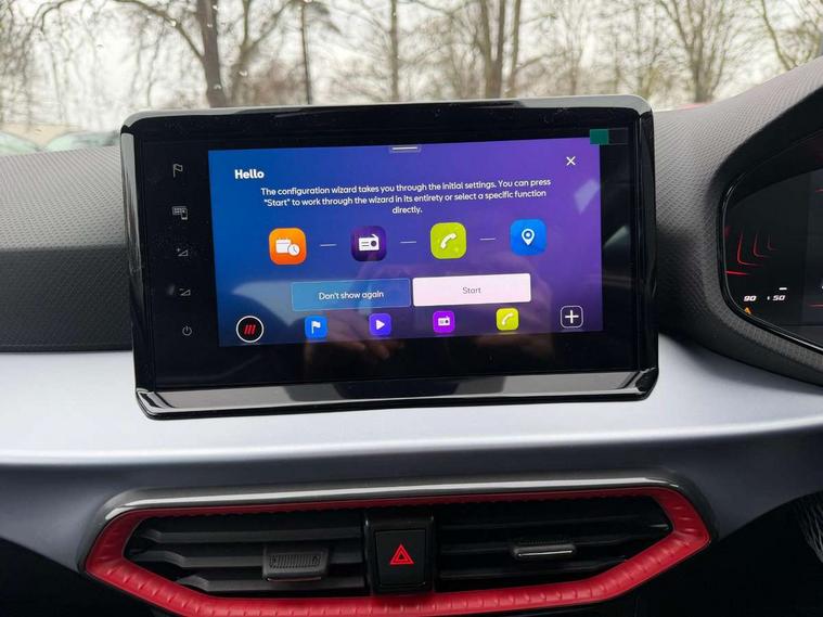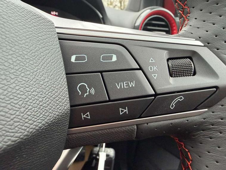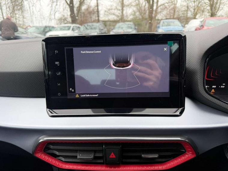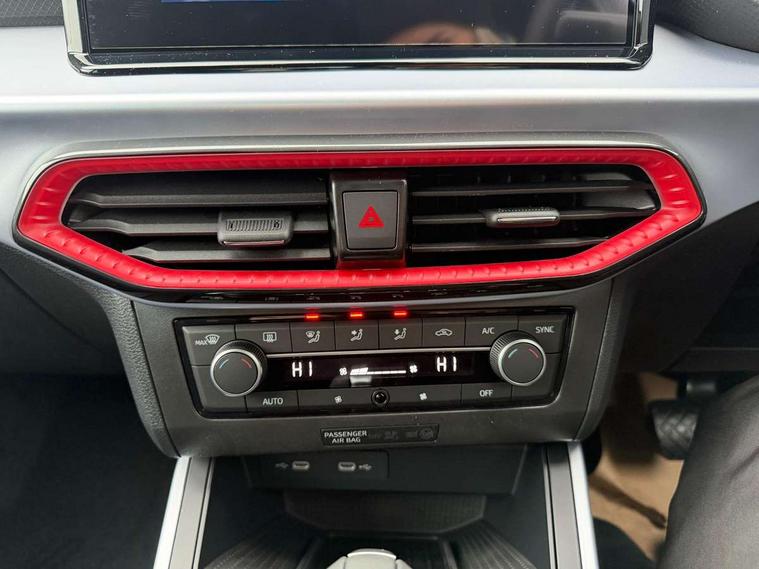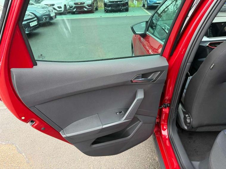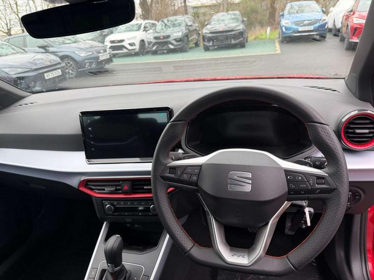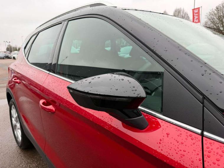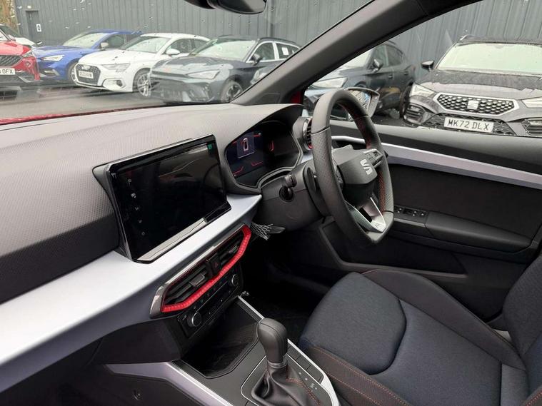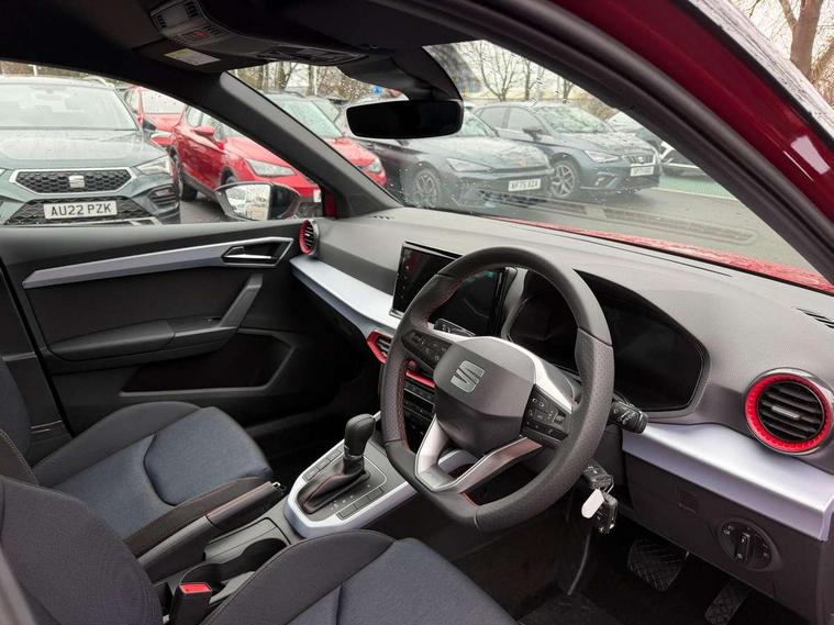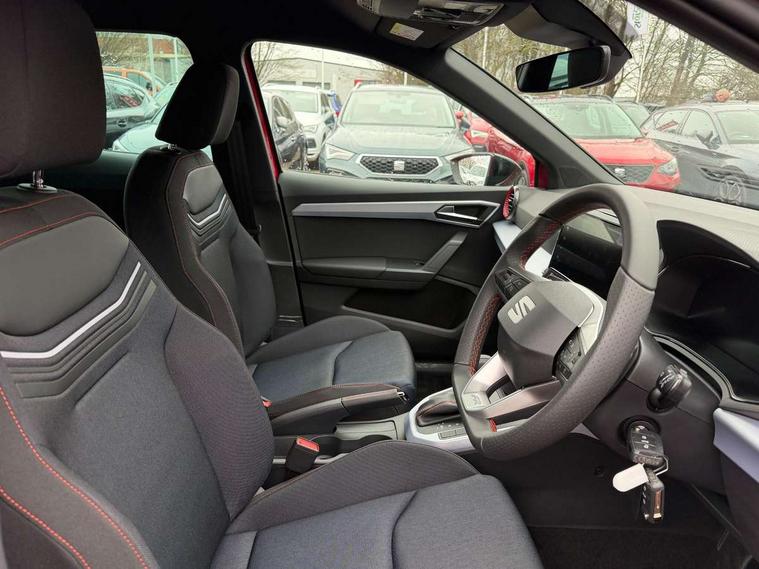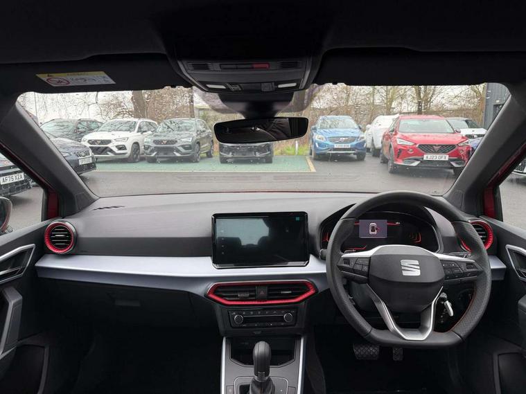 'Lights On' Reminder warning buzzer, 8" Digital cockpit, Digital clock, E-call, Electric speed sensitive power steering, Full link smartphone integration with mirror link, wireless apple carplay, Google android auto + USB Type C cable for apple and android devices, Lane keeping system, Low fuel warning light, Outside temperature display, RPM counter, SEAT Drive profile - Four different models normal-sport-eco-individual, steering response, throttle response and gear shifts mode, Trip computer, Wireless phone charger, 9.2" colour touchscreen with navigation system, voice control and USB port (type c), Bluetooth interface for hands free and audio streaming, DAB digital radio and AM/FM radio, Steering wheel mounted audio controls, Anti theft roof antenna, Auto dimming interior rear view mirror, Automatic activation of hazard warning lights, Body coloured bumpers, Body coloured door handle inserts, Chrome roof rails and window surrounds, Dark tinted rear windows, Electric front/rear windows, Electrically adjustable, heated and folding door mirrors, Front fog lights with cornering function and rear fog light, FULL LED automatic headlights with dynamic headlight range control, coming and leaving home, LED daytime running lights, LED rear tail lights and licence plate lights, Protective side mouldings, Rain sensing wipers, Rear side wing doors, Rear spoiler, Rear window wash/wipe, Roof colour door mirrors, Third brake light, Twin exhaust pipe styling hidden exhaust pipe, Visible VIN plate, 2 cupholders, 3 seat bench in 2nd row, 60/40 split folding rear seat, Aircare filter, Black interior roof, Cloth upholstery, Double boot floor, Driver sunvisor with covered mirror + card holder, Dual zone climate control, Front courtesy light with front reading lights, Gear shift indicator, Height adjustable front seats, Height/reach adjustable steering column, Illuminated air vent surrounds, Illuminated boot, Instrument lighting with brightness control, Interior ambient lighting, Interior light in footwell, central console and door panel, ISOFIX points in outer rear seats with top tether anchorage points, Passenger sunvisor with vanity mirror, Perforated flat bottomed leather steering wheel/gear knob/handbrake with red stitching and FR logo, Potentiometer, Single front passenger seat, Steering wheel mounted gearshift paddles, Two front and three rear height adjustable headrests, Interior chrome pack - Arona, Safe and driving pack (S) - Arona, 3 point seatbelts on all rear seats, ABS, Active front headrests, Child locks on rear doors, Driver and front passenger airbags with front passenger airbag de activation, front side and curtain airbags, Emergency Brake Assist (EBA) and front assist, Front and rear seatbelt reminder, Hill hold control, Multi-Collision braking, Tiredness recognition system, Traction control, Tyre pressure monitoring system, Alarm with back up horn with tow away protection, Deadlock, Electronic engine immobiliser, Locking wheel bolts, Remote central locking, Titan black dashboard, 17" Dynamic alloy wheels,