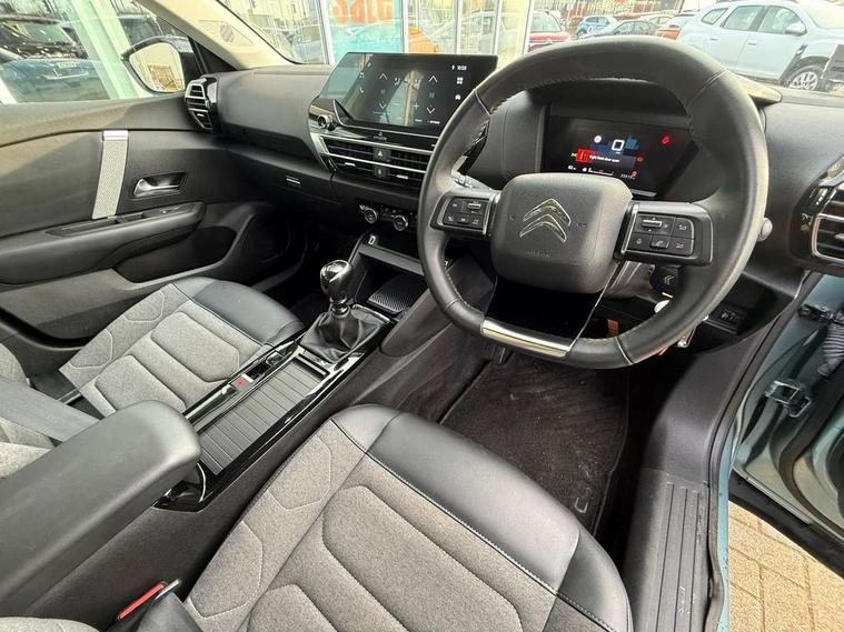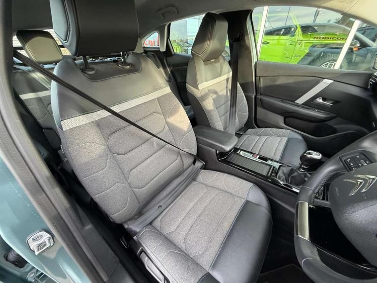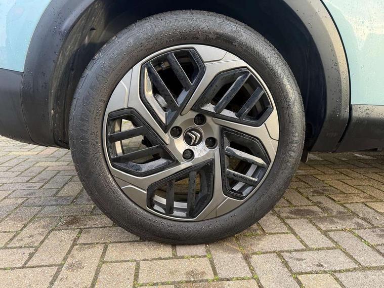 10" touchscreen user interface, controlling media, connectivity and vehicle settings, 5.5 inch backlit full TFT driver's instrument cluster, Apple car play and Android auto, Citroen connect box emergency and assistance system, Cruise control + speed limiter, Electronic Power Steering (EPS), In-crash braking, Rear parking sensors, Tailgate, Voice commands, Advanced comfort suspension - double hydraulic stops on front suspension and single on rear suspension, 6 speakers, Auxiliary input socket, Bluetooth telephone and audio streaming, DAB Digital radio, 3rd brake light, Automatic headlights, Body colour bumpers, Boot spoiler, Electrically heated and adjustable external rear view mirrors, Front and rear electric windows, Gloss black painted external rear view mirrors and black exterior door handles, Gloss black rear skirt, LED daytime running lights in V signature, LED front fog lamps with static cornering function, LED front headlamps, Rain sensing automatic front windscreen wipers, Rear side wing doors, Rear wiper, Roof aerial, Standard interior rear-view mirror with manual day-night switching, Tinted side windows with matt black detail, Welcome and goodbye lighting, 12V power outlet and USB Type-C socket for charging and data connection at 1st row, 3 rear headrests, 3 seat bench in 2nd row, Boot light, Chevrons cloth and leather effect textile seat upholstery, Dashboard tray in front cabin, Driver and passenger sun visors with vanity mirror, Dual zone automatic air conditioning, Front and rear interior lamps, Front head restraints, Grained leather steering wheel with two command blocks, Height adjustable driver's seat with adjustable lumbar support, Height adjustable front passenger seat, Height and reach adjustable steering wheel, Map pockets in rear of front seats, Raised centre console with armrest and two cup holders, Single front passenger seat, Single position boot floor, Split folding rear seats, Gloss black pack - C4/C4 X/e-C4 X, High level acoustic insulation pack - C4/C4 X/e-C4 X, 3x3 point rear seatbelts, ABS, Driver and front passenger airbags, Electric parking brake, ESP, Front seatbelt pretensioners, Hill start assist, Manual child lock in second row, Manual deactivation of front passenger airbag, Post collision safety brake, Row 1 and 2 curtain airbags, Row 1 side thorax airbags, Seatbelt unfastened on the move warning, Tyre underinflation detection, Immobiliser, Remote locking with deadlocks, Two remote keys, 18" Bi-tone painted aeroblade alloy wheels with anti-theft locking wheel nuts, Puncture repair kit with compressor,