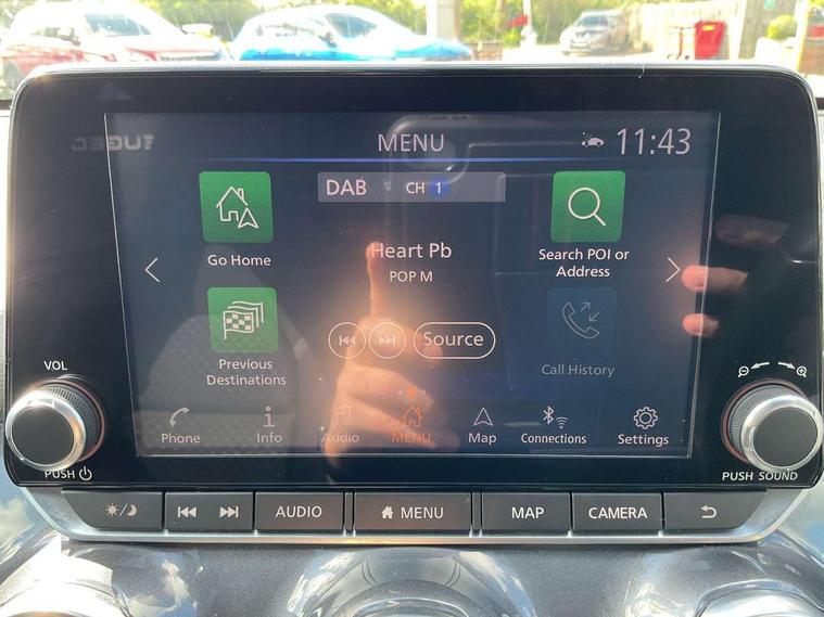 7" full colour TFT screen combimeter, 8" infotainment colour display with touch screen, Apple CarPlay and Google Android auto, Drive modes select (Eco, normal and sport), Emergency and breakdown call, Front parking sensor, Idle start/stop system, Intelligent lane intervention, Lane departure warning system, Nissan connect nav with TomTom traffic, Nissan connect services and Wifi connection, Outside temperature sensor, Power Steering, Rear parking sensor, Traffic sign recognition, Trip computer, Gasoline particulate filter, 6 speakers, Bluetooth system, USB, Aux-in and 12V socket, DAB Digital radio, Rear console USB port, Auto dimming interior rear view mirror, Automatic hazard signal with emergency stop signal, Body colour bumpers, Body colour door handles, Electrically adjustable door mirrors with integrated indicators, Follow me home headlights, Front and rear electric window with one touch driver and passenger window, Heated and auto folding door mirrors, High beam assist, LED daytime running lights, LED front fog lights, LED headlamps, LED rear fog lamp, LED rear lamps, Rain sensor windscreen wipers, Rear privacy glass, Rear spoiler, Rear wiper, Three blink turn signal, 3 height adjustable rear headrests, 60/40 split folding rear seat, Automatic climate control, Card holder on driver sunvisor, Cloth upholstery, Door ambient lighting, Driver and passenger sliding and reclining seats, Driver seat back pocket, Driver side rear coat hanger, Driver/passenger sunvisors and illuminated vanity mirrors, Front and rear cabin lights, Front armrest, Front door pockets with bottle holders, Front head restraints, Front/rear passenger grab handles, Gear console ambient circle lighting, Grey synthetic leather kneepad, Height adjustable driver's seat, Internal chrome door handles, Leather gearshift knob, Leather steering wheel, Luggage board, Luggage space lighting, Monoform sporty seats, Multifunction steering wheel, Passenger seat back pocket, Rear door bottle holders, Steering wheel mounted gearshift paddles, Telescopic steering wheel adjustment, Two cupholders in front centre console, Two rear isofix child seat anchorage points with top tether, Voice recognition switch on steering wheel, Welcome light and console tray ambient lighting, ABS with EBD and brake assist, Active ride control, Active Trace Control, Driver and passenger airbags, Driver and passenger side airbags, Electric handbrake with auto hold function, Electronic Stability Programme (ESP), Front and rear curtain airbags, Height adjustable seatbelts, Hill start assist, Intelligent emergency braking with pedestrian and cyclist recognition, Seatbelt reminder for driver/front passenger and rear seats, Single tone horn, Three 3 point rear seatbelts, Traction control, Tyre pressure monitoring system, VDC Dynamic Vehicle Control, Ventilated rear brake discs, Alarm, Immobiliser, Intelligent Key with push button starter, Remote central locking,