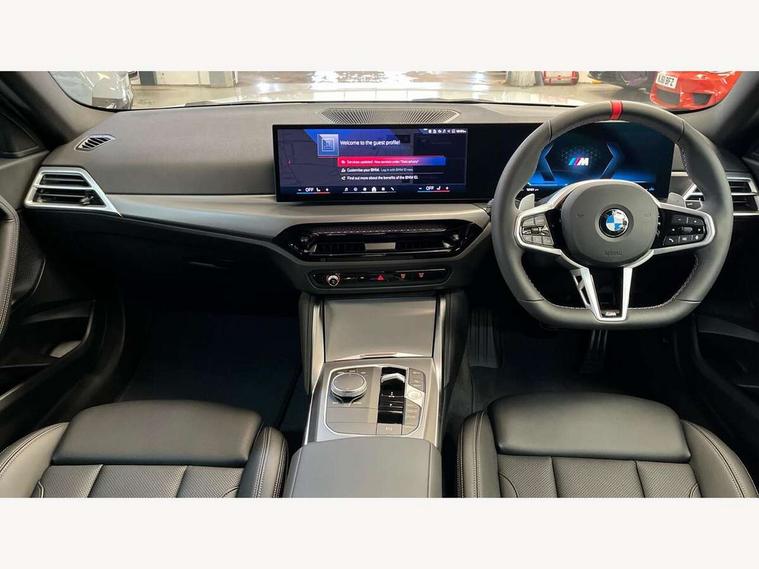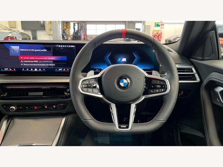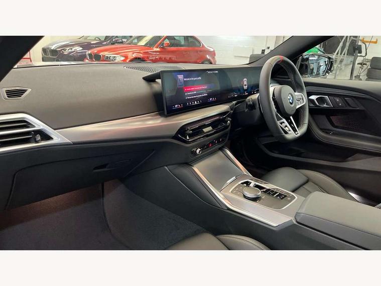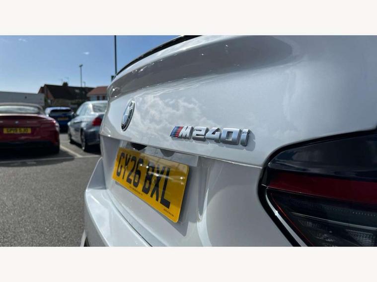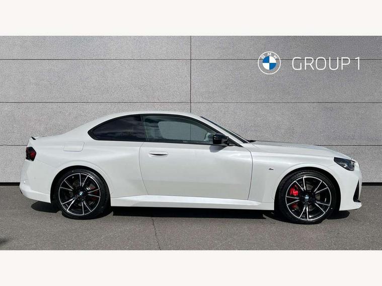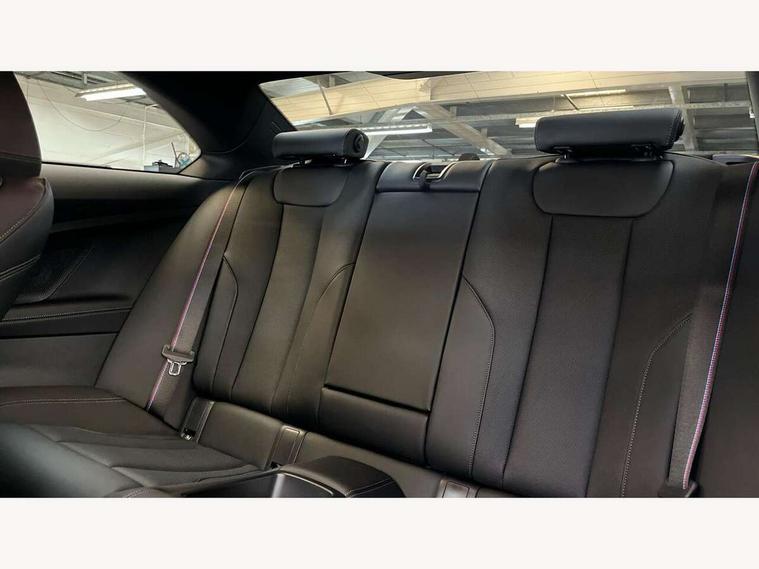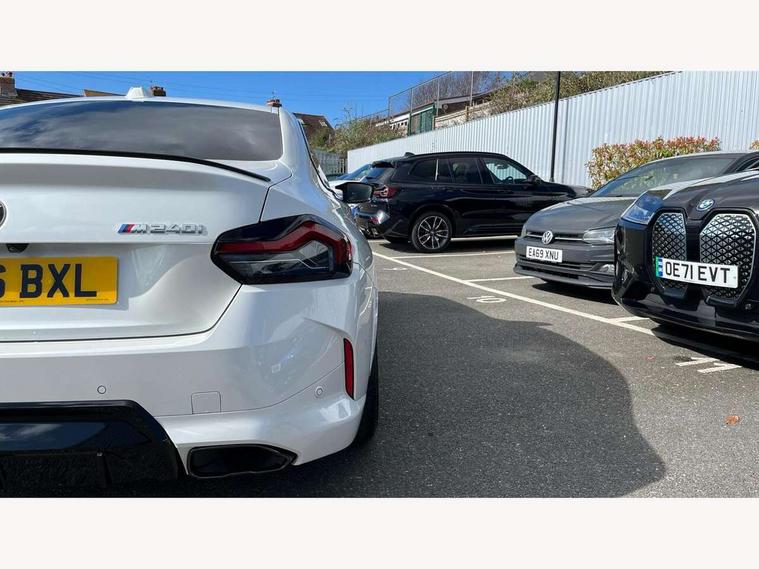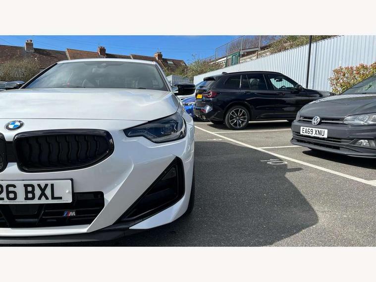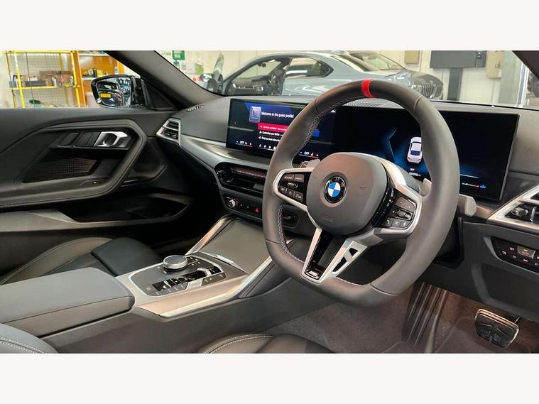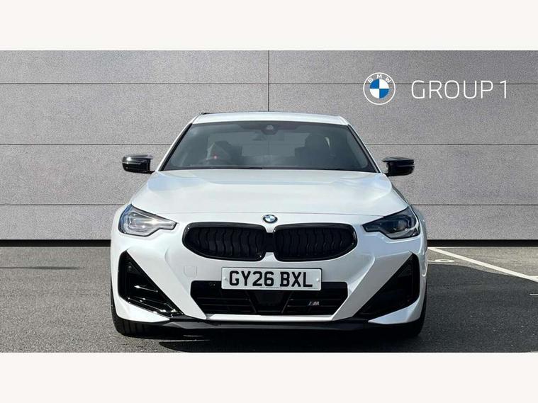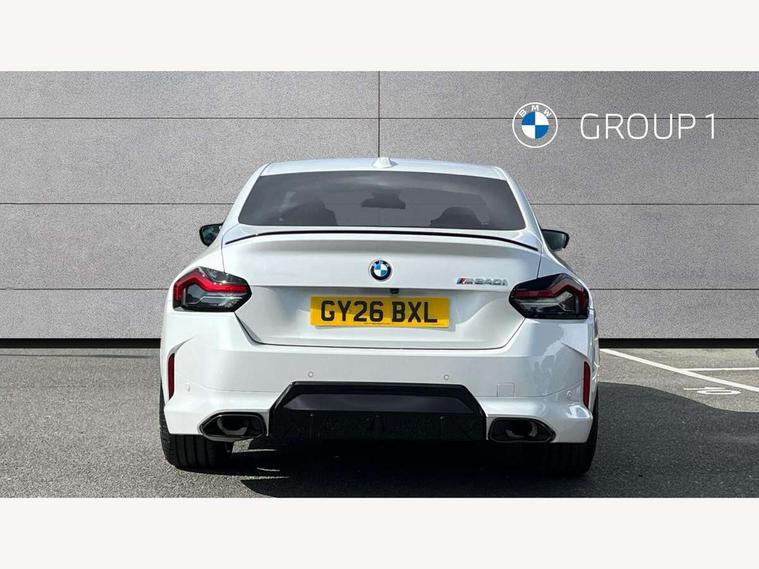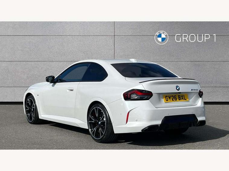 Active guard plus, Attentiveness assist, Bluetooth with USB, BMW ConnectedDrive online services, BMW Intelligent Personal Assistant, BMW Live cockpit plus, BMW Maps, BMW Teleservices, Check Control warning system for monitoring of lights and door/luggage compartment open warning, Control Infotainment, Direct selection buttons, Drive off assistant, eSim with 5G connectivity, Front and rear parking sensors, iDrive controller with turn and press function, Intelligent functions, Oil sensor for level and grade, Optimum shift indicator, Parking assistant with active park distance control, reversing assistant, lateral parking aid and rear view camera, Personal Profile, Smartphone integration, Touch operation on control display, Variable sport steering, Widescreen display with 12.3" fully digital instrument cluster and 14.9" control display, WiFi interface for wireless connection of mobile terminal devices, Aluminium lightweight construction, Balancer shaft, BMW TwinPower Turbo inline 6-cylinder petrol engine, Double VANOS, Dynamic stability control, High precision injection, M Sport differential, Petrol Particulate Filter, Sport automatic steptronic transmission with gearshift paddles, manual gearshift time display, launch control, coasting idle ECO PRO/COMFORT modes, Twin scroll turbocharger with Valvetronic, xDrive with rear orientated application, 1 x USB Type A with data transfer and 1.5 Ampere charging function in the centre console, 1 x USB Type C with 3 Ampere charging function in the front centre armrest, DAB tuner, Acoustic windscreen wipers for reduced driving noise, Automatic windscreen wipers and automatic headlight, Body color M rear spoiler, Body colour door handles flush with door surface, Body colour front and rear bumpers, Daytime running lights, Electric windows - front and rear, with open/close fingertip control and trap release, Exhaust tailpipes in high gloss black, Extended high gloss shadow line exterior trim, Exterior air inlets in front bumper with embellishers in high gloss black, Fading support, Flap controlled M Sport exhaust system, Front and rear bumper system with replaceable deformation elements, Front door sill finishers in black plastic with BMW designation, Front windscreen wipers with integrated washer jets, Green tinted heat protection glazing, High gloss black exterior M mirror caps, High gloss black radiator grille frame, High level third brake light, Indicators integrated int mirror housing, Interior rear-view mirror with automatic anti-dazzle function, LED registration plate light, LED technology rear tail lights, brake lights and turn indicators, M Aerodynamics front and rear aprons in vehicle colour and diffuser insert in black high-gloss, M entry sills, front, M high gloss shadowline, M logo in front air inlet, M model badge on front side panel, left and right, M pedal mechanism, Model and M badges in pearl chrome, Rear boot, Rear fog lights, Reversing light in rear light cluster, Roof trim strip in vehicle colour, Shark fin antenna, Side frame trim strip in high gloss black, Side sill trim panels in vehicle colour, Single part LED rear lights with smoked glass components, Sun protection glass, Trailer stabilisation logic, Visible VIN plate, Window recess finisher strip in high gloss black, xDrive designation on left tailgate, 12V power socket in front centre console with blanking plug, 2 cupholders in front centre console, 2 zone automatic air conditioning, 3 spoke flat bottom M leather steering wheel with center red mark, Ambient door pocket lighting in the cetre console, Ambient inside door handle light, Area lighting in the door trim panel, Conditioned based service, Door entry lights in the front door trim panel, Dynamic ambient lighting for welcome, goodbye, open doors, phone call, English handbook, Folding rear seat head rests, Front ambient footwell lighting, Front ambient lighting, Front and rear side armrests integrated into door trim, Front armrest, Front door pockets, Front head restraints, Heated front seats, Illuminated glove compartment with separate small compartment, M headliner Anthracite, M240i badge in instrument cluster, Manually adjustment steering wheel column, Rear seat backrest with manual 40:20:40 split folding, Rear seat centre foldable armrest with integrated cup holder, Single front passenger seat, Storage compartment between rear seats, Storage tray and compartment with cover in centre console, Sun visors with vanity mirrors and insert tab, Through loading system with 40/20/40 split folding 2 rear seat in 2nd row, Velour floor mats, Connected pack professional - 2 Series Coupe, Storage compartment pack - 2 Series Coupe, 2 tone horn, Anti lock braking system (ABS) with cornering brake control, BMW emergency call, Brake drying, Child seat ISOFIX attachment for the two outer rear seats, Crash sensor activating of airbags, Unlocking doors, hazard warning lights, interior light, safety battery terminal, Deactivation of fuel pump in the event of a crash, Driver and front passenger airbags, Driver and front passenger side airbags, integrated in the door side seat backrest bolsters for all seat variants, Dynamic brake control, Dynamic Traction Control - DTC, Electrically operated hand brake including automatic hold function and automatic release when driving off, Front and rear disc brakes, Front centre airbag between driver and front passenger seats, Front passenger airbag deactivation, Head airbags for all 4 outer seats, M Sport brakes with dark blue metallic calipers, PC iBrake (Post crash approach control warning with light braking function), Seat belt security check for driver and front passenger, Seatbelt warning, Side impact protection, Three point seat belts on 4 seats including front belt stopper, pyrotechnic belt tensioners and belt force limiters, Tyre pressure monitoring system, Warning triangle and first aid kit, Alarm system (Thatcham 1) with remote control and electronic engine immobiliser, Central locking switch f