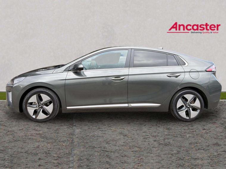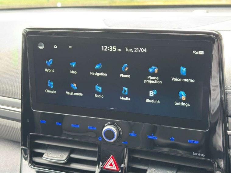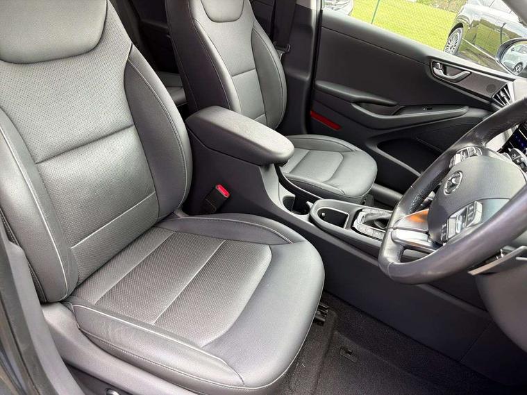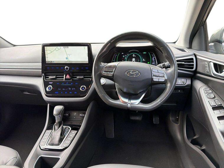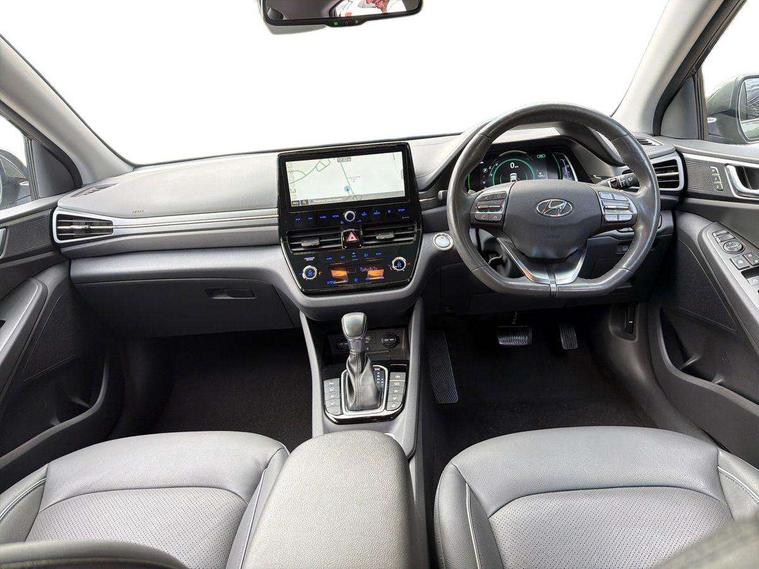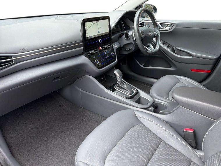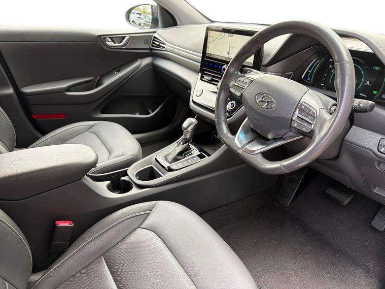 10.25" touchscreen satellite navigation includes traffic messaging channel, mapcare, live services and bluelink, Adaptive cruise control with Stop and Go, Apple car play/Android Auto, Blind spot detection system, Bluetooth system, Driver attention alert system, E-call, Eco driving assistant system (ECO DAS), Electric power steering with variable drive modes, Front and rear parking sensors, Gear lever drive mode selector, Lane departure warning system with lane keep assist - LKAS, Lane follow assist, Parking system with rear camera and guidance system, Rear cross traffic alert, Rear view monitor, Roadside assistance, Supervision cluster with 7" high resolution TFT LCD, Voice recognition, Windscreen washer fluid sensor and warning indicator, Wireless phone charging pad, DAB Digital radio, Infinity sound system includes 1 centre, 2 tweeters, 2 front, 2 rear and 1 ext amp, Radio data system, Steering wheel audio, phone and cruise controls, USB and aux connection in front, Active air flap radiator grille, Auto dimming rear view mirror, Automatic defog system for front windscreen, Automatic headlights with dusk sensor, Automatic windscreen wipers with rain sensor, Body colour bumpers, Body colour door handles with chrome inserts, Body colour door mirrors, Bodyside mouldings, Chrome door scuff with ioniq logo, Chrome finish window surround, Chrome radiator grille, Door mirror puddle lights, Electric adjustable door mirrors, Electric front windows - anti trap + one touch, Electric heated door mirrors, Heated rear windscreen, High beam assist, LED daytime running lights, LED Headlights, LED indicators in door mirrors, LED rear fog light, Positioning Lights - LED, Power folding door mirrors, Privacy glass, Rear electric windows, Rear LED lights, Rear roof spoiler with integrated LED brake light, Solar glass with windscreen shade band, Two tone rear bumper, 12V power outlets, 60/40 split folding rear seat, Centre console storage, Centre interior light, Chrome interior door handles, Driver's electric adjustable lumbar support, Driver's seat memory, Driver/passenger sunvisors with illuminated vanity mirrors, Dual zone climate control, Electric height adjustable driver seat, Front centre armrest with storage compartment, Front cupholder, Front head restraints with vertical and horizontal adjustment, Front seat and rear pockets, Heated front seats, Heated outer rear seats, Heated steering wheel, Illuminated luggage compartment, Interior mood lighting, Leather upholstery, Leather wrapped steering wheel, Luggage net, Manual height adjustable front passenger seat, Map and reading lights, Paddle shifter, Rear centre console with air vents, Sunglasses holder, USB - driver arm rest (charging only), Ventilated front seats, Vertical adjustment rear head restraints, 3x3 point rear seatbelts, Airbags - front, front side, curtain and drivers knee airbags, Anti-lock brake system (ABS), Autonomous emergency braking, Electric parking brake, Electronic stability control, Front passenger airbag deactivation switch, Hill start assist control (HAC), Regenerative braking system, Traction control, Tyre pressure monitoring system with individual tyre pressure display, Deadlocks, Immobiliser, Keyless smart entry with push button start, Remote central locking, Tyre repair kit,