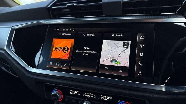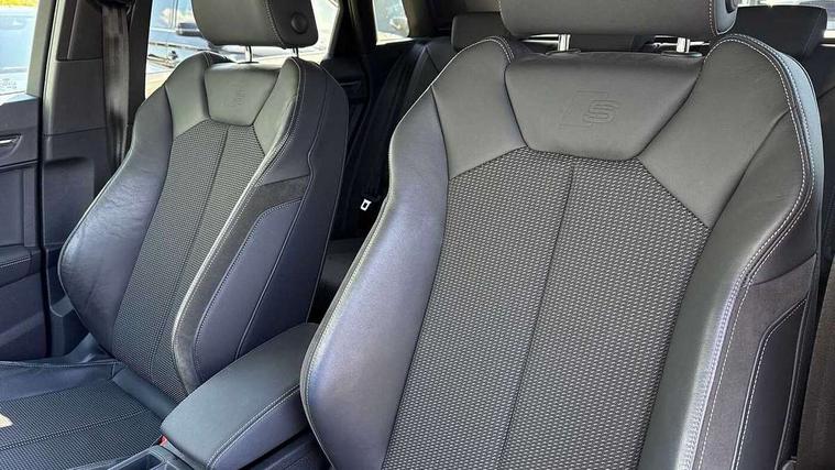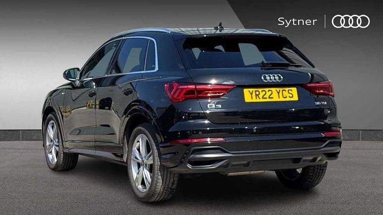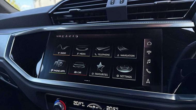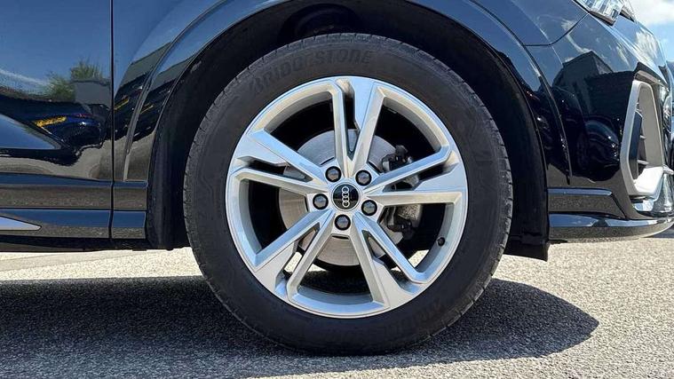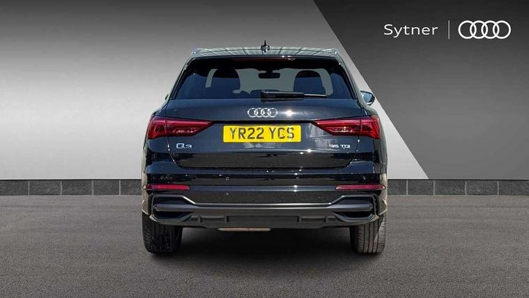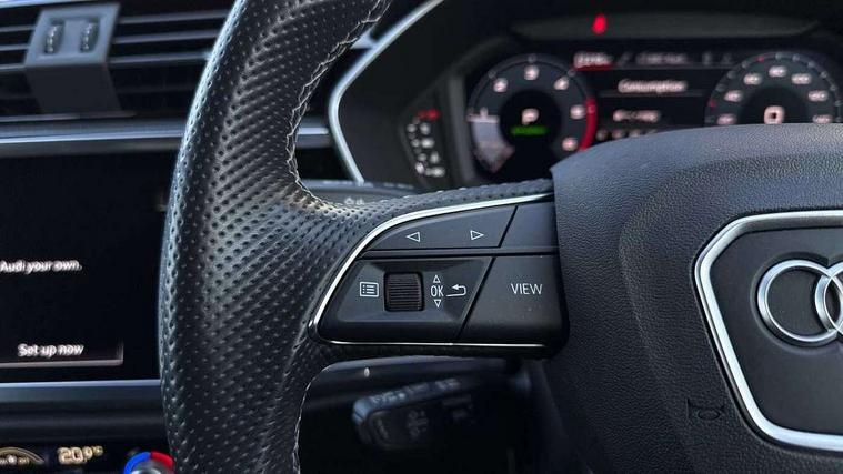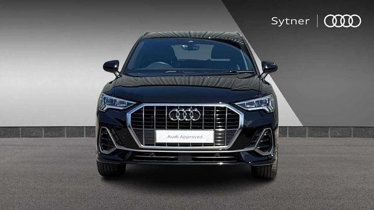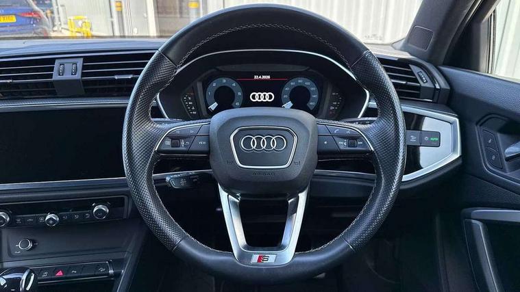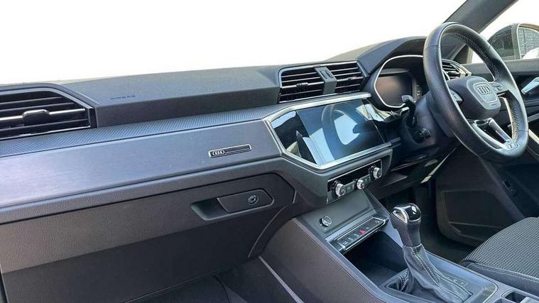 Amazon alexa Integration, Audi connect safety and service (e-call), Audi drive select, Audi lane departure warning, Audi Virtual Cockpit - 10.25" display, Bluetooth interface, Camera based traffic sign recognition, MMI Navigation Plus with high resolution 10.1 inch touchscreen colour display, Power operated tailgate, Progressive steering, Service interval indicator, Smartphone interface includes wireless Apple carplay/Android Auto, Start stop system with recuperation, Voice control system with natural language interaction, Diesel particulate filter, Sports suspension, 2 USB-C ports with charge and data functions, 6 passive loudspeakers, DAB digital radio module, Acoustic windscreen, Aluminium roof rails, Aluminium window trim, Auto dimming frameless rear view mirror, Body coloured bumpers, Electrically folding, adjustable and heated door mirrors with integrated LED side indicators and kerb view function for passenger side, Front and rear electric windows, Front fog lights, Front side air inlets in matt platinum grey, Front spoiler blade in matt platinum grey, Grille vertical bars in aluminium silver/Matt, High gloss black finish B and C pillars, LED headlights with LED daytime running lights, LED rear lights, LED third brake light, Privacy glass dark tinted rear and rear-side windows (from B-pillar backwards), Rain and light sensors, Rear diffuser strip in matt titanium black, Rear side wing doors, Rear wiper, S line badges on front wings, S Line front and rear bumpers, Side skirt insert in matt Platinium grey, Silver chrome grille surround, Tinted rear windows, Titanium black radiator grille, Variable front intermittent wipers, 12V socket in rear centre console, 3 seat bench in 2nd row, 40:20:40 folding with manual adjustment for 60:40 forwards/backwards position and backrest angle, Adjustable rear seat bench/backrest with centre armrest and cupholder, Black cloth headlining, Dual zone electronic climate control, Front and rear black floor mats with contrast stitching in rock grey, Front and rear headrests, Front and rear roof module including reading lights, Front centre armrest, Glove compartment lighting, Height and reach adjustable steering wheel, Illuminated door sill trims with S logo, ISOFIX child seat mounting for front passenger with airbag deactivation and outer rear seat including top tether attachment point for outer rear seats, Luggage compartment light, Manual front seats with height adjustment, Perforated leather gearknob, Single front passenger seat, Stainless steel luggage compartment sill finisher, Stainless steel pedals, Non smoking pack - Q3, 3x3 point rear seatbelts, 6 airbags - Driver, front passenger, curtain and side windows, Audi pre-sense front with pedestrain and cyclist recognition, Electrically operated child locks on rear doors, Electromechanical parking brake, Electronic stabilisation control including ABS, ASR and EDL, Front seatbelt reminder, Hill descent control, Hill hold assist, Pre sense basic, Seatbelt monitoring, Tyre pressure warning, Warning triangle and first aid kit, Anti theft alarm, Anti theft wheel bolts, Immobiliser, Remote central locking, Dark matt brushed aluminium inlay, Detail dashboard around MMI touch colour display in glass look, black with surround in aluminium look, Leatherette door armrest,