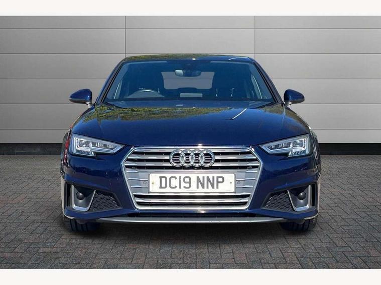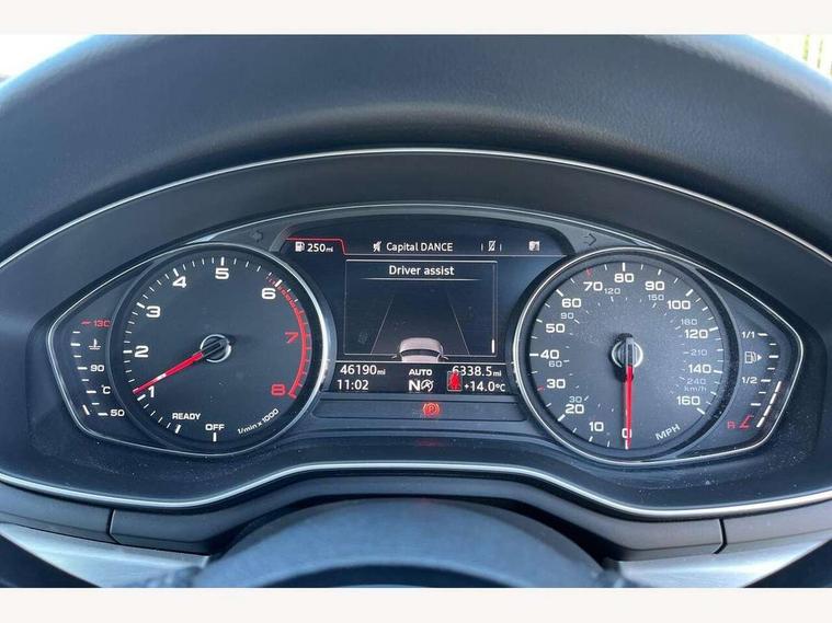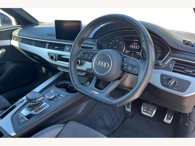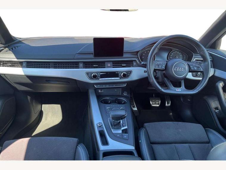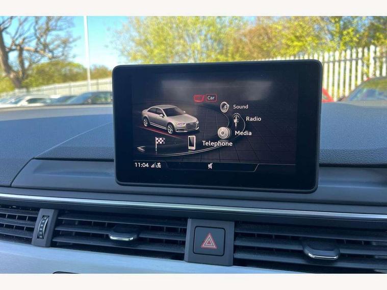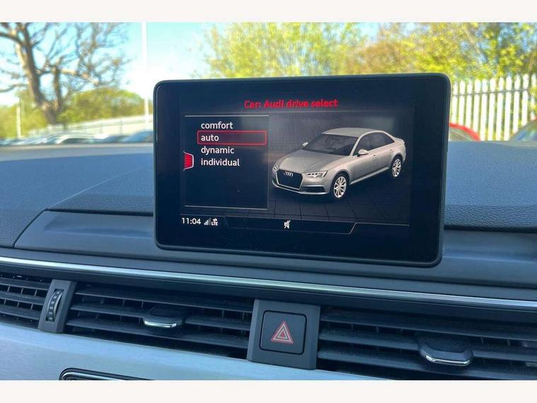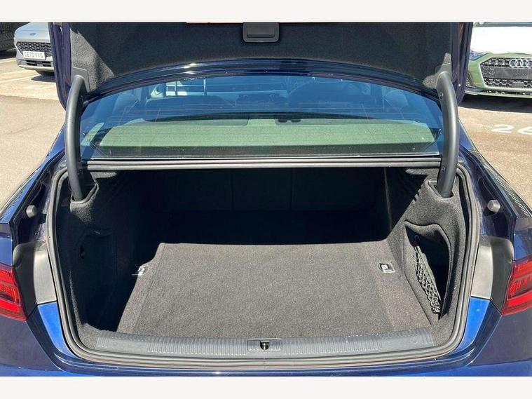 7" Colour driver information system, Audi connect safety and service (e-call), Audi drive select, Audi parking system plus with front and rear sensors, Audi Pre sense collision avoidance, Bluetooth interface, Electric boot release, Electromechanical power steering, MMI SD card Navigation, Service interval indicator, Stop/start button, Voice control system, 54 litre fuel tank, 2 USB interfaces and Aux-In jack, DAB digital radio module, Acoustic windscreen, Air inlets in titan black with two horizontal inlays in chrome, Aluminium window trim, Auto dimming rear view mirror, Automatic headlights + automatic windscreen wipers, Black grained rear grille, Blue tinted glass, Body colour bumpers, Body colour door handles, Body colour door mirrors, Chrome rolled exhaust, Chrome tailpipe finisher, Electric front windows, Electric rear windows, Headlight range control, High beam assistant, High gloss black triangular aperture at rear door, LED daytime running lights, LED indicators in door mirrors, Rain and light sensors, Rear diffuser in Twilight grey matt, S Line badges on the front wings, S line front and rear bumpers with side skirts, Twilight grey matt radiator grille with chrome inlay, 3 zone climate control, 4 way electric lumbar support for driver and front passenger, 40/20/40 split folding rear seats with rear centre armrest, Black cloth headlining, Contrast stitching on seats, steering wheel and gear lever gaiter, Front centre armrest, Front headrests, Front/rear floor mats, Height and reach adjustable steering wheel with full size airbag, Illuminated door sill finishers, Isofix child seat preparation for front passenger/outer rear seats inc passenger airbag deactivation, Jack and tool kit, Luggage compartment carpet, Perforated leather gearknob, Rear headrests, Stainless steel foot rest, Stainless steel pedals, Sunvisors with vanity mirrors, Top tether anchor plate for isofix child seat, Non Smokers pack, S line exterior styling pack - A4 Saloon, 3 point seatbelts on all rear seats, Adaptive driver and front passenger airbags, Electromechanical parking brake, Electronic stabilisation control including ABS, ASR and EDL, Front head airbags, Front seatbelt pretensioners + load limiters, Front side airbags, Multi-Collision braking, Pop-up bonnet for pedestrian protection, Seatbelt warning, Traction control, Tyre pressure warning, Variable restraint system, Warning triangle and first aid kit, Anti theft alarm, Keyless Start, Locking wheel bolts, Remote central locking, Thatcham category 1 alarm + immobiliser, MMI radio plus with smartphone interface, Tyre repair kit,