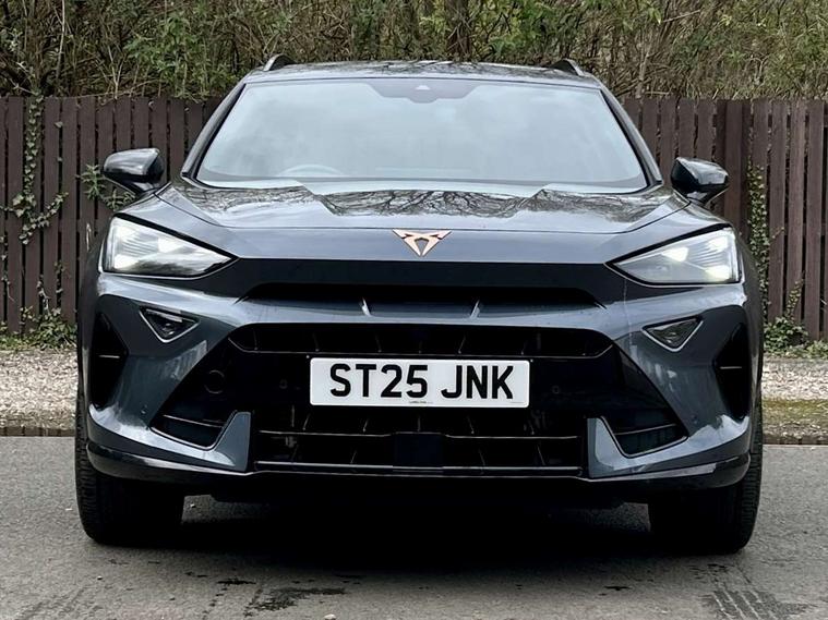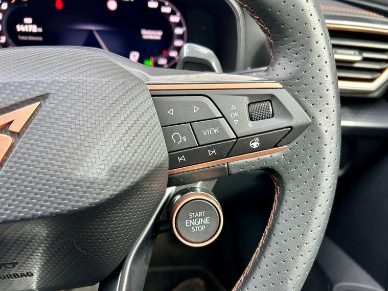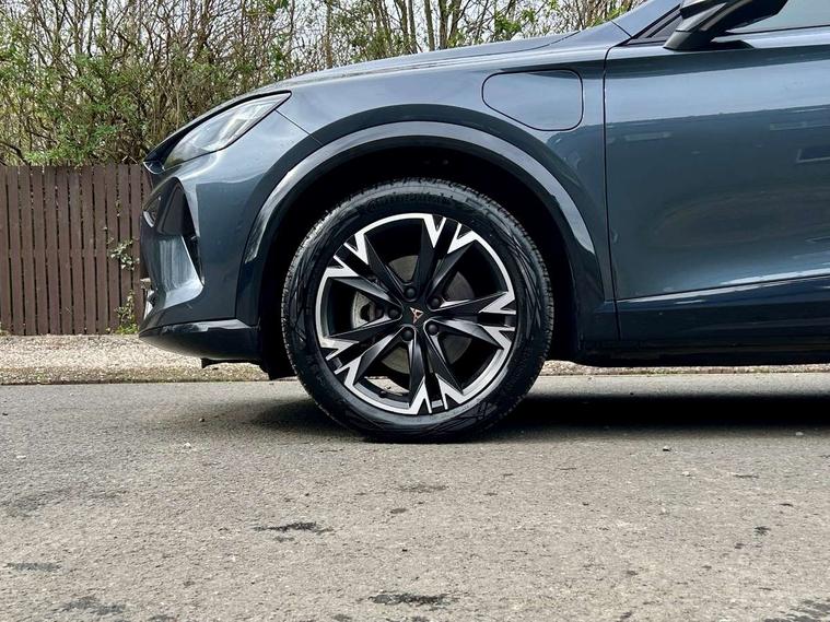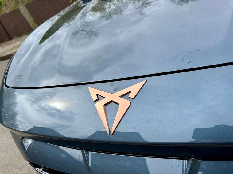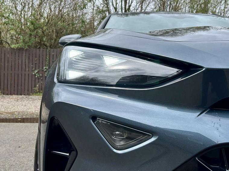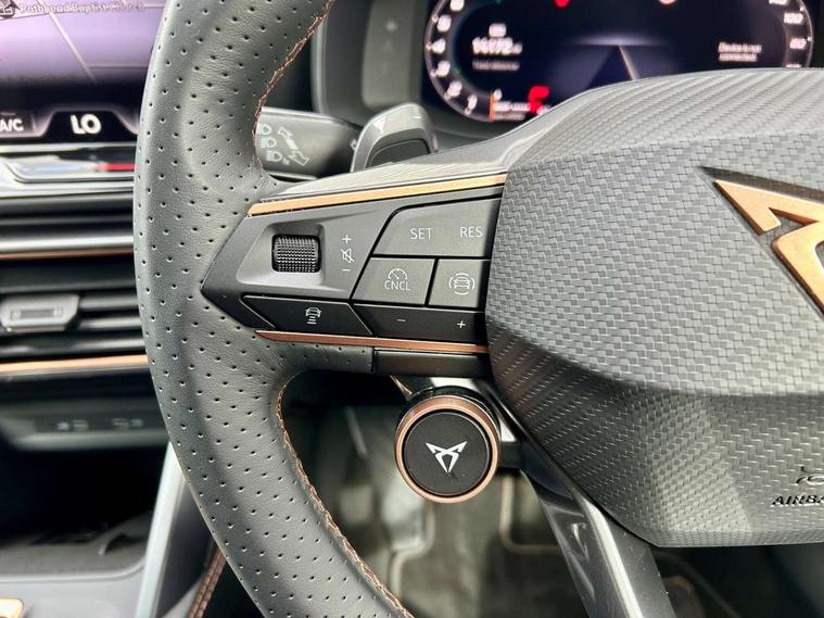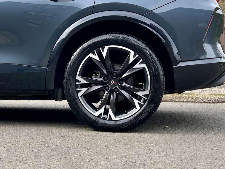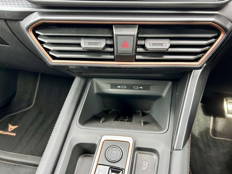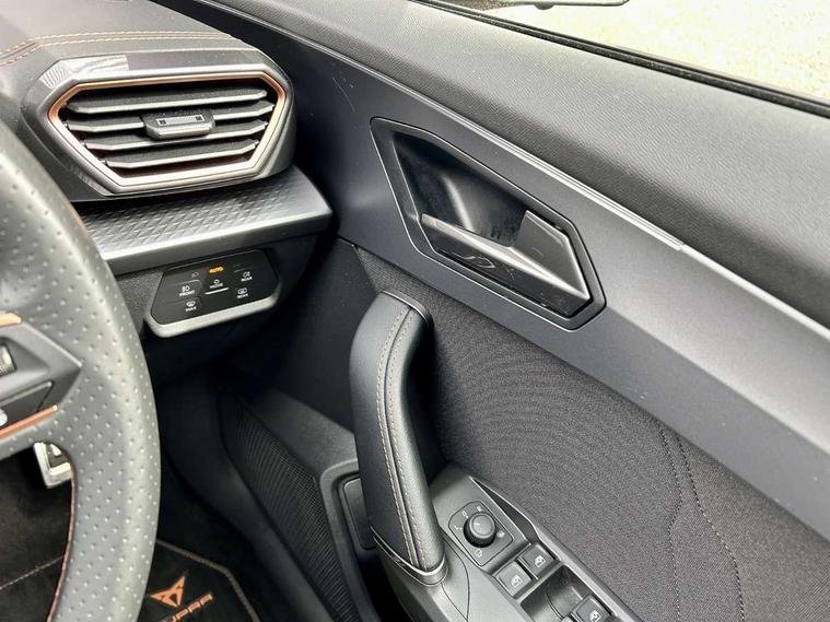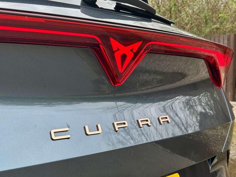 10.25" digital cockpit and configurable dashboard, Adaptive cruise control with follow-to-stop and speed limiter, Advanced driver alert system, Driving profile selection, Dynamic road sign display, Emergency steering support with turn assist, Forward collision warning with automatic braking, Front and rear parking sensors, Full link phone integration, Lane assist, Progressive steering, RPM, trip computer, outside temp gauge, instrument light brightness, low fuel warning light, lights on reminder, gearshift indicator, Service interval indicator, Start/stop system with regenerative braking, Voice control system, Wired Android Auto, Wireless apple carplay, Wireless phone charger, 10 amp mode 2 charging cable, 32 amp mode 3 charging cable, CUPRA sport suspension, Electronic locking differential and dynamic traction support, 2 front and 2 rear USB type C sockets, 7 speakers, Media system with navigation, 12.9" touchscreen display, voice control, DAB, steering wheel mounted controls, Auto dimming rear view mirror, Body colour door handles, Body coloured bumpers, Dark grey wing mirror, Daytime running light with automatic headlight control and coming home feature, Door panel ambient lighting, Dynamic headlight range control, Electric front/rear windows, Electrically adjustable, heated and folding door mirrors, Gloss black roof rails and window surrounds, High beam assist, LED 3rd brake light, LED front fog lamps with cornering function, LED Headlights, LED Taillights with dynamic indicator, Rain sensing wipers, Rear diffuser with copper simulated exhaust pipes, Rear fog lights, Rear side wing doors, Rear wash/wipe, Tinted rear windows, Welcome lights (within exterior mirror housing), 12V socket, 2 front and 2 rear reading lights, 3 seat bench in 2nd row, 60/40 split rear bench seat with armrest and mechanical seat release, Black headlining, Black interior roof lining, Cupra sports pedals, Dust/pollen filter, Front and rear head restraints, Front centre armrest, Heated supersports multifunction leather steering wheel with satellite buttons and gear shift paddles, Height/reach adjust steering wheel, Illuminated aluminium doorsteps, Illuminated interior front door sills, Illuminated sunvisor with mirror, Interior ambient lighting, Isofix, Manually adjustable height and lumbar support for front seats, PVC/Cloth upholstery with copper stitching + Sport seats, Satellite steering wheel, Single front passenger seat, Storage pockets on rear of front seats, Three zone climate control with control panel in rear, 3 point seatbelts on all rear seats, ABS, Brake control system - ESC and brake booster, Child proof door locks, Driver and front passenger airbags with front passenger airbag de-activation, Electronic parking brake, Front and rear disc brakes, Front side curtain airbags, Hill hold control, Public e-call, Seat belt reminder for front and rear seats, Tyre pressure monitoring system, Anti theft alarm system, Central locking system Keyless Go, Locking wheel bolts, Copper and aluminium interior detailing, 18" Sonora machined silver alloy wheels, Breakdown and tool kit,