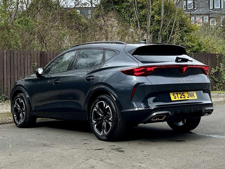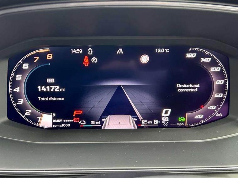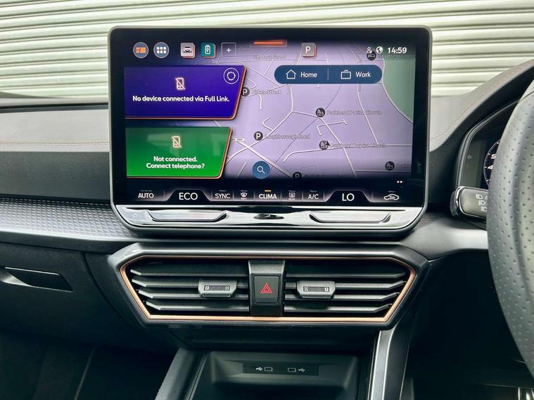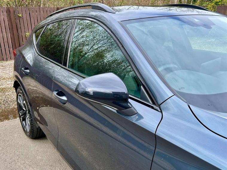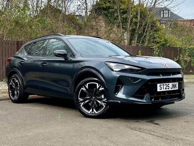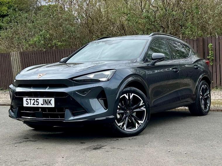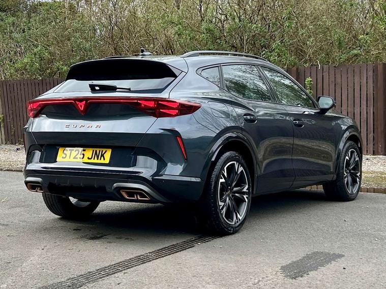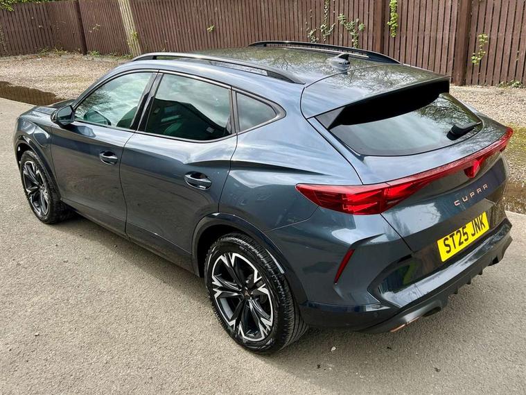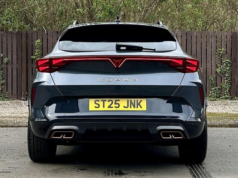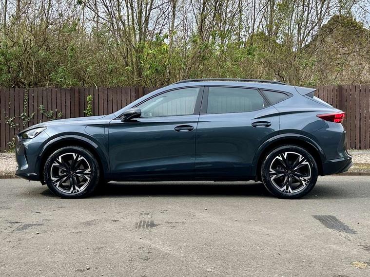 10.25" digital cockpit and configurable dashboard, Adaptive cruise control with follow-to-stop and speed limiter, Advanced driver alert system, Driving profile selection, Dynamic road sign display, Emergency steering support with turn assist, Forward collision warning with automatic braking, Front and rear parking sensors, Full link phone integration, Lane assist, Progressive steering, RPM, trip computer, outside temp gauge, instrument light brightness, low fuel warning light, lights on reminder, gearshift indicator, Service interval indicator, Start/stop system with regenerative braking, Voice control system, Wired Android Auto, Wireless apple carplay, Wireless phone charger, 10 amp mode 2 charging cable, 32 amp mode 3 charging cable, CUPRA sport suspension, Electronic locking differential and dynamic traction support, 2 front and 2 rear USB type C sockets, 7 speakers, Media system with navigation, 12.9" touchscreen display, voice control, DAB, steering wheel mounted controls, Auto dimming rear view mirror, Body colour door handles, Body coloured bumpers, Dark grey wing mirror, Daytime running light with automatic headlight control and coming home feature, Door panel ambient lighting, Dynamic headlight range control, Electric front/rear windows, Electrically adjustable, heated and folding door mirrors, Gloss black roof rails and window surrounds, High beam assist, LED 3rd brake light, LED front fog lamps with cornering function, LED Headlights, LED Taillights with dynamic indicator, Rain sensing wipers, Rear diffuser with copper simulated exhaust pipes, Rear fog lights, Rear side wing doors, Rear wash/wipe, Tinted rear windows, Welcome lights (within exterior mirror housing), 12V socket, 2 front and 2 rear reading lights, 3 seat bench in 2nd row, 60/40 split rear bench seat with armrest and mechanical seat release, Black headlining, Black interior roof lining, Cupra sports pedals, Dust/pollen filter, Front and rear head restraints, Front centre armrest, Heated supersports multifunction leather steering wheel with satellite buttons and gear shift paddles, Height/reach adjust steering wheel, Illuminated aluminium doorsteps, Illuminated interior front door sills, Illuminated sunvisor with mirror, Interior ambient lighting, Isofix, Manually adjustable height and lumbar support for front seats, PVC/Cloth upholstery with copper stitching + Sport seats, Satellite steering wheel, Single front passenger seat, Storage pockets on rear of front seats, Three zone climate control with control panel in rear, 3 point seatbelts on all rear seats, ABS, Brake control system - ESC and brake booster, Child proof door locks, Driver and front passenger airbags with front passenger airbag de-activation, Electronic parking brake, Front and rear disc brakes, Front side curtain airbags, Hill hold control, Public e-call, Seat belt reminder for front and rear seats, Tyre pressure monitoring system, Anti theft alarm system, Central locking system Keyless Go, Locking wheel bolts, Copper and aluminium interior detailing, 18" Sonora machined silver alloy wheels, Breakdown and tool kit,