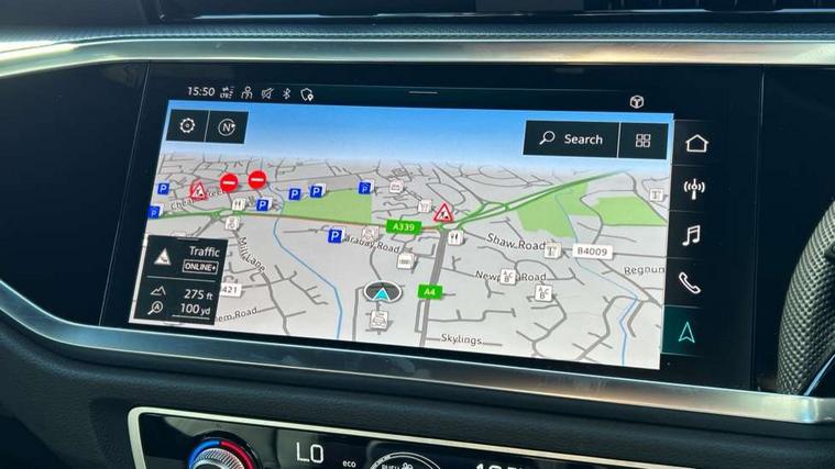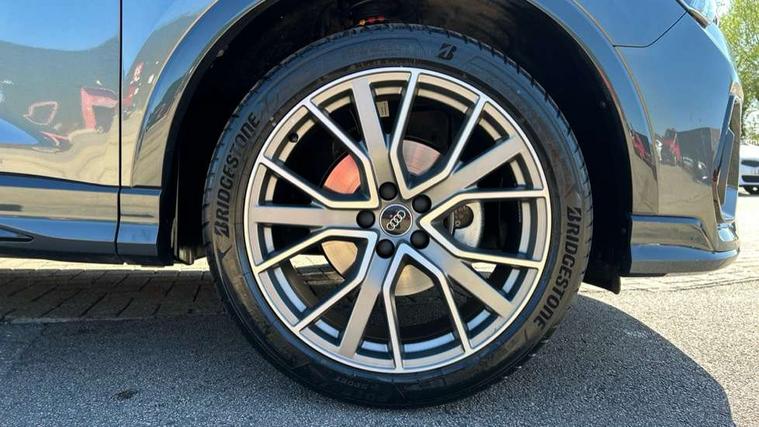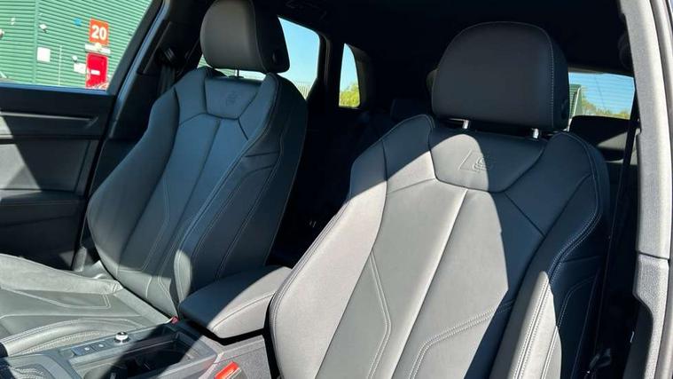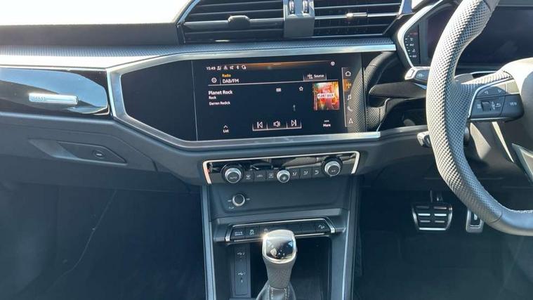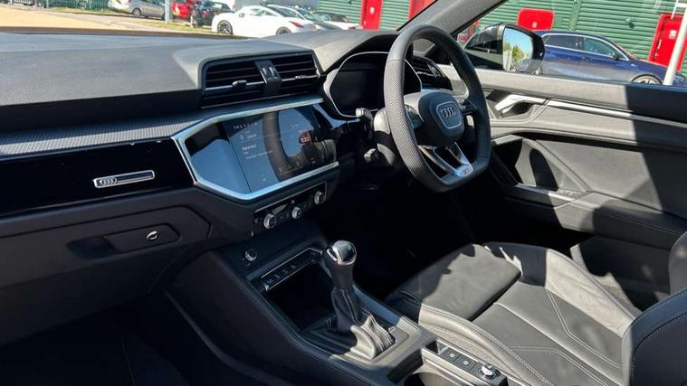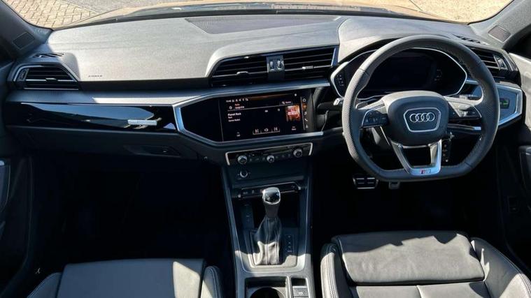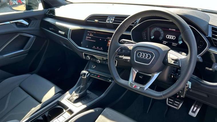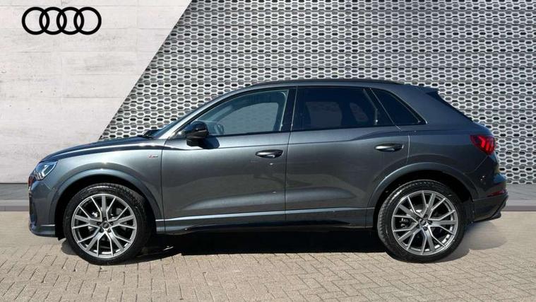 Amazon alexa Integration, Audi connect safety and service, Audi drive select, Audi lane departure warning, Audi Virtual Cockpit - 10.25" display, Bluetooth interface, Camera based traffic sign recognition, Distraction and Fatigue warning, Legal emergency call, MMI Navigation Plus with high resolution 10.1 inch touchscreen colour display, Power operated tailgate, Progressive steering, Service interval indicator, Smartphone interface includes wireless Apple carplay/Android Auto, Start stop system with recuperation, Voice control system with natural language interaction, Sports suspension, 2 USB-C ports with charge and data functions, 6 passive loudspeakers, DAB digital radio module, Acoustic windscreen, Anthracite black radiator grille, Audi Beam uses LEDs to project the Audi logo onto the ground as you exit your Q3, Auto dimming door mirrors, Auto dimming frameless rear view mirror, Black roof rails, Electrically folding, adjustable and heated door mirrors with integrated LED side indicators and kerb view function for passenger side, Front and rear electric windows, Front fog lights, Grille vertical bars in aluminium silver/Matt, High gloss black finish B and C pillars, LED Dynamic rear indicators, LED headlights with LED daytime running lights, LED rear lights, LED third brake light, Privacy glass dark tinted rear and rear-side windows (from B-pillar backwards), Rain and light sensors, Rear diffuser grille in grained matt black, Rear diffuser strip in matt anthracite black, Rear side wing doors, Rear wiper, S line bumpers in contrasting Manhattan grey, Variable front intermittent wipers, 12V socket in rear centre console, 3 seat bench in 2nd row, 40:20:40 folding with manual adjustment for 60:40 forwards/backwards position and backrest angle, Adjustable rear seat bench/backrest with centre armrest and cupholder, Black carpet mats, Black cloth headlining, Dual zone electronic climate control, Electric lumbar support, Front and rear black floor mats with contrast stitching in rock grey, Front and rear headrests, Front centre armrest, Height and reach adjustable steering wheel, Illuminated door sill trims with S logo, ISOFIX child seat mounting for front passenger with airbag deactivation and outer rear seat including top tether attachment point for outer rear seats, Luggage compartment sill protection in stainless steel, Manual front seats with height adjustment, Perforated leather gearknob, Single front passenger seat, Stainless steel pedals, Twin leather upholstery with front sport seats + S embossing, Black styling pack - Q3, Non smoking pack - Q3, 3x3 point rear seatbelts, 6 airbags - Driver, front passenger, curtain and side windows, Audi pre-sense front with pedestrain and cyclist recognition, Electrically operated child locks on rear doors, Electromechanical parking brake, Electronic stabilisation control including ABS, ASR and EDL, Front seatbelt reminder, Hill descent control, Hill hold assist, Pre sense basic, Seatbelt monitoring, Tyre pressure warning, Warning triangle and first aid kit, Anti theft wheel bolts, Immobiliser, Remote central locking, Thatcham approved category 1 anti theft alarm, Aluminium look interior elements, Detail dashboard around MMI touch colour display in glass look, black with surround in aluminium look, Leatherette door armrest, Piano black inlay,