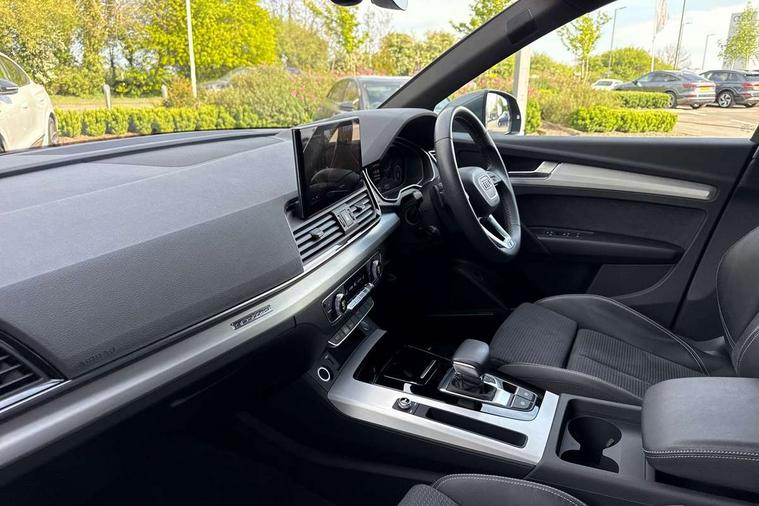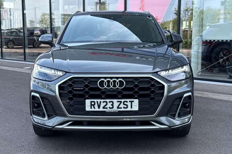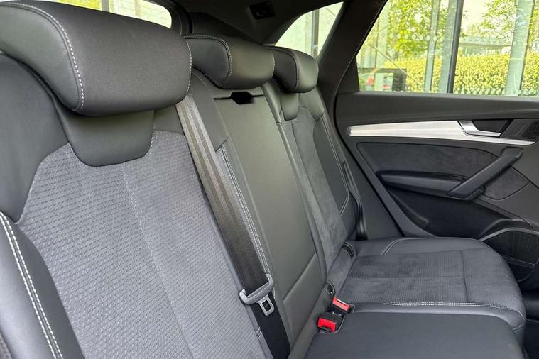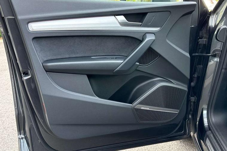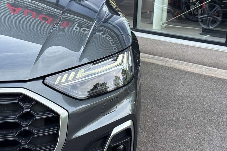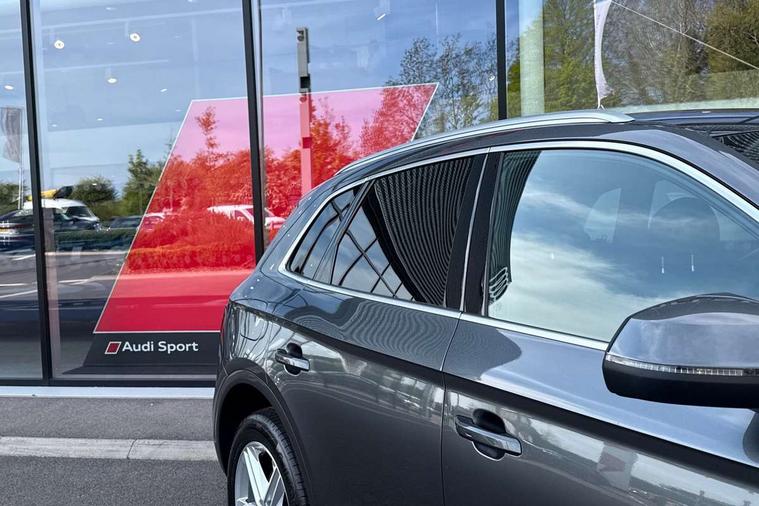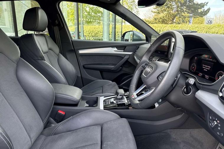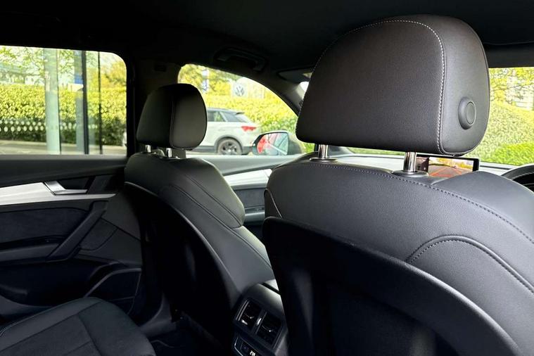Acoustic front and rear parking sensor, Audi connect safety and service (e-call), Audi connect with Amazon Alexa Integration, Audi drive select, Audi virtual cockpit plus with 12.3" screen and three different layout designs, Audi wireless smartphone interface, Automatic start-stop system with coasting functionality and efficiency programme, Bluetooth interface, Electro - mechanical power assisted steering, MMI navigation plus with 10.1" touch screen, Power tailgate, Reversing camera, Service interval indicator, Voice control system with Audi hotword activation "Hey Audi", Diesel particulate filter, Quattro on demand, S line sports suspension, 2 x USB charging port with aux input socket, 8 loudspeakers, DAB Digital radio, Acoustic windscreen, Aluminium roof rails, Audi matrix LED headlights with dynamic front and rear indicators, Auto dimming door mirrors, Auto dimming frameless rear view mirror, Automatic headlight adjustment, Automatic headlights and windscreen wipers, Body colour bumpers, Body colour door mirrors, Body colour rear diffuser with matt aluminium silver surrounds, Body colour underbody protection, Chrome plated exhaust trims, Daytime running lights, Door sills in Selenite silver, Electric adjustable/heated/folding door mirrors, Front air inlet surrounds in aluminium, Front and rear electric windows, Front radiator grille in honeycomb design, Headlight washers, High level LED brake light, Lower bumpers painted in contrast Manhattan grey, Rear chrome trim strip below lights, Rear privacy glass and rear side windows, Rear side wing doors, Rear wiper, Roof bars, S Line badges on the front wings, S Line front and rear bumpers, S Line rear spoiler, S Line side skirts, 3 rear headrests, 3 spoke leather multifunction steering wheel with S badging perforated leather grips, 40:20:40 split folding 3 rear bench seat in 2nd row with rear centre armrest, Black cloth headlining, Comfort front centre armrest, Contrast stitching on seats, steering wheel and gear lever gaiter, Deluxe 3 zone electronic climate control, Front/rear floor mats, Gear lever in black leather, Heated front seats, Height adjustable front head restraints, Height/reach adjustable steering column, Illuminated door sill trims with S logo, Luggage compartment cover, Manual seat adjustment with 4-way electric lumbar support, Removable luggage compartment floor, Single front passenger seat, Stainless steel pedals, Sunvisors with vanity mirrors, High gloss pack - Q5, LED interior light pack - Q5, 3 point seatbelts on all seats, 6 airbags - Driver, front passenger, curtain and side airbags, Electrically operated child locks on rear doors, Electromechanical parking brake, Electronic stabilisation control including ABS, ASR and EDL, First aid kit with warning triangle and vests, Front passenger airbag deactivation, Hill descent control, Hill hold assist, ISOFIX child seat mounting for front passenger seat and ISOFIX child seat mounting with Top Tether for outer rear seats, Multi collision brake assist, Pop-up bonnet for pedestrian protection, Pre sense city, Seat belt force limiter, Seatbelt monitoring, Tyre pressure warning, Anti theft alarm, Anti-theft wheel bolts, Keyless Go access/ignition system, Remote central locking, Air vents inserts and centre console in gloss black, Matt brushed aluminium inlays,